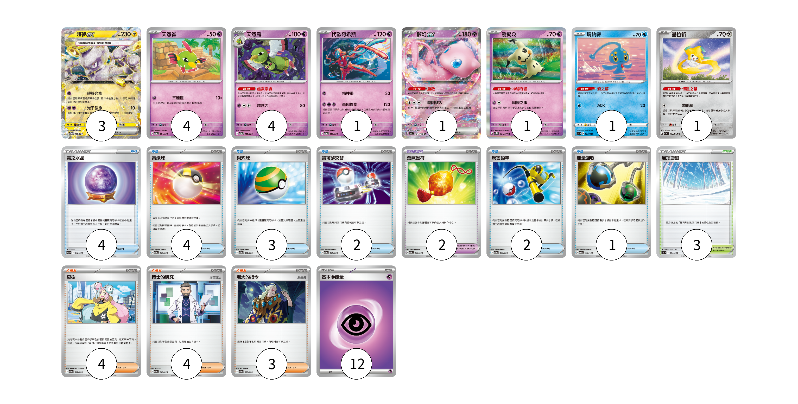 牌組構築方案 以此牌組為基礎新構築牌組 顯示卡面 顯示列表 寶可夢卡(16) 3 4 4 1 1 1 1 1 寶可夢道具(2) 2 物品卡(16) 4 4 3 2 2 1 支援者卡(11) 4 4 3 競技場卡(3) 3 能量卡(12) 12 寶可夢卡(16) 卡牌名稱 張數 卡牌名稱 張數 超夢ex SVEM 001/020 03 天然雀 SVEM 004/020 04 天然鳥 SVEM 005/020 04 代歐奇希斯 SVEM 006/020 01 夢幻ex SV2a 151/165 01 謎擬Q SV2P 034/071 01 瑪納霏 SVF 003/038 01 基拉祈 SV3a 042/062 01 寶可夢道具(2) 卡牌名稱 張數 卡牌名稱 張數 勇氣護符 SVEM 016/020 02 物品卡(16) 卡牌名稱 張數 卡牌名稱 張數 霧之水晶 SVEM 010/020 04 高級球 SVEM 013/020 04 巢穴球 SVEM 012/020 03 寶可夢交替 SVEM 015/020 02 厲害釣竿 SVEM 011/020 02 能量回收 SVD 110/139 01 支援者卡(11) 卡牌名稱 張數 卡牌名稱 張數 奇樹 SVEM 017/020 04 博士的研究 SVEM 019/020 04 老大的指令 SVEM 020/020 03 競技場卡(3) 卡牌名稱 張數 卡牌名稱 張數 通頂雪道 SVF 034/038 03 能量卡(12) 卡牌名稱 張數 卡牌名稱 張數 基本【超】能量 SVEM PSY 12 以此牌組為基礎新構築牌組 牌組編碼 svQgrt-xDqlyA-EEplxG copy 列印牌組單 牌組編碼已複製 分享至SNS