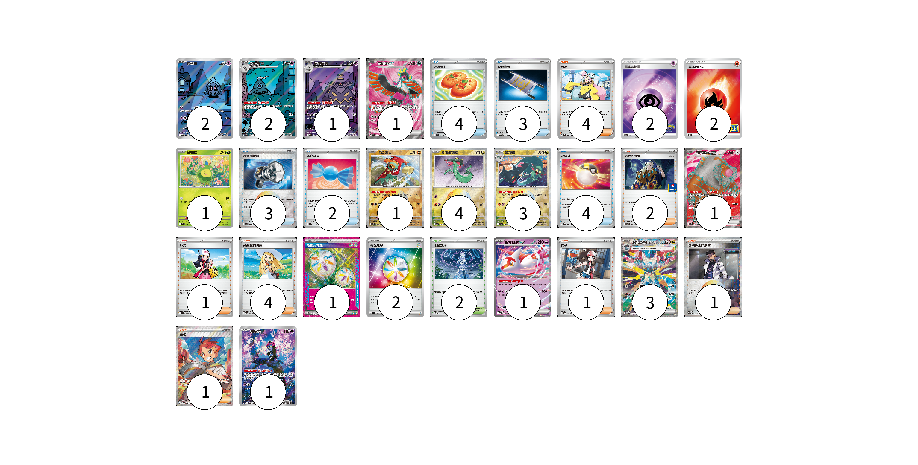 牌組構築方案 以此牌組為基礎新構築牌組 顯示卡面 顯示列表 寶可夢卡(21) 2 2 1 1 1 1 4 3 1 1 3 1 物品卡(16) 4 3 3 2 4 支援者卡(14) 4 2 1 4 1 1 1 競技場卡(2) 2 能量卡(7) 2 2 1 2 寶可夢卡(21) 卡牌名稱 張數 卡牌名稱 張數 夜巡靈 SV6a 068/064 02 彷徨夜靈 SV6a 069/064 02 黑夜魔靈 SV6a 070/064 01 吉雉雞ex SV6a 081/064 01 含羞苞 SV8a 001/187 01 摔角鷹人 SV8a 084/187 01 多龍梅西亞 SV8a 118/187 04 多龍奇 SV8a 119/187 03 月月熊 赫月 ex SV5a 084/066 01 拉帝亞斯ex MBD 003/022 01 多龍巴魯托ex SV8a 221/187 03 願增猿 SV6 107/101 01 物品卡(16) 卡牌名稱 張數 卡牌名稱 張數 好友寶芬 SV5K 063/071 04 夜間擔架 SV6a 056/064 03 反擊捕捉器 SV8a 139/187 03 神奇糖果 SVM 135/175 02 高級球 SVM 134/175 04 支援者卡(14) 卡牌名稱 張數 卡牌名稱 張數 奇樹 SV2D 069/071 04 老大的指令 SV-P 178/SV-P 02 小光 M2 077/080 01 莉莉艾的決意 MBD 021/022 04 鬥子 SV11W 085/086 01 弗圖博士的劇本 SV8a 175/187 01 赤松 SV7 123/102 01 競技場卡(2) 卡牌名稱 張數 卡牌名稱 張數 阻礙之塔 SV6 100/101 02 能量卡(7) 卡牌名稱 張數 卡牌名稱 張數 基本超能量 S10b PSY 02 基本火能量 S8a FIR 02 新衝天能量 SV5K 071/071 01 夜光能量 SV1a 073/073 02 以此牌組為基礎新構築牌組 牌組編碼 sveNHV-INUTQT-wesfAI copy 列印牌組單 牌組編碼已複製 分享至SNS