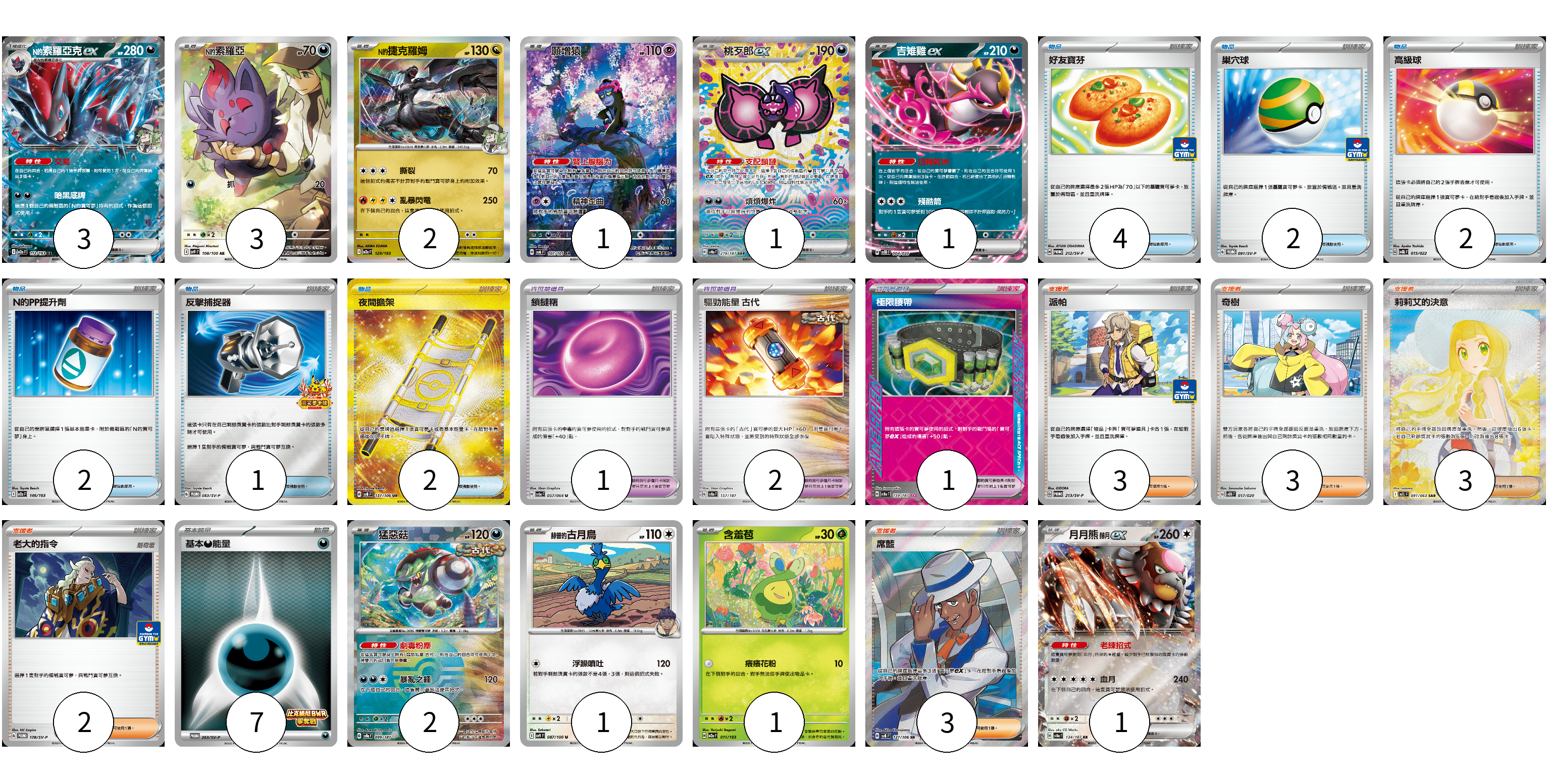 牌組構築方案 以此牌組為基礎新構築牌組 顯示卡面 顯示列表 寶可夢卡(16) 3 3 2 1 1 1 2 1 1 1 寶可夢道具(4) 1 2 1 物品卡(13) 4 2 2 2 1 2 支援者卡(14) 3 3 3 2 3 能量卡(7) 7 寶可夢卡(16) 卡牌名稱 張數 卡牌名稱 張數 N的索羅亞克ex M2a 112/193 03 N的索羅亞 SV9 108/100 03 N的捷克羅姆 M2a 129/193 02 願增猿 SV6 107/101 01 桃歹郎ex SV8a 219/187 01 吉雉雞ex SVOD 004/020 01 猛惡菇 SV8a 099/187 02 赫普的古月鳥 SV9 087/100 01 含羞苞 M2a 011/193 01 月月熊 赫月ex SV8a 134/187 01 寶可夢道具(4) 卡牌名稱 張數 卡牌名稱 張數 鎖鏈糬 SV6a 057/064 01 驅勁能量 古代 SV8a 157/187 02 極限腰帶 SV8a 159/187 01 物品卡(13) 卡牌名稱 張數 卡牌名稱 張數 好友寶芬 SV-P 212/SV-P 04 巢穴球 SV-P 091/SV-P 02 高級球 SVQL 015/022 02 N的PP提升劑 M2a 146/193 02 反擊捕捉器 SV-P 083/SV-P 01 夜間擔架 SV8 137/106 02 支援者卡(14) 卡牌名稱 張數 卡牌名稱 張數 派帕 SV-P 213/SV-P 03 奇樹 SVEM 017/020 03 莉莉艾的決意 M1L 091/063 03 老大的指令 SV-P 178/SV-P 02 席藍 SV8 127/106 03 能量卡(7) 卡牌名稱 張數 卡牌名稱 張數 基本【惡】能量 SV-P 263/SV-P 07 以此牌組為基礎新構築牌組 牌組編碼 sycUKa-bnUjAM-HArCoI copy 列印牌組單 牌組編碼已複製 分享至SNS