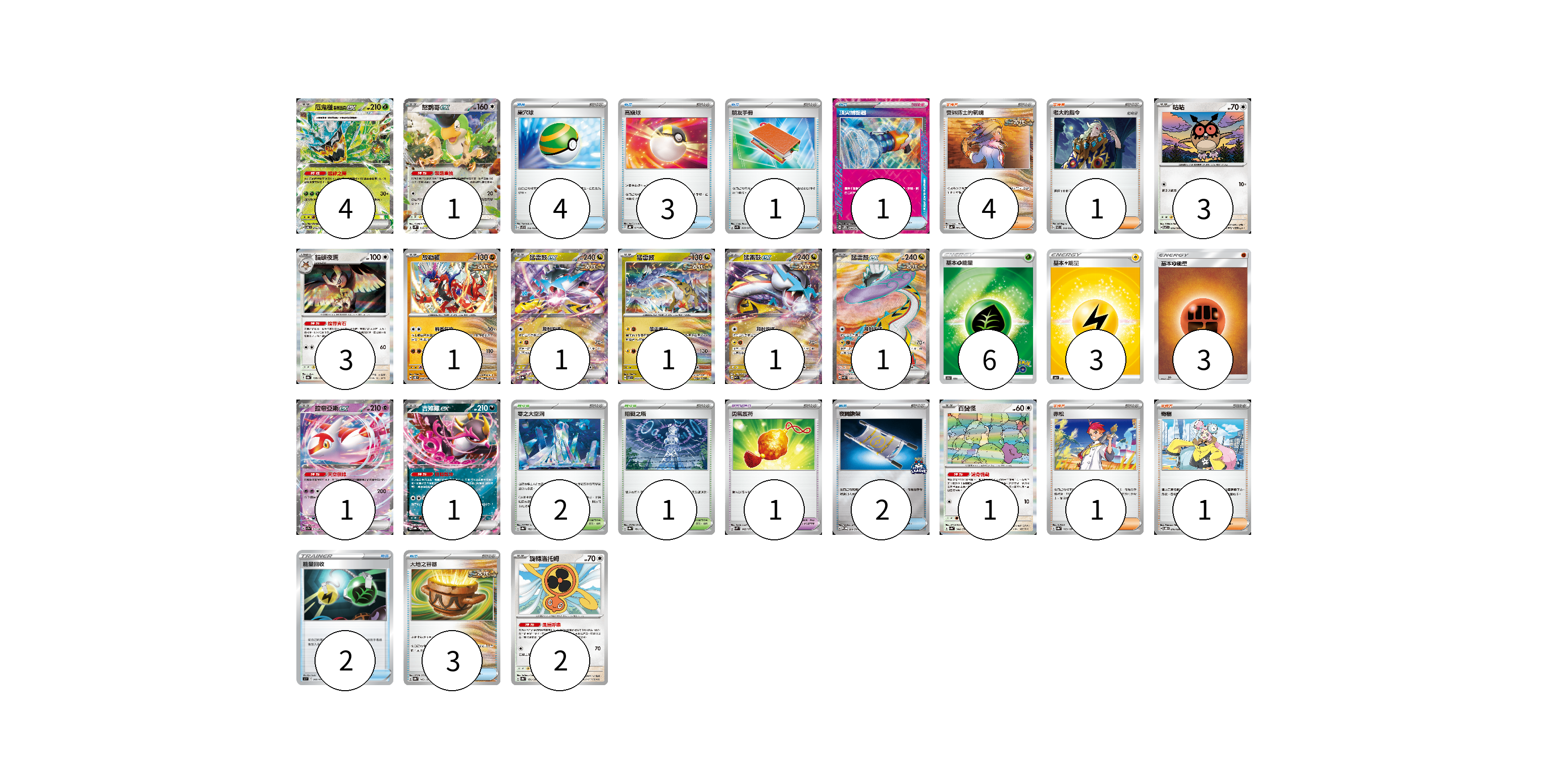 牌組構築方案 以此牌組為基礎新構築牌組 顯示卡面 顯示列表 寶可夢卡(21) 4 1 3 3 1 1 1 1 1 1 1 1 2 寶可夢道具(1) 1 物品卡(16) 4 3 1 1 2 2 3 支援者卡(7) 4 1 1 1 競技場卡(3) 2 1 能量卡(12) 6 3 3 寶可夢卡(21) 卡牌名稱 張數 卡牌名稱 張數 厄鬼椪 碧草面具ex SV6 016/101 04 怒鸚哥ex SV2P 065/071 01 咕咕 SV7 076/102 03 貓頭夜鷹 SV8a 128/187 03 故勒頓 SV8 069/106 01 猛雷鼓ex SV8a 124/187 01 猛雷鼓 SV7 075/102 01 猛雷鼓ex SV5K 053/071 01 猛雷鼓ex SV5K 089/071 01 拉帝亞斯ex SV7a 019/064 01 吉雉雞ex SV8a 104/187 01 百變怪 SV4a 144/190 01 旋轉洛托姆 SV8a 131/187 02 寶可夢道具(1) 卡牌名稱 張數 卡牌名稱 張數 勇氣護符 SVM 142/175 01 物品卡(16) 卡牌名稱 張數 卡牌名稱 張數 巢穴球 SVF 016/038 04 高級球 SVHK 013/022 03 朋友手冊 SV1S 069/078 01 頂尖捕捉器 SV5M 062/071 01 夜間擔架 SV-P 204/SV-P 02 能量回收 SI 365/414 02 大地之容器 SV8a 143/187 03 支援者卡(7) 卡牌名稱 張數 卡牌名稱 張數 奧琳博士的氣魄 SV4K 064/066 04 老大的指令 SVEL 019/020 01 赤松 SV8a 163/187 01 奇樹 SVOD 016/020 01 競技場卡(3) 卡牌名稱 張數 卡牌名稱 張數 零之大空洞 SV8a 182/187 02 阻礙之塔 SV8a 181/187 01 能量卡(12) 卡牌名稱 張數 卡牌名稱 張數 基本草能量 S10b GRA 06 基本雷能量 SN LIG 03 基本鬥能量 AS6D FIG 03 以此牌組為基礎新構築牌組 牌組編碼 szuyLJ-tCqfMT-GqfoKp copy 列印牌組單 牌組編碼已複製 分享至SNS