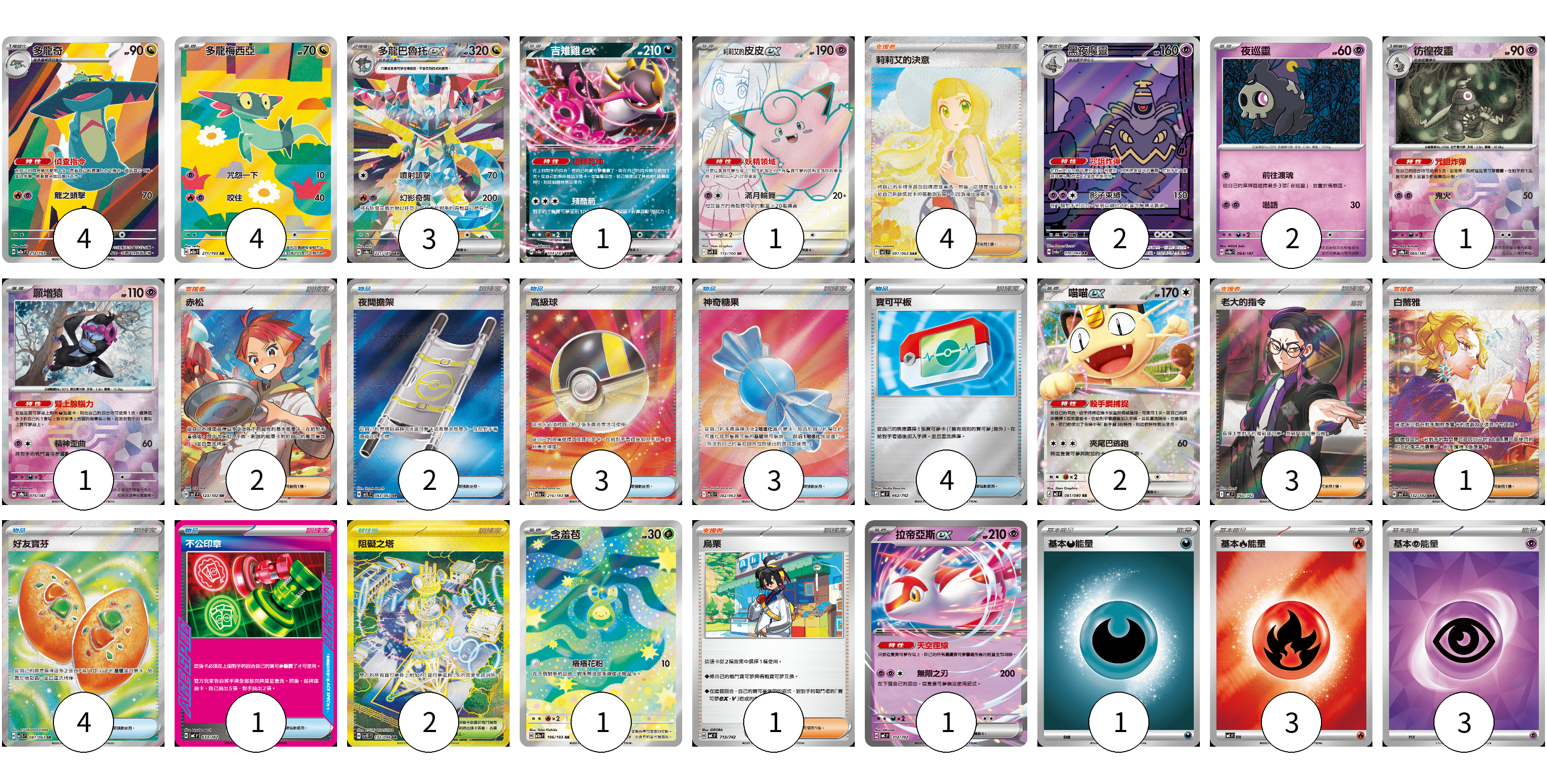 牌組構築方案 以此牌組為基礎新構築牌組 顯示卡面 顯示列表 寶可夢卡(23) 4 4 3 1 1 2 2 1 1 2 1 1 物品卡(17) 2 3 3 4 4 1 支援者卡(11) 4 2 3 1 1 競技場卡(2) 2 能量卡(7) 1 3 3 寶可夢卡(23) 卡牌名稱 張數 卡牌名稱 張數 多龍奇 M2a 212/193 04 多龍梅西亞 M2a 211/193 04 多龍巴魯托ex SV8a 221/187 03 吉雉雞ex SV8a 104/187 01 莉莉艾的皮皮ex SV9 115/100 01 黑夜魔靈 SV6a 070/064 02 夜巡靈 SV8a 064/187 02 彷徨夜靈 SV8a 065/187 01 願增猿 SV8a 075/187 01 喵喵ex M3 061/080 02 含羞苞 M2a 196/193 01 拉帝亞斯ex MC 312/742 01 物品卡(17) 卡牌名稱 張數 卡牌名稱 張數 夜間擔架 M1L 083/063 02 高級球 M2a 216/193 03 神奇糖果 M1S 082/063 03 寶可平板 MC 662/742 04 好友寶芬 M1S 081/063 04 不公印章 MC 633/742 01 支援者卡(11) 卡牌名稱 張數 卡牌名稱 張數 莉莉艾的決意 M1L 091/063 04 赤松 SV7 123/102 02 老大的指令(烏羽) MC 760/742 03 白蕾雅 SV7 132/102 01 烏栗 MC 713/742 01 競技場卡(2) 卡牌名稱 張數 卡牌名稱 張數 阻礙之塔 SV10 132/098 02 能量卡(7) 卡牌名稱 張數 卡牌名稱 張數 基本【惡】能量 MC DAR 01 基本【火】能量 MC FIR 03 基本【超】能量 SVOD PSY 03 以此牌組為基礎新構築牌組 牌組編碼 tAlLYt-dffGTo-iqiTLI copy 列印牌組單 牌組編碼已複製 分享至SNS
