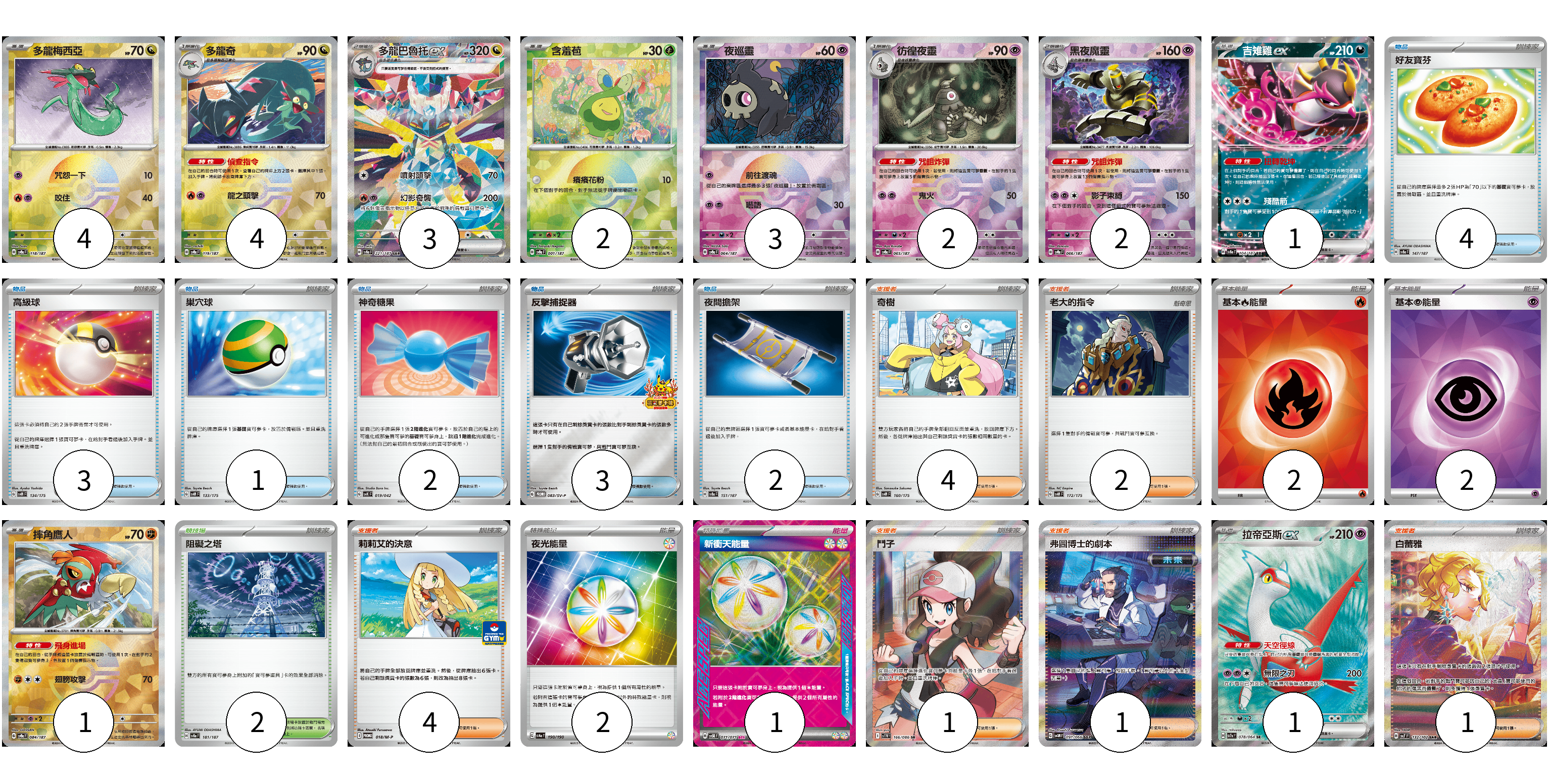 牌組構築方案 以此牌組為基礎新構築牌組 顯示卡面 顯示列表 寶可夢卡(23) 4 4 3 2 3 2 2 1 1 1 物品卡(15) 4 3 1 2 3 2 支援者卡(13) 4 2 4 1 1 1 競技場卡(2) 2 能量卡(7) 2 2 2 1 寶可夢卡(23) 卡牌名稱 張數 卡牌名稱 張數 多龍梅西亞 SV8a 118/187 04 多龍奇 SV8a 119/187 04 多龍巴魯托ex SV8a 221/187 03 含羞苞 SV8a 001/187 02 夜巡靈 SV8a 064/187 03 彷徨夜靈 SV8a 065/187 02 黑夜魔靈 SV8a 066/187 02 吉雉雞ex SV8a 104/187 01 摔角鷹人 SV8a 084/187 01 拉帝亞斯ex SV7a 078/064 01 物品卡(15) 卡牌名稱 張數 卡牌名稱 張數 好友寶芬 SV8a 147/187 04 高級球 SVM 134/175 03 巢穴球 SVM 133/175 01 神奇糖果 SVK 019/042 02 反擊捕捉器 SV-P 083/SV-P 03 夜間擔架 SV8a 151/187 02 支援者卡(13) 卡牌名稱 張數 卡牌名稱 張數 奇樹 SVM 160/175 04 老大的指令 SVM 172/175 02 莉莉艾的決意 M-P 018/M-P 04 鬥子 SV11W 166/086 01 弗圖博士的劇本 SV4M 091/066 01 白蕾雅 SV7 132/102 01 競技場卡(2) 卡牌名稱 張數 卡牌名稱 張數 阻礙之塔 SV8a 181/187 02 能量卡(7) 卡牌名稱 張數 卡牌名稱 張數 基本【火】能量 SVK FIR 02 基本【超】能量 SVK PSY 02 夜光能量 SV4a 190/190 02 新衝天能量 SV5K 071/071 01 以此牌組為基礎新構築牌組 牌組編碼 tAuWNj-ORzTIL-cEqLlC copy 列印牌組單 牌組編碼已複製 分享至SNS