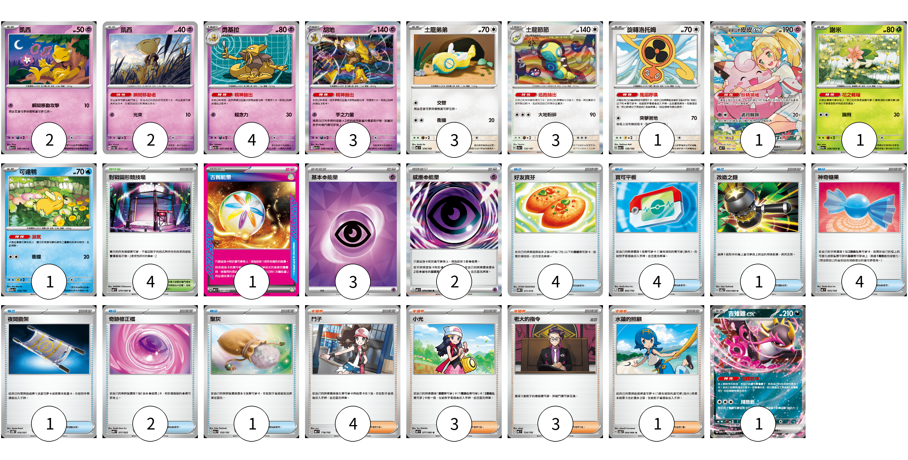 牌組構築方案 以此牌組為基礎新構築牌組 顯示卡面 顯示列表 寶可夢卡(22) 2 2 4 3 3 3 1 1 1 1 1 物品卡(17) 4 4 1 4 1 2 1 支援者卡(11) 4 3 3 1 競技場卡(4) 4 能量卡(6) 1 3 2 寶可夢卡(22) 卡牌名稱 張數 卡牌名稱 張數 凱西 M1S 036/063 02 凱西 SV8a 057/187 02 勇基拉 M1S 037/063 04 胡地 M1S 038/063 03 土龍弟弟 MC 574/742 03 土龍節節 SV8a 130/187 03 旋轉洛托姆 M2a 139/193 01 莉莉艾的皮皮ex MC 765/742 01 謝米 SV9a 006/063 01 可達鴨 M2a 032/193 01 吉雉雞ex M2a 114/193 01 物品卡(17) 卡牌名稱 張數 卡牌名稱 張數 好友寶芬 SVTG 011/019 04 寶可平板 MC 662/742 04 改造之錘 SV5a 054/066 01 神奇糖果 MC 655/742 04 夜間擔架 SVOM 016/021 01 奇跡修正檔 MBD 017/022 02 聖灰 M2a 150/193 01 支援者卡(11) 卡牌名稱 張數 卡牌名稱 張數 鬥子 MC 718/742 04 小光 M2 077/080 03 老大的指令 MC 724/742 03 水蓮的照顧 SV5a 064/066 01 競技場卡(4) 卡牌名稱 張數 卡牌名稱 張數 對戰圓形競技場 M2 079/080 04 能量卡(6) 卡牌名稱 張數 卡牌名稱 張數 古舊能量 MC 741/742 01 基本【超】能量 SVM PSY 03 感應【超】能量 M3 079/080 02 以此牌組為基礎新構築牌組 牌組編碼 tBvlPz-vrDECP-Kkkelg copy 列印牌組單 牌組編碼已複製 分享至SNS