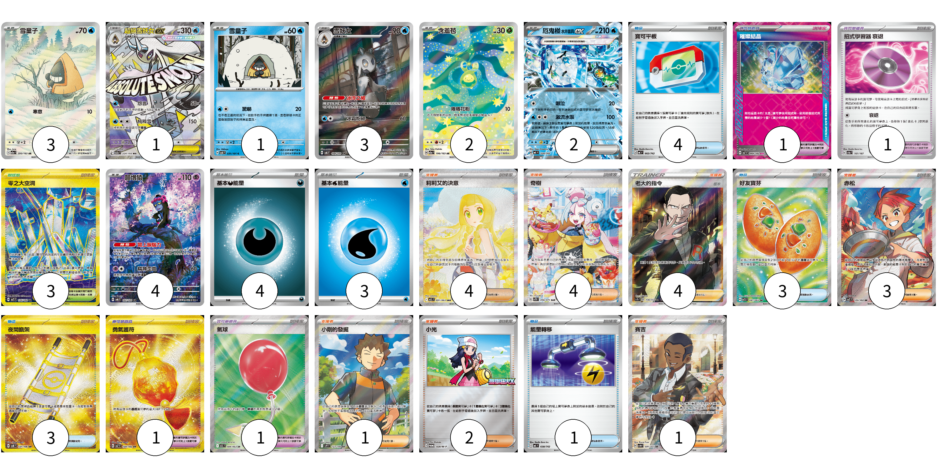 牌組構築方案 以此牌組為基礎新構築牌組 顯示卡面 顯示列表 寶可夢卡(16) 3 1 1 3 2 2 4 寶可夢道具(4) 1 1 1 1 物品卡(11) 4 3 3 1 支援者卡(19) 4 4 4 3 1 2 1 競技場卡(3) 3 能量卡(7) 4 3 寶可夢卡(16) 卡牌名稱 張數 卡牌名稱 張數 雪童子 M2a 200/193 03 超級雪妖女ex M2a 224/193 01 雪童子 SV6 031/101 01 雪妖女 SV6 104/101 03 含羞苞 M2a 196/193 02 厄鬼椪 水井面具ex MC 224/742 02 願增猿 SV6 107/101 04 寶可夢道具(4) 卡牌名稱 張數 卡牌名稱 張數 璀璨結晶 SV7 094/102 01 招式學習器 衰退 SV8a 161/187 01 勇氣護符 SV7 134/102 01 氣球 M1L 084/063 01 物品卡(11) 卡牌名稱 張數 卡牌名稱 張數 寶可平板 MC 662/742 04 好友寶芬 M1S 081/063 03 夜間擔架 SV8 137/106 03 能量轉移 MC 638/742 01 支援者卡(19) 卡牌名稱 張數 卡牌名稱 張數 莉莉艾的決意 M1L 091/063 04 奇樹 SV2D 096/071 04 老大的指令(坂木) SC1b 170/153 04 赤松 SV7 123/102 03 小剛的發掘 SV9 123/100 01 小光 M-P 028/M-P 02 賽吉 SV5M 091/071 01 競技場卡(3) 卡牌名稱 張數 卡牌名稱 張數 零之大空洞 SV7 135/102 03 能量卡(7) 卡牌名稱 張數 卡牌名稱 張數 基本【惡】能量 MBG DAR 04 基本【水】能量 MC WAT 03 以此牌組為基礎新構築牌組 牌組編碼 tEKMGq-eshCTY-NFSoOY copy 列印牌組單 牌組編碼已複製 分享至SNS