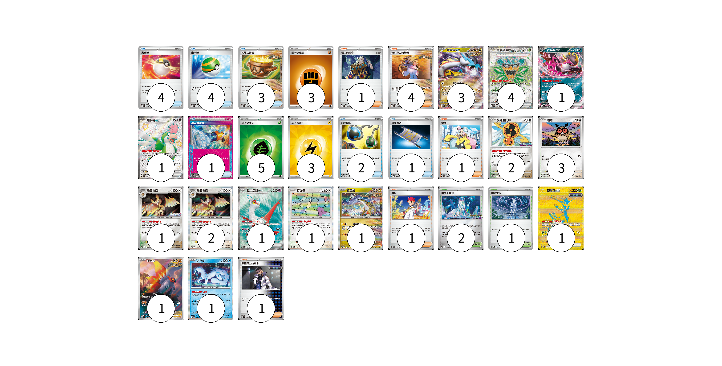 牌組構築方案 以此牌組為基礎新構築牌組 顯示卡面 顯示列表 寶可夢卡(23) 3 4 1 1 2 3 1 2 1 1 1 1 1 1 物品卡(15) 4 4 3 1 2 1 支援者卡(8) 1 4 1 1 1 競技場卡(3) 2 1 能量卡(11) 3 5 3 寶可夢卡(23) 卡牌名稱 張數 卡牌名稱 張數 猛雷鼓ex SV5K 053/071 03 厄鬼椪 碧草面具ex SV6 114/101 04 吉雉雞ex SV6a 038/064 01 怒鸚哥ex SV4a 337/190 01 旋轉洛托姆 SV-P 146/SV-P 02 咕咕 SV7 076/102 03 貓頭夜鷹 SV-P 145/SV-P 01 貓頭夜鷹 SV7 077/102 02 拉帝亞斯ex SV7a 078/064 01 百變怪 SV4a 144/190 01 猛雷鼓 SV7 075/102 01 鐵斑葉ex SV8a 233/187 01 爬地翅 SV4K 074/066 01 古劍豹 SV8 032/106 01 物品卡(15) 卡牌名稱 張數 卡牌名稱 張數 高級球 SVHK 013/022 04 巢穴球 SVHK 012/022 04 大地之容器 SVHK 011/022 03 頂尖捕捉器 SV5M 062/071 01 能量回收 SVTM 009/022 02 夜間擔架 SV6a 056/064 01 支援者卡(8) 卡牌名稱 張數 卡牌名稱 張數 老大的指令 SVHK 022/022 01 奧琳博士的氣魄 SVHK 017/022 04 奇樹 SVK 031/042 01 赤松 SVK 027/042 01 弗圖博士的劇本 SVK 034/042 01 競技場卡(3) 卡牌名稱 張數 卡牌名稱 張數 零之大空洞 SV-P 151/SV-P 02 阻礙之塔 SV8a 181/187 01 能量卡(11) 卡牌名稱 張數 卡牌名稱 張數 基本【鬥】能量 SVHK FIG 03 基本【草】能量 SVK GRA 05 基本【雷】能量 SVK LIG 03 以此牌組為基礎新構築牌組 牌組編碼 tESxnM-vBdVtR-FCbxwm copy 列印牌組單 牌組編碼已複製 分享至SNS
