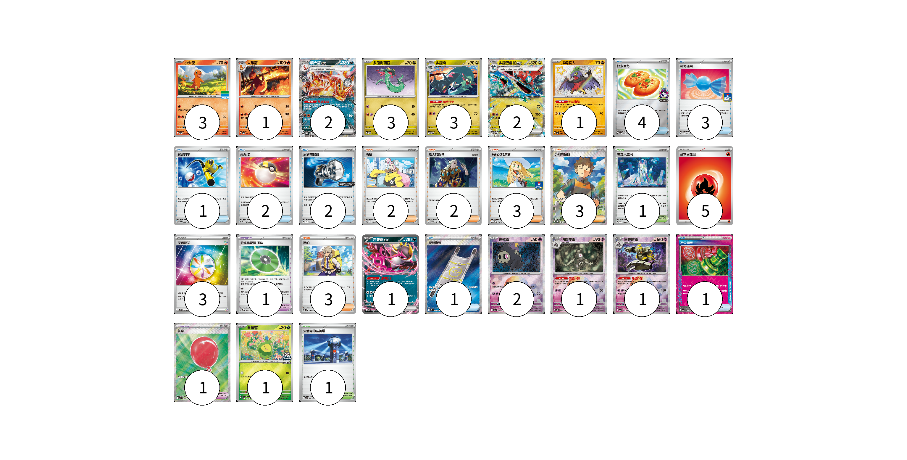牌組構築方案 以此牌組為基礎新構築牌組 顯示卡面 顯示列表 寶可夢卡(21) 3 1 2 3 3 2 1 1 2 1 1 1 寶可夢道具(2) 1 1 物品卡(14) 4 3 1 2 2 1 1 支援者卡(13) 2 2 3 3 3 競技場卡(2) 1 1 能量卡(8) 5 3 寶可夢卡(21) 卡牌名稱 張數 卡牌名稱 張數 小火龍 SV-P 232/SV-P 03 火恐龍 SVQL 002/022 01 噴火龍ex SVTL 006/021 02 多龍梅西亞 SV6 079/101 03 多龍奇 SV6 080/101 03 多龍巴魯托ex SV6 081/101 02 摔角鷹人 SV4a 282/190 01 吉雉雞ex SVOM 009/021 01 夜巡靈 SV8a 064/187 02 彷徨夜靈 SV8a 065/187 01 黑夜魔靈 SV8a 066/187 01 含羞苞 M-P 037/M-P 01 寶可夢道具(2) 卡牌名稱 張數 卡牌名稱 張數 招式學習器 演進 SVK 025/042 01 氣球 M1L 084/063 01 物品卡(14) 卡牌名稱 張數 卡牌名稱 張數 好友寶芬 SV-P 230/SV-P 04 神奇糖果 SV-P 104/SV-P 03 厲害釣竿 SVTH 008/018 01 高級球 SVTL 012/021 02 反擊捕捉器 SV-P 136/SV-P 02 夜間擔架 M1L 083/063 01 不公印章 SV5a 053/066 01 支援者卡(13) 卡牌名稱 張數 卡牌名稱 張數 奇樹 SVTM 017/022 02 老大的指令 SVTG 019/019 02 莉莉艾的決意 M-P 018/M-P 03 小剛的發掘 SV9 123/100 03 派帕 SV4a 180/190 03 競技場卡(2) 卡牌名稱 張數 卡牌名稱 張數 零之大空洞 SV7 102/102 01 火箭隊的監視塔 SV10 096/098 01 能量卡(8) 卡牌名稱 張數 卡牌名稱 張數 基本火能量 sv-p FIR 05 夜光能量 SVK 042/042 03 以此牌組為基礎新構築牌組 牌組編碼 tGOgCL-PORTXt-PDhWbU copy 列印牌組單 牌組編碼已複製 分享至SNS