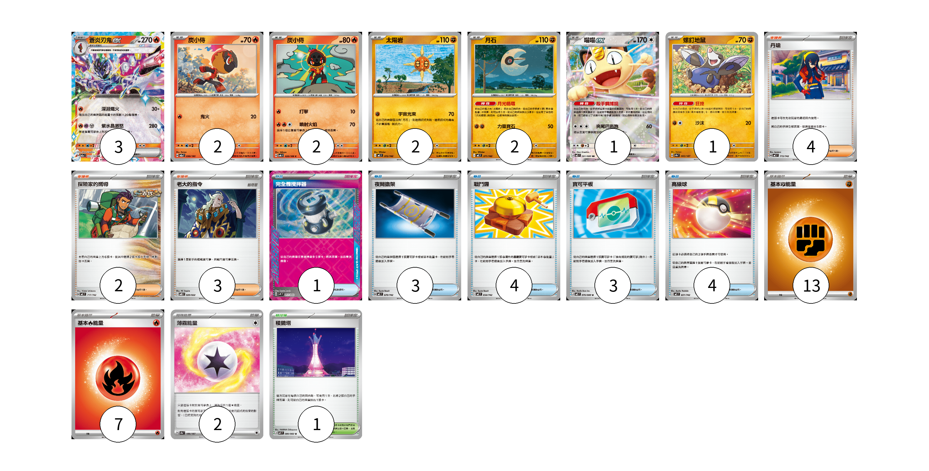牌組構築方案 以此牌組為基礎新構築牌組 顯示卡面 顯示列表 寶可夢卡(13) 3 2 2 2 2 1 1 物品卡(15) 1 3 4 3 4 支援者卡(9) 4 2 3 競技場卡(1) 1 能量卡(22) 13 7 2 寶可夢卡(13) 卡牌名稱 張數 卡牌名稱 張數 蒼炎刃鬼ex M2a 031/193 03 炭小侍 M2a 030/193 02 炭小侍 SV8 020/106 02 太陽岩 MC 372/742 02 月石 MC 371/742 02 喵喵ex M3 061/080 01 螺釘地鼠 SV8a 083/187 01 物品卡(15) 卡牌名稱 張數 卡牌名稱 張數 完全體攪拌器 SVK 017/042 01 夜間擔架 MC 670/742 03 戰鬥鑼 MC 654/742 04 寶可平板 M3 070/080 03 高級球 MC 651/742 04 支援者卡(9) 卡牌名稱 張數 卡牌名稱 張數 丹瑜 MC 715/742 04 探險家的嚮導 MC 717/742 02 老大的指令 MBD 020/022 03 競技場卡(1) 卡牌名稱 張數 卡牌名稱 張數 稜鏡塔 M4 080/083 01 能量卡(22) 卡牌名稱 張數 卡牌名稱 張數 基本【鬥】能量 MC FIG 13 基本【火】能量 MC FIR 07 薄霧能量 SV8a 186/187 02 以此牌組為基礎新構築牌組 牌組編碼 tHbmtZ-XXURhk-ntRXwj copy 列印牌組單 牌組編碼已複製 分享至SNS