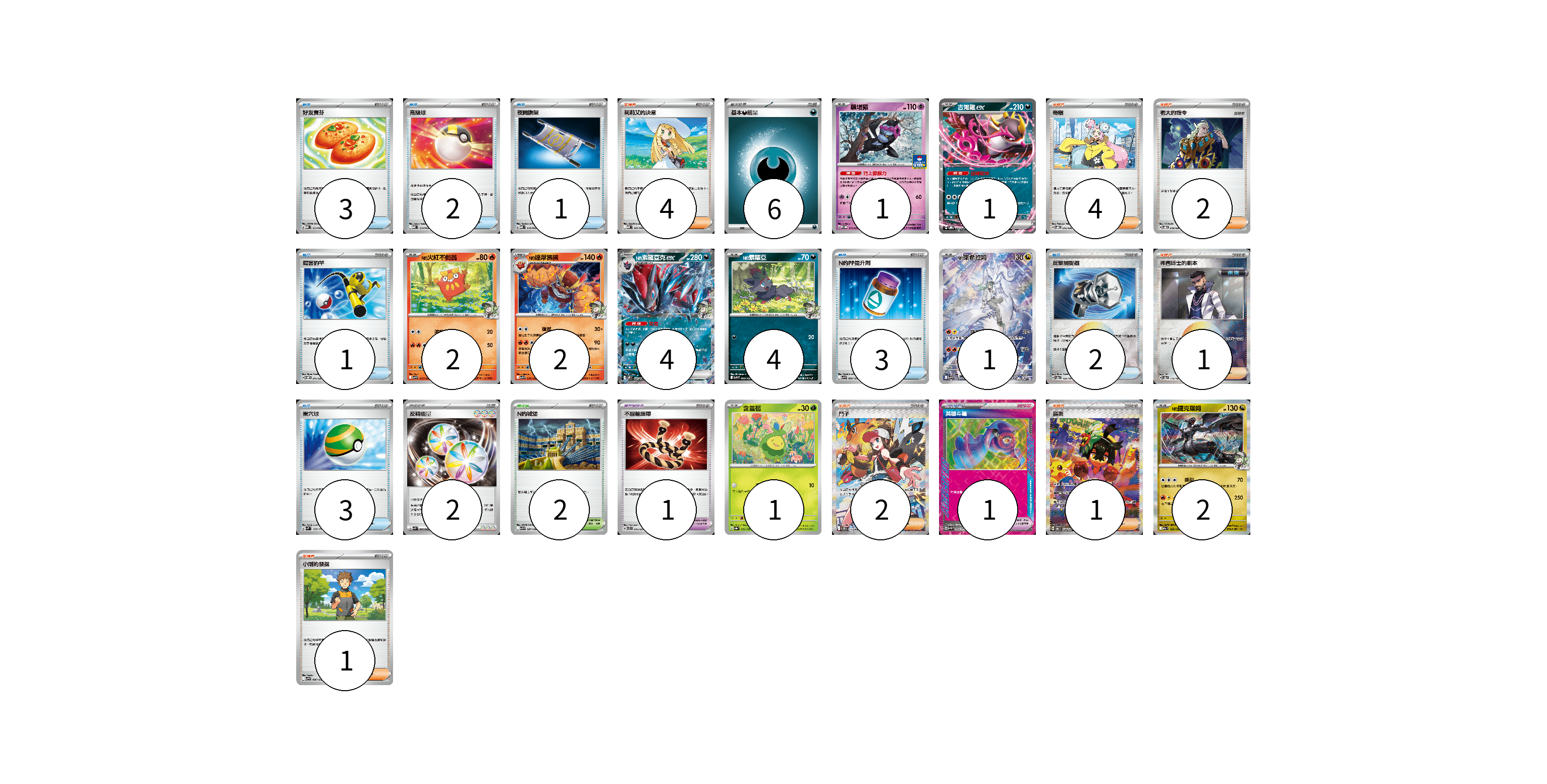牌組構築方案 以此牌組為基礎新構築牌組 顯示卡面 顯示列表 寶可夢卡(18) 1 1 2 2 4 4 1 1 2 寶可夢道具(2) 1 1 物品卡(15) 3 2 1 1 3 2 3 支援者卡(15) 4 4 2 1 2 1 1 競技場卡(2) 2 能量卡(8) 6 2 寶可夢卡(18) 卡牌名稱 張數 卡牌名稱 張數 願增猿 M-P 014/M-P 01 吉雉雞ex SVOD 004/020 01 N的火紅不倒翁 SV9 015/100 02 N的達摩狒狒 SV9 016/100 02 N的索羅亞克ex SV9 061/100 04 N的索羅亞 SV9 060/100 04 N的萊希拉姆 SV9 109/100 01 含羞苞 SV8a 001/187 01 N的捷克羅姆 M2a 129/193 02 寶可夢道具(2) 卡牌名稱 張數 卡牌名稱 張數 不服輸頭帶 SVTL 016/021 01 英雄斗篷 SV5M 064/071 01 物品卡(15) 卡牌名稱 張數 卡牌名稱 張數 好友寶芬 MBD 013/022 03 高級球 MBD 014/022 02 夜間擔架 MBD 016/022 01 厲害釣竿 SVOM 011/021 01 N的PP提升劑 SV9 089/100 03 反擊捕捉器 SV8a 139/187 02 巢穴球 SVM 133/175 03 支援者卡(15) 卡牌名稱 張數 卡牌名稱 張數 莉莉艾的決意 MBD 021/022 04 奇樹 SVOD 016/020 04 老大的指令 SVOD 019/020 02 弗圖博士的劇本 SV8a 175/187 01 鬥子 SV11W 173/086 02 烏栗 SV6 129/101 01 小剛的發掘 SV9 096/100 01 競技場卡(2) 卡牌名稱 張數 卡牌名稱 張數 N的城堡 SV9 097/100 02 能量卡(8) 卡牌名稱 張數 卡牌名稱 張數 基本【惡】能量 MBG DAR 06 反轉能量 SVK 041/042 02 以此牌組為基礎新構築牌組 牌組編碼 tIaBaj-JbryJu-ohyOqu copy 列印牌組單 牌組編碼已複製 分享至SNS