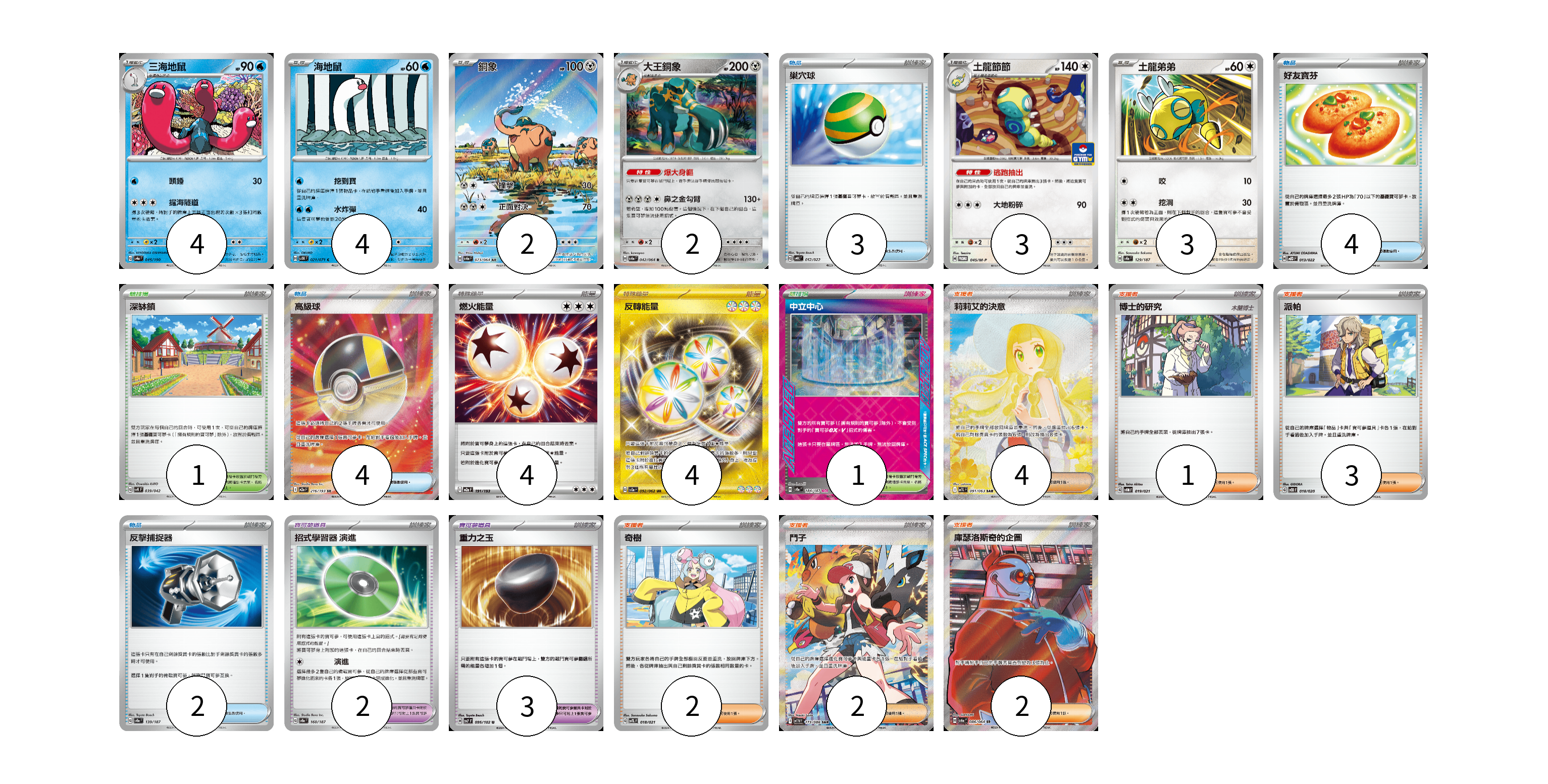 牌組構築方案 以此牌組為基礎新構築牌組 顯示卡面 顯示列表 寶可夢卡(18) 4 4 2 2 3 3 寶可夢道具(7) 2 3 2 物品卡(13) 3 4 4 2 支援者卡(12) 4 1 3 2 2 競技場卡(2) 1 1 能量卡(8) 4 4 寶可夢卡(18) 卡牌名稱 張數 卡牌名稱 張數 三海地鼠 SV4a 045/190 04 海地鼠 SV5K 021/071 04 銅象 SV6a 073/064 02 大王銅象 SV6a 042/064 02 土龍節節 M-P 045/M-P 03 土龍弟弟 SV8a 129/187 03 寶可夢道具(7) 卡牌名稱 張數 卡牌名稱 張數 招式學習器 演進 SV8a 160/187 02 重力之玉 SV7 095/102 03 奇樹 SVTL 018/021 02 物品卡(13) 卡牌名稱 張數 卡牌名稱 張數 巢穴球 SVHK 012/022 03 好友寶芬 MBD 013/022 04 高級球 M2a 216/193 04 反擊捕捉器 SV8a 139/187 02 支援者卡(12) 卡牌名稱 張數 卡牌名稱 張數 莉莉艾的決意 M1L 091/063 04 博士的研究 SVOM 019/021 01 派帕 SVOD 018/020 03 鬥子 SV11W 173/086 02 庫瑟洛斯奇的企圖 SV6a 086/064 02 競技場卡(2) 卡牌名稱 張數 卡牌名稱 張數 深缽鎮 SVK 039/042 01 中立中心 SV8a 184/187 01 能量卡(8) 卡牌名稱 張數 卡牌名稱 張數 燃火能量 M2a 191/193 04 反轉能量 SV3a 092/062 04 以此牌組為基礎新構築牌組 牌組編碼 tIxaEj-JUVURr-WeSUSZ copy 列印牌組單 牌組編碼已複製 分享至SNS