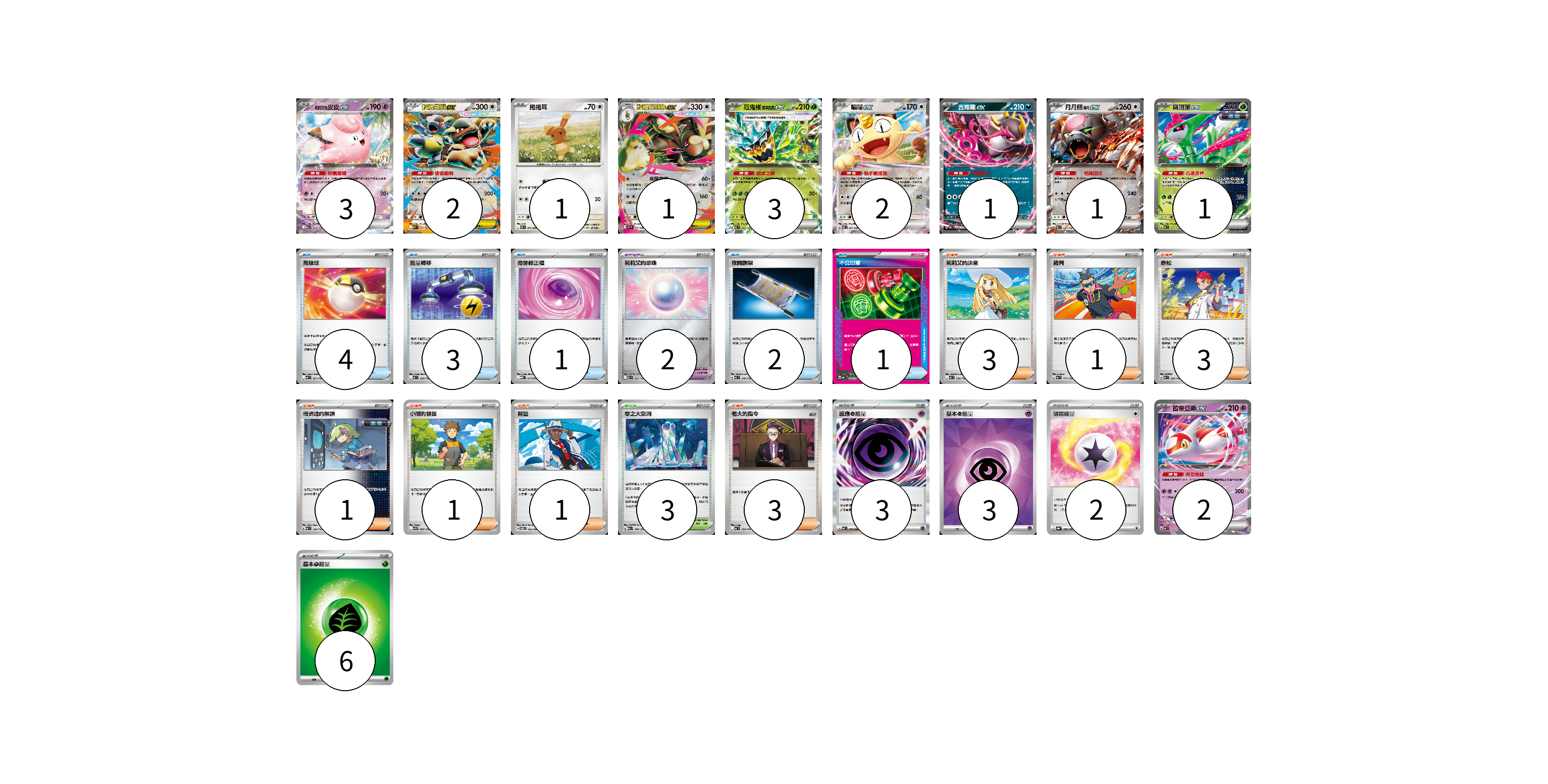 牌組構築方案 以此牌組為基礎新構築牌組 顯示卡面 顯示列表 寶可夢卡(17) 3 2 1 1 3 2 1 1 1 2 寶可夢道具(2) 2 物品卡(11) 4 3 1 2 1 支援者卡(13) 3 1 3 1 1 1 3 競技場卡(3) 3 能量卡(14) 3 3 2 6 寶可夢卡(17) 卡牌名稱 張數 卡牌名稱 張數 莉莉艾的皮皮ex M2a 060/193 03 超級袋獸ex M1S 051/063 02 捲捲耳 M2 071/080 01 超級長耳兔ex M2 072/080 01 厄鬼椪 碧草面具ex MC 082/742 03 喵喵ex M3 061/080 02 吉雉雞ex MC 489/742 01 月月熊 赫月 ex MC 625/742 01 鐵斑葉ex MC 077/742 01 拉帝亞斯ex MC 312/742 02 寶可夢道具(2) 卡牌名稱 張數 卡牌名稱 張數 莉莉艾的珍珠 MC 692/742 02 物品卡(11) 卡牌名稱 張數 卡牌名稱 張數 高級球 MC 651/742 04 能量轉移 MC 638/742 03 奇跡修正檔 MBD 017/022 01 夜間擔架 MC 670/742 02 不公印章 MC 633/742 01 支援者卡(13) 卡牌名稱 張數 卡牌名稱 張數 莉莉艾的決意 MC 729/742 03 裁判 MC 711/742 01 赤松 MC 696/742 03 暗碼迷的解讀 MC 698/742 01 小剛的發掘 SV9 096/100 01 席藍 SV8 102/106 01 老大的指令 MC 724/742 03 競技場卡(3) 卡牌名稱 張數 卡牌名稱 張數 零之大空洞 M2a 184/193 03 能量卡(14) 卡牌名稱 張數 卡牌名稱 張數 感應【超】能量 M3 079/080 03 基本【超】能量 SVOD PSY 03 薄霧能量 SV8a 186/187 02 基本【草】能量 MJ GRA 06 以此牌組為基礎新構築牌組 牌組編碼 tJlyme-JYnFGR-qZGboD copy 列印牌組單 牌組編碼已複製 分享至SNS