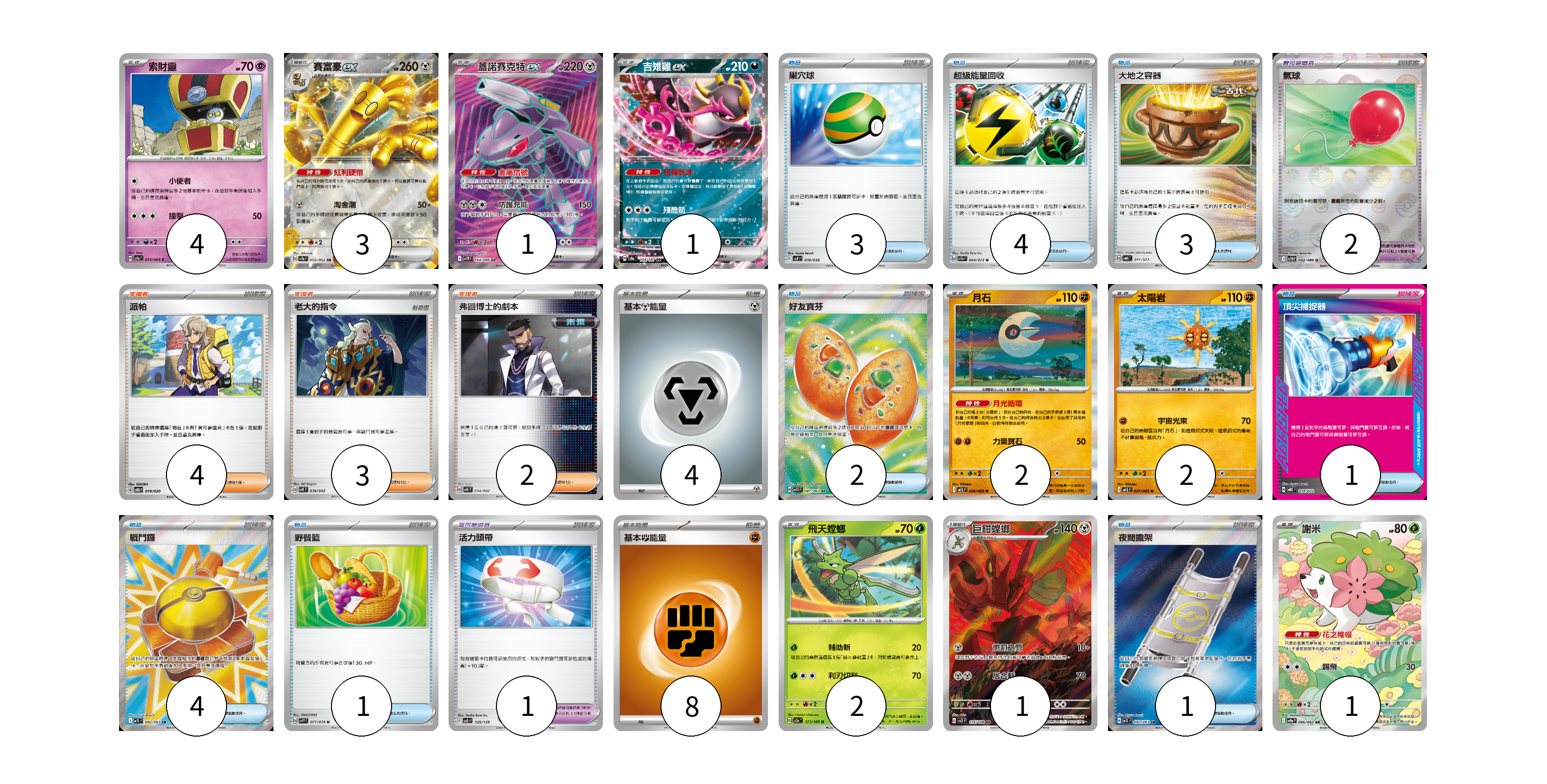 牌組構築方案 以此牌組為基礎新構築牌組 顯示卡面 顯示列表 寶可夢卡(17) 4 3 1 1 2 2 2 1 1 寶可夢道具(3) 2 1 物品卡(19) 3 4 3 2 1 4 1 1 支援者卡(9) 4 3 2 能量卡(12) 4 8 寶可夢卡(17) 卡牌名稱 張數 卡牌名稱 張數 索財靈 SV7a 024/064 04 賽富豪ex SV3a 050/062 03 蓋諾賽克特ex SV11B 164/086 01 吉雉雞ex SV8a 104/187 01 月石 M1L 026/063 02 太陽岩 M1L 027/063 02 飛天螳螂 SV2a 123/165 02 巨鉗螳螂 SV3 116/108 01 謝米 SV9a 066/063 01 寶可夢道具(3) 卡牌名稱 張數 卡牌名稱 張數 氣球 SV11B 082/086 02 活力頭帶 SVD 125/139 01 物品卡(19) 卡牌名稱 張數 卡牌名稱 張數 巢穴球 SVF 016/038 03 超級能量回收 SV1a 064/073 04 大地之容器 SVHK 011/022 03 好友寶芬 M1S 081/063 02 頂尖捕捉器 MBG 014/022 01 戰鬥鑼 M1L 082/063 04 野餐籃 SV1V 071/078 01 夜間擔架 M1L 083/063 01 支援者卡(9) 卡牌名稱 張數 卡牌名稱 張數 派帕 SVOD 018/020 04 老大的指令 SVK 036/042 03 弗圖博士的劇本 SVK 034/042 02 能量卡(12) 卡牌名稱 張數 卡牌名稱 張數 基本【鋼】能量 SVTH MET 04 基本鬥能量 sv-p FIG 08 以此牌組為基礎新構築牌組 牌組編碼 tKdQyy-IIBMcb-uWMxas copy 列印牌組單 牌組編碼已複製 分享至SNS
