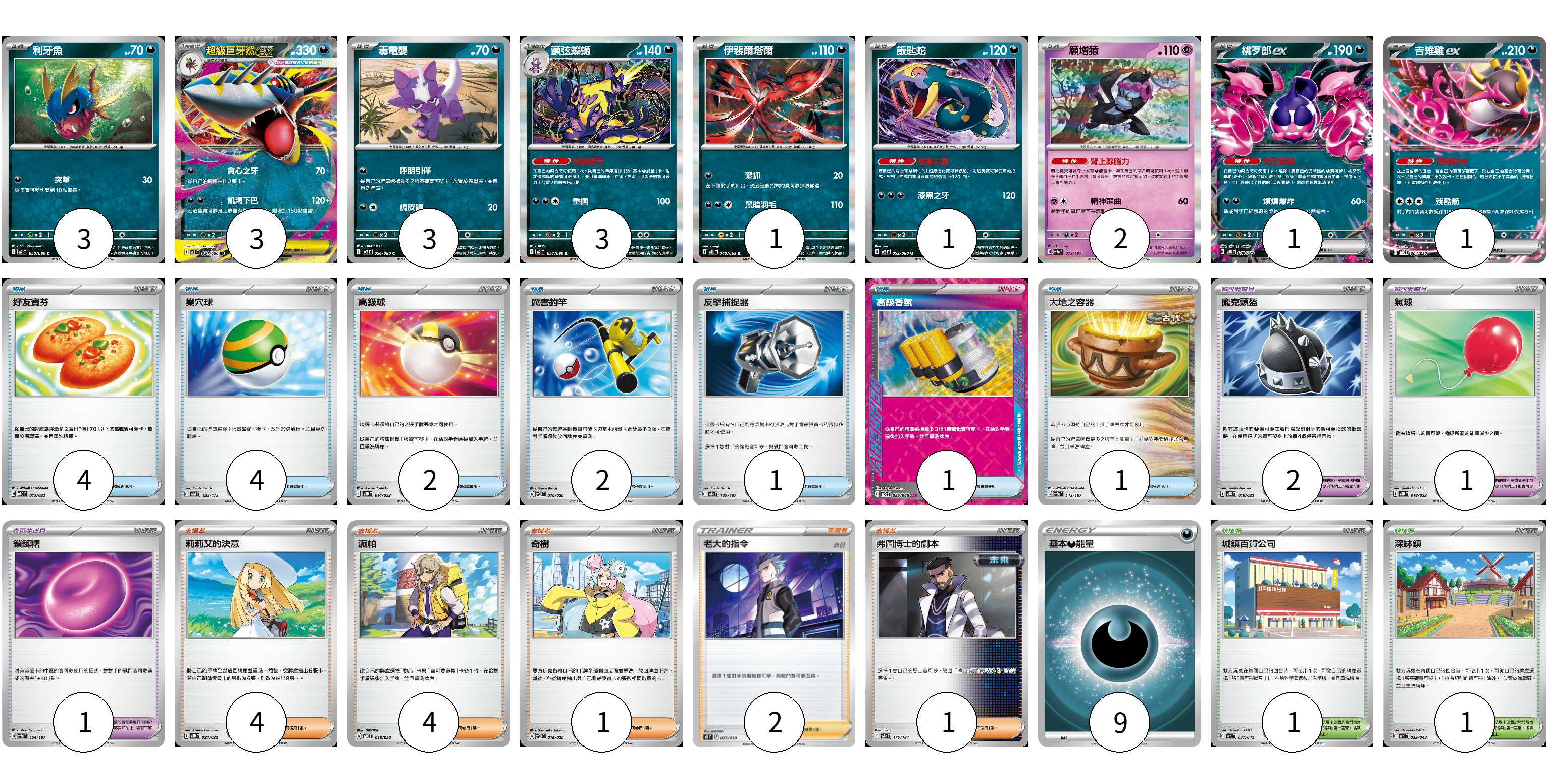 牌組構築方案 以此牌組為基礎新構築牌組 顯示卡面 顯示列表 寶可夢卡(18) 3 3 3 3 1 1 2 1 1 寶可夢道具(4) 2 1 1 物品卡(15) 4 4 2 2 1 1 1 支援者卡(12) 4 4 1 2 1 競技場卡(2) 1 1 能量卡(9) 9 寶可夢卡(18) 卡牌名稱 張數 卡牌名稱 張數 利牙魚 M2 050/080 03 超級巨牙鯊ex M2 051/080 03 毒電嬰 M2 056/080 03 顫弦蠑螈 M2 057/080 03 伊裴爾塔爾 M1L 040/063 01 飯匙蛇 M2 052/080 01 願增猿 SV8a 075/187 02 桃歹郎ex MBG 009/022 01 吉雉雞ex SVOD 004/020 01 寶可夢道具(4) 卡牌名稱 張數 卡牌名稱 張數 龐克頭盔 MBG 018/022 02 氣球 MBD 018/022 01 鎖鏈糬 SV8a 154/187 01 物品卡(15) 卡牌名稱 張數 卡牌名稱 張數 好友寶芬 MBD 013/022 04 巢穴球 SVM 133/175 04 高級球 MBD 014/022 02 厲害釣竿 SVOD 010/020 02 反擊捕捉器 SV8a 139/187 01 高級香氛 SV5a 055/066 01 大地之容器 SV8a 143/187 01 支援者卡(12) 卡牌名稱 張數 卡牌名稱 張數 莉莉艾的決意 MBD 021/022 04 派帕 SVOD 018/020 04 奇樹 SVOD 016/020 01 老大的指令(赤日) SK 025/030 02 弗圖博士的劇本 SV8a 175/187 01 競技場卡(2) 卡牌名稱 張數 卡牌名稱 張數 城鎮百貨公司 SVK 037/042 01 深缽鎮 SVK 039/042 01 能量卡(9) 卡牌名稱 張數 卡牌名稱 張數 基本惡能量 SLD DAR 09 以此牌組為基礎新構築牌組 牌組編碼 tKvKEW-nnKusY-nBfPOC copy 列印牌組單 牌組編碼已複製 分享至SNS
