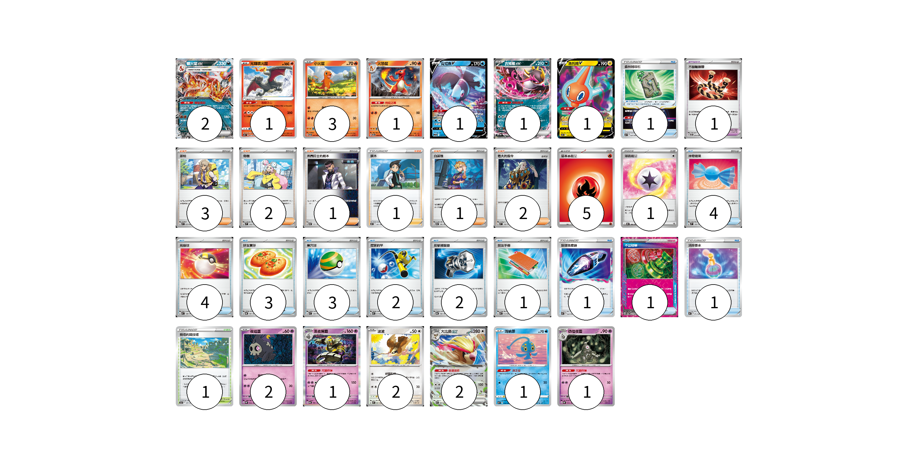 牌組構築方案 以此牌組為基礎新構築牌組 顯示卡面 顯示列表 寶可夢卡(19) 2 1 3 1 1 1 1 2 1 2 2 1 1 寶可夢道具(1) 1 物品卡(23) 1 4 4 3 3 2 2 1 1 1 1 支援者卡(10) 3 2 1 1 1 2 競技場卡(1) 1 能量卡(6) 5 1 寶可夢卡(19) 卡牌名稱 張數 卡牌名稱 張數 噴火龍ex SVTL 006/021 02 光輝噴火龍 SVTL 003/021 01 小火龍 SVTL 001/021 03 火恐龍 SVTL 002/021 01 霓虹魚V SVHK 004/022 01 吉雉雞ex SV8a 104/187 01 洛托姆V S11 037/100 01 夜巡靈 SV8a 064/187 02 黑夜魔靈 SV8a 066/187 01 波波 SVK 003/042 02 大比鳥ex SVK 005/042 02 瑪納霏 SVF 003/038 01 彷徨夜靈 SV8a 065/187 01 寶可夢道具(1) 卡牌名稱 張數 卡牌名稱 張數 不服輸頭帶 SVTL 016/021 01 物品卡(23) 卡牌名稱 張數 卡牌名稱 張數 森林封印石 SVF 024/038 01 神奇糖果 SVM 135/175 04 高級球 SVM 134/175 04 好友寶芬 SV8a 147/187 03 巢穴球 SVM 133/175 03 厲害釣竿 SVK 011/042 02 反擊捕捉器 SV8a 139/187 02 朋友手冊 SVK 014/042 01 放逐吸塵器 SVF 023/038 01 不公印章 SV5a 053/066 01 消除香水 SVF 011/038 01 支援者卡(10) 卡牌名稱 張數 卡牌名稱 張數 派帕 SVK 035/042 03 奇樹 SVM 160/175 02 弗圖博士的劇本 SV8a 175/187 01 捩木 S11 097/100 01 白蕾雅 SV8a 176/187 01 老大的指令 SVM 172/175 02 競技場卡(1) 卡牌名稱 張數 卡牌名稱 張數 崩塌的競技場 S12a 167/172 01 能量卡(6) 卡牌名稱 張數 卡牌名稱 張數 基本火能量 sv-p FIR 05 薄霧能量 SV8a 186/187 01 以此牌組為基礎新構築牌組 牌組編碼 tLNspc-OKiVdZ-bQyfFr copy 列印牌組單 牌組編碼已複製 分享至SNS