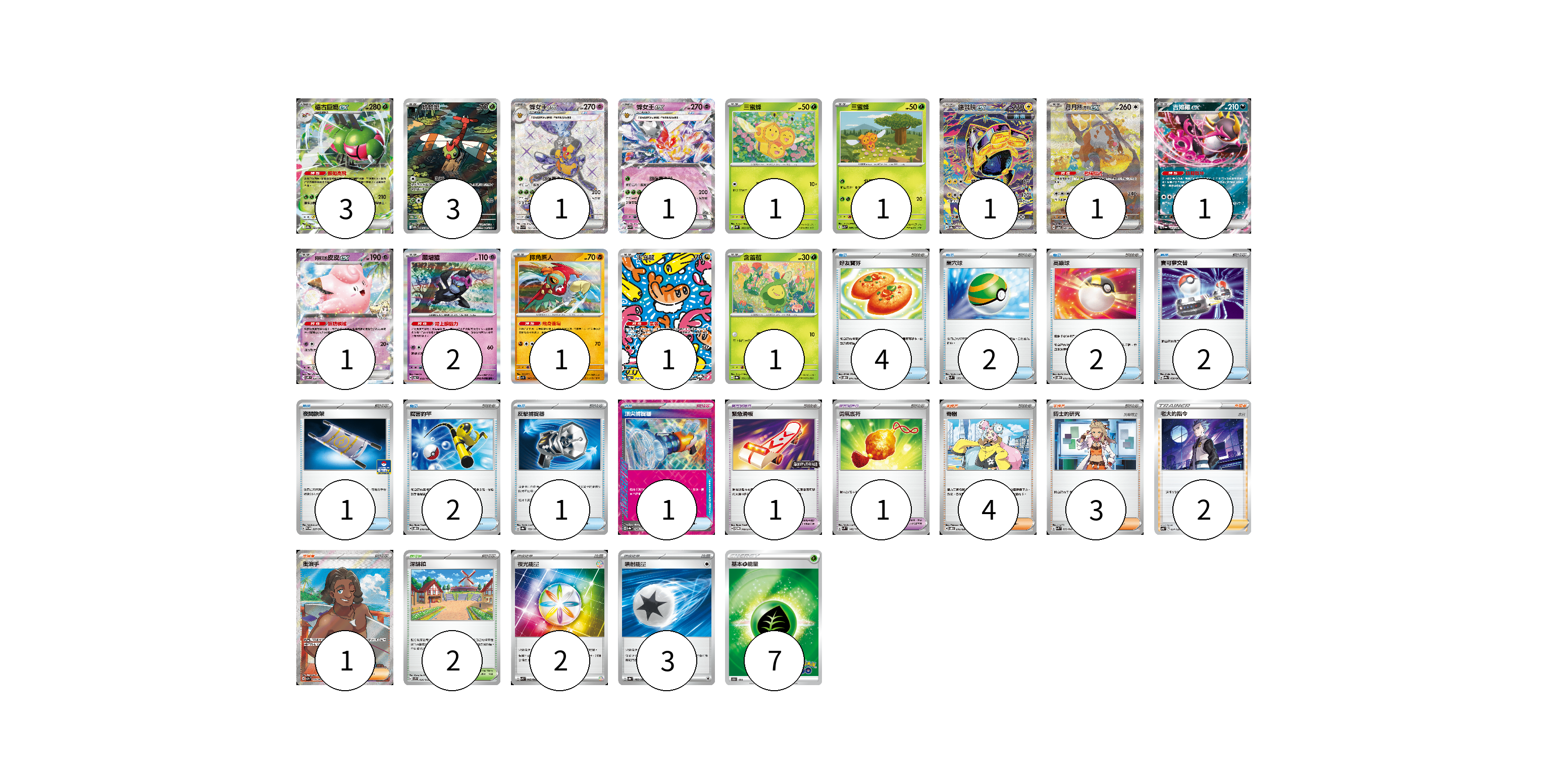 牌組構築方案 以此牌組為基礎新構築牌組 顯示卡面 顯示列表 寶可夢卡(19) 3 3 1 1 1 1 1 1 1 1 2 1 1 1 寶可夢道具(2) 1 1 物品卡(15) 4 2 2 2 1 2 1 1 支援者卡(10) 4 3 2 1 競技場卡(2) 2 能量卡(12) 2 3 7 寶可夢卡(19) 卡牌名稱 張數 卡牌名稱 張數 遠古巨蜓ex SV9a 003/063 03 蜻蜻蜓 SV9a 064/063 03 蜂女王ex SV3 123/108 01 蜂女王ex SV3 051/108 01 三蜜蜂 SV2P 003/071 01 三蜜蜂 SV3 006/108 01 鐵臂膀ex SV8a 210/187 01 月月熊 赫月 ex SV5a 091/066 01 吉雉雞ex SV6a 038/064 01 莉莉艾的皮皮ex SV9 033/100 01 願增猿 SV6 055/101 02 摔角鷹人 SV1S 045/078 01 米立龍 SV6 112/101 01 含羞苞 SV8a 001/187 01 寶可夢道具(2) 卡牌名稱 張數 卡牌名稱 張數 緊急滑板 SV-P 140/SV-P 01 勇氣護符 SVM 142/175 01 物品卡(15) 卡牌名稱 張數 卡牌名稱 張數 好友寶芬 SVOD 011/020 04 巢穴球 SVM 133/175 02 高級球 SVOD 012/020 02 寶可夢交替 SV9a 058/063 02 夜間擔架 SV-P 227/SV-P 01 厲害釣竿 SVOD 010/020 02 反擊捕捉器 SV8a 139/187 01 頂尖捕捉器 SV8a 148/187 01 支援者卡(10) 卡牌名稱 張數 卡牌名稱 張數 奇樹 SVOD 016/020 04 博士的研究 SVK 032/042 03 老大的指令(赤日) SVB 024/028 02 衝浪手 SV7a 084/064 01 競技場卡(2) 卡牌名稱 張數 卡牌名稱 張數 深缽鎮 SVF 036/038 02 能量卡(12) 卡牌名稱 張數 卡牌名稱 張數 夜光能量 SVK 042/042 02 噴射能量 SV8a 185/187 03 基本草能量 S10b GRA 07 以此牌組為基礎新構築牌組 牌組編碼 tNDnIw-LNphmK-YvAUVR copy 列印牌組單 牌組編碼已複製 分享至SNS