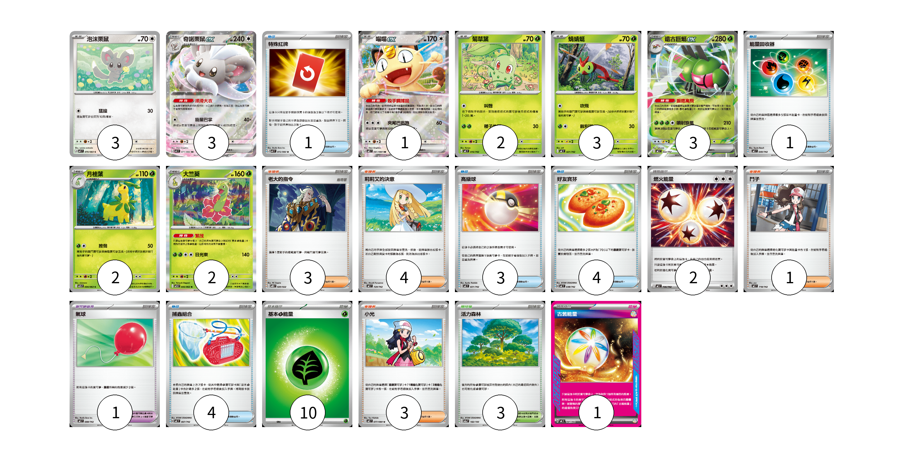 牌組構築方案 以此牌組為基礎新構築牌組 顯示卡面 顯示列表 寶可夢卡(19) 3 3 1 2 3 3 2 2 寶可夢道具(1) 1 物品卡(13) 1 1 3 4 4 支援者卡(11) 3 4 1 3 競技場卡(3) 3 能量卡(13) 2 10 1 寶可夢卡(19) 卡牌名稱 張數 卡牌名稱 張數 泡沫栗鼠 M4 070/083 03 奇諾栗鼠ex M4 071/083 03 喵喵ex M3 061/080 01 菊草葉 MC 016/742 02 蜻蜻蜓 MC 021/742 03 遠古巨蜓ex MC 022/742 03 月桂葉 M1S 004/063 02 大竺葵 M1S 005/063 02 寶可夢道具(1) 卡牌名稱 張數 卡牌名稱 張數 氣球 MC 688/742 01 物品卡(13) 卡牌名稱 張數 卡牌名稱 張數 特殊紅牌 M4 072/083 01 能量回收器 MC 640/742 01 高級球 MC 651/742 03 好友寶芬 MC 648/742 04 捕蟲組合 MC 667/742 04 支援者卡(11) 卡牌名稱 張數 卡牌名稱 張數 老大的指令 MBD 020/022 03 莉莉艾的決意 MC 729/742 04 鬥子 MC 718/742 01 小光 M2 077/080 03 競技場卡(3) 卡牌名稱 張數 卡牌名稱 張數 活力森林 M2a 182/193 03 能量卡(13) 卡牌名稱 張數 卡牌名稱 張數 燃火能量 MC 736/742 02 基本【草】能量 MC GRA 10 古舊能量 MC 741/742 01 以此牌組為基礎新構築牌組 牌組編碼 tNvbwg-dcDQgC-ZnidLb copy 列印牌組單 牌組編碼已複製 分享至SNS