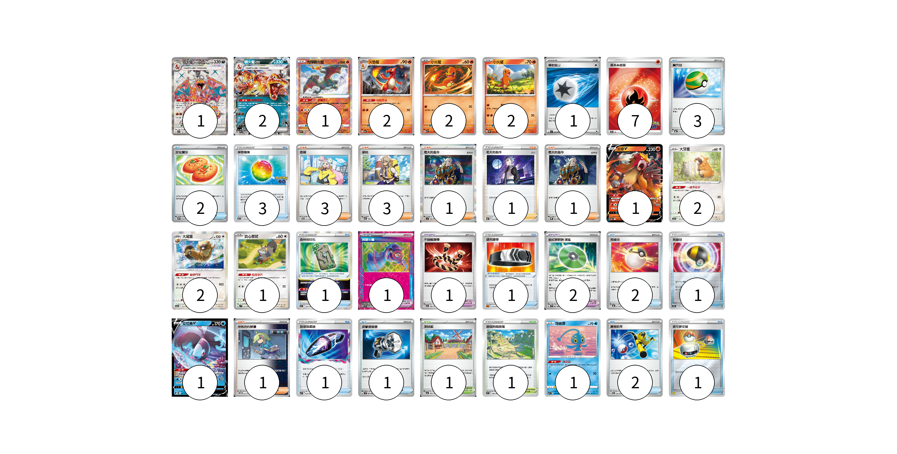 牌組構築方案 以此牌組為基礎新構築牌組 顯示卡面 顯示列表 寶可夢卡(20) 1 2 1 2 2 2 1 2 2 1 1 1 2 寶可夢道具(6) 1 1 1 1 2 物品卡(14) 3 2 3 2 1 1 1 1 支援者卡(10) 3 3 1 1 1 1 競技場卡(2) 1 1 能量卡(8) 1 7 寶可夢卡(20) 卡牌名稱 張數 卡牌名稱 張數 噴火龍ex SV3 125/108 01 噴火龍ex SV4a 115/190 02 光輝噴火龍 SVF 001/038 01 火恐龍 SV4a 026/190 02 小火龍 SV3 012/108 02 小火龍 SV2a 004/165 02 炎帝V S12a 019/172 01 大牙狸 S12a 121/172 02 大尾狸 S12a 122/172 02 貪心栗鼠 SV1V 061/078 01 霓虹魚V SVHM 001/022 01 瑪納霏 SVF 003/038 01 厲害釣竿 SVEL 010/020 02 寶可夢道具(6) 卡牌名稱 張數 卡牌名稱 張數 森林封印石 S12 092/098 01 英雄斗篷 SV5M 064/071 01 不服輸頭帶 SV4a 168/190 01 講究腰帶 SLL 015/021 01 招式學習器 演進 SV4M 063/066 02 物品卡(14) 卡牌名稱 張數 卡牌名稱 張數 巢穴球 SVHK 012/022 03 好友寶芬 SV5K 063/071 02 神奇糖果 S10b 066/071 03 高級球 SVHK 013/022 02 高級球 SO 020/030 01 放逐吸塵器 SVF 023/038 01 反擊捕捉器 SV4M 059/066 01 寶可夢交替 SPZ 010/020 01 支援者卡(10) 卡牌名稱 張數 卡牌名稱 張數 奇樹 SVEM 017/020 03 派帕 SV4a 180/190 03 老大的指令 SV1a 069/073 01 老大的指令(赤日) SVB 024/028 01 老大的指令 SVHK 022/022 01 暗碼迷的解讀 SV5M 067/071 01 競技場卡(2) 卡牌名稱 張數 卡牌名稱 張數 深缽鎮 SV4a 185/190 01 崩塌的競技場 S9 098/100 01 能量卡(8) 卡牌名稱 張數 卡牌名稱 張數 噴射能量 SV1a 072/073 01 基本火能量 S10b FIR 07 以此牌組為基礎新構築牌組 牌組編碼 tOOIXk-SDnPUu-tGfYIn copy 列印牌組單 牌組編碼已複製 分享至SNS