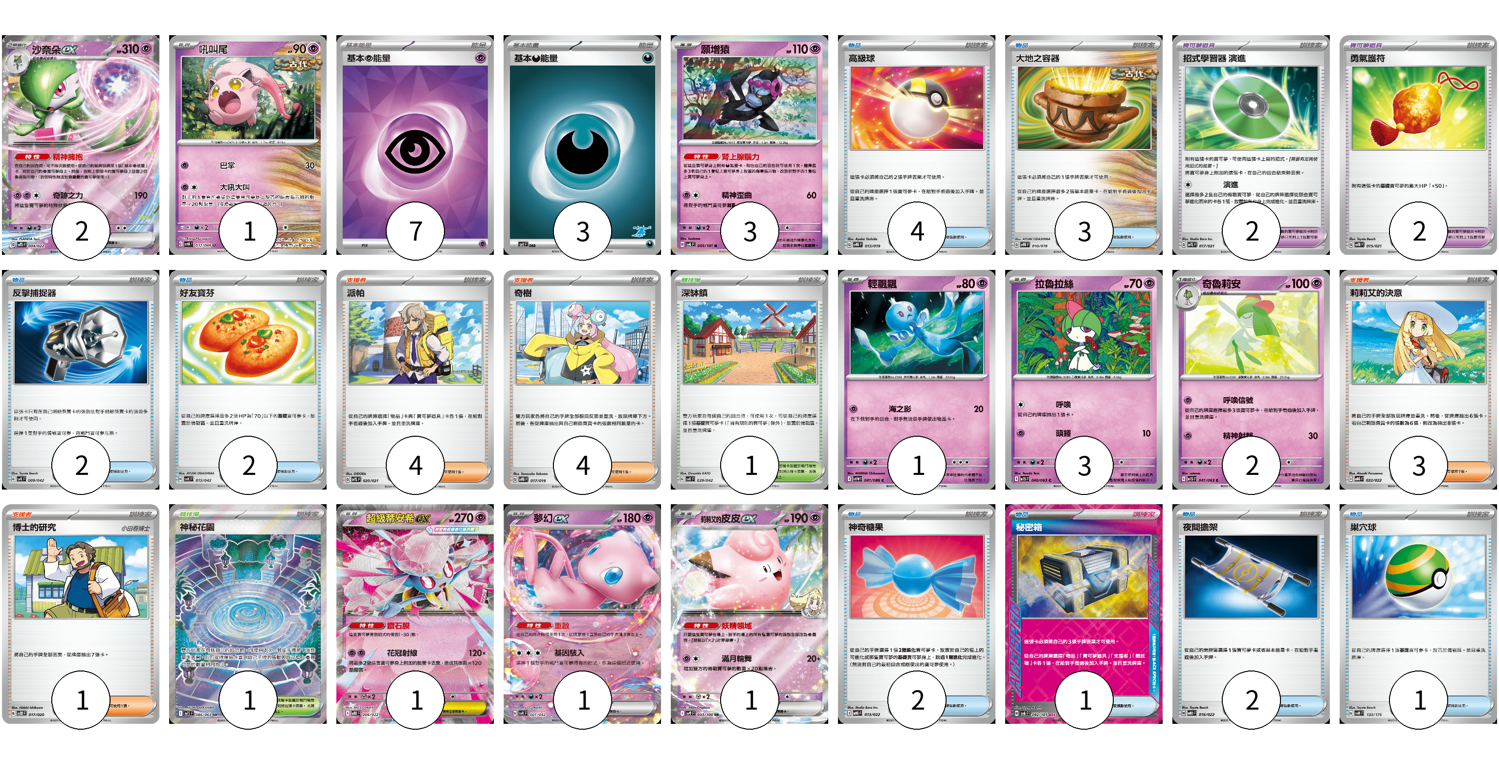 牌組構築方案 以此牌組為基礎新構築牌組 顯示卡面 顯示列表 寶可夢卡(15) 2 1 3 1 3 2 1 1 1 寶可夢道具(4) 2 2 物品卡(17) 4 3 2 2 2 1 2 1 支援者卡(12) 4 4 3 1 競技場卡(2) 1 1 能量卡(10) 7 3 寶可夢卡(15) 卡牌名稱 張數 卡牌名稱 張數 沙奈朵ex SVTS 004/022 02 吼叫尾 SV4K 032/066 01 願增猿 SV6 055/101 03 輕飄飄 SV11W 041/086 01 拉魯拉絲 M1S 040/063 03 奇魯莉安 M1S 041/063 02 超級蒂安希ex MBD 006/022 01 夢幻ex SVK 001/042 01 莉莉艾的皮皮ex SV9 033/100 01 寶可夢道具(4) 卡牌名稱 張數 卡牌名稱 張數 招式學習器 演進 SVTL 017/021 02 勇氣護符 SVTR 015/021 02 物品卡(17) 卡牌名稱 張數 卡牌名稱 張數 高級球 SVTG 013/019 04 大地之容器 SVTG 010/019 03 反擊捕捉器 SVK 009/042 02 好友寶芬 SVK 015/042 02 神奇糖果 MBG 013/022 02 秘密箱 SV6 092/101 01 夜間擔架 MBD 016/022 02 巢穴球 SVM 133/175 01 支援者卡(12) 卡牌名稱 張數 卡牌名稱 張數 派帕 SVTL 020/021 04 奇樹 SVTG 017/019 04 莉莉艾的決意 MBG 022/022 03 博士的研究 SVOD 017/020 01 競技場卡(2) 卡牌名稱 張數 卡牌名稱 張數 深缽鎮 SVK 039/042 01 神秘花園 M1S 086/063 01 能量卡(10) 卡牌名稱 張數 卡牌名稱 張數 基本【超】能量 SVK PSY 07 基本【惡】能量 SVI DAR 03 以此牌組為基礎新構築牌組 牌組編碼 tOwPdK-vHwmlx-FykypY copy 列印牌組單 牌組編碼已複製 分享至SNS