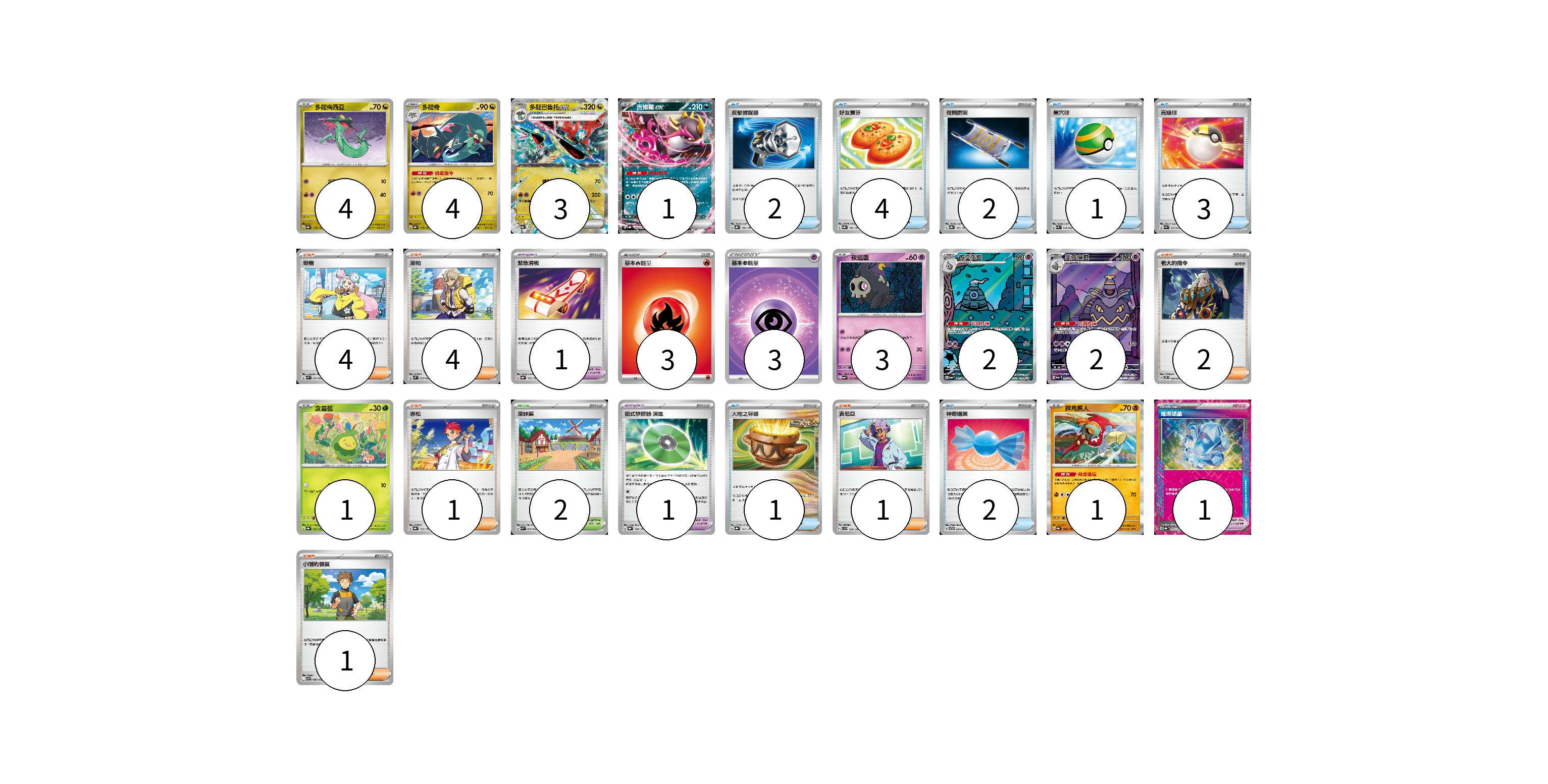 牌組構築方案 以此牌組為基礎新構築牌組 顯示卡面 顯示列表 寶可夢卡(21) 4 4 3 1 3 2 2 1 1 寶可夢道具(3) 1 1 1 物品卡(15) 2 4 2 1 3 1 2 支援者卡(13) 4 4 2 1 1 1 競技場卡(2) 2 能量卡(6) 3 3 寶可夢卡(21) 卡牌名稱 張數 卡牌名稱 張數 多龍梅西亞 SV8a 118/187 04 多龍奇 SV8a 119/187 04 多龍巴魯托ex SV8a 120/187 03 吉雉雞ex SV8a 104/187 01 夜巡靈 SV6a 018/064 03 彷徨夜靈 SV6a 069/064 02 黑夜魔靈 SV6a 070/064 02 含羞苞 SV8a 001/187 01 摔角鷹人 SV8a 084/187 01 寶可夢道具(3) 卡牌名稱 張數 卡牌名稱 張數 緊急滑板 SV8a 153/187 01 招式學習器 演進 SV8a 160/187 01 璀璨結晶 SV8a 152/187 01 物品卡(15) 卡牌名稱 張數 卡牌名稱 張數 反擊捕捉器 SV8a 139/187 02 好友寶芬 SV8a 147/187 04 夜間擔架 SV8a 151/187 02 巢穴球 SVK 016/042 01 高級球 SVK 018/042 03 大地之容器 SV8a 143/187 01 神奇糖果 SVTG 014/019 02 支援者卡(13) 卡牌名稱 張數 卡牌名稱 張數 奇樹 SVK 031/042 04 派帕 SVK 035/042 04 老大的指令 SVTS 020/022 02 赤松 SV8a 163/187 01 吉尼亞 SVD 129/139 01 小剛的發掘 SV9 096/100 01 競技場卡(2) 卡牌名稱 張數 卡牌名稱 張數 深缽鎮 SVK 039/042 02 能量卡(6) 卡牌名稱 張數 卡牌名稱 張數 基本【火】能量 SVTL FIR 03 基本【超】能量 SI PSY 03 以此牌組為基礎新構築牌組 牌組編碼 tRciPc-zDIxtF-uvxRGn copy 列印牌組單 牌組編碼已複製 分享至SNS