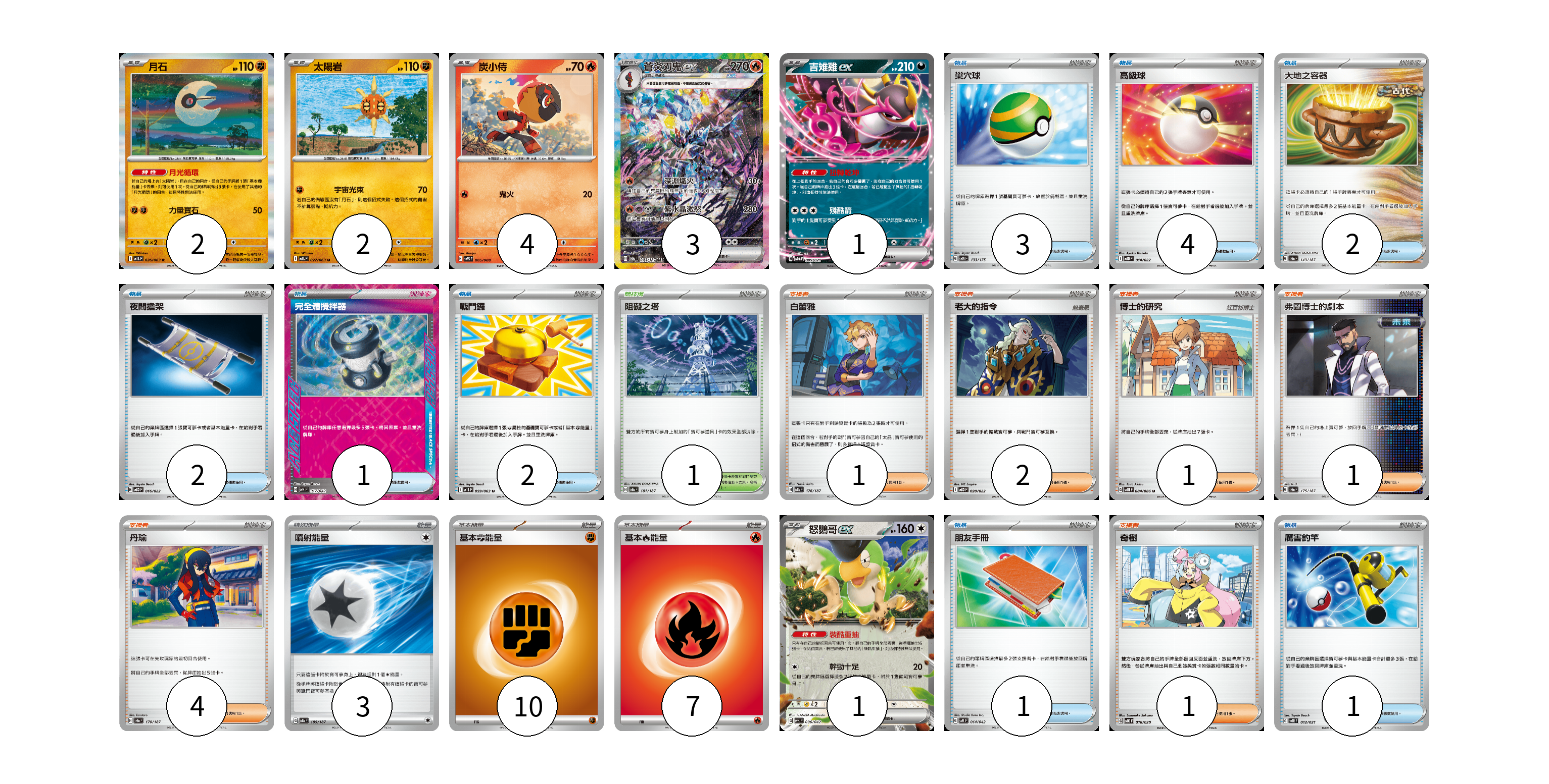 牌組構築方案 以此牌組為基礎新構築牌組 顯示卡面 顯示列表 寶可夢卡(13) 2 2 4 3 1 1 物品卡(16) 3 4 2 2 1 2 1 1 支援者卡(10) 1 2 1 1 4 1 競技場卡(1) 1 能量卡(20) 3 10 7 寶可夢卡(13) 卡牌名稱 張數 卡牌名稱 張數 月石 M1L 026/063 02 太陽岩 M1L 027/063 02 炭小侍 SVPS 005/008 04 蒼炎刃鬼ex SV8a 203/187 03 吉雉雞ex SVOM 009/021 01 怒鸚哥ex SVK 006/042 01 物品卡(16) 卡牌名稱 張數 卡牌名稱 張數 巢穴球 SVM 133/175 03 高級球 MBD 014/022 04 大地之容器 SV8a 143/187 02 夜間擔架 MBD 016/022 02 完全體攪拌器 SVK 017/042 01 戰鬥鑼 M1L 059/063 02 朋友手冊 SVK 014/042 01 厲害釣竿 SVTR 012/021 01 支援者卡(10) 卡牌名稱 張數 卡牌名稱 張數 白蕾雅 SV8a 176/187 01 老大的指令 MBD 020/022 02 博士的研究 SV11B 084/086 01 弗圖博士的劇本 SV8a 175/187 01 丹瑜 SV8a 170/187 04 奇樹 SVOD 016/020 01 競技場卡(1) 卡牌名稱 張數 卡牌名稱 張數 阻礙之塔 SV8a 181/187 01 能量卡(20) 卡牌名稱 張數 卡牌名稱 張數 噴射能量 SV8a 185/187 03 基本鬥能量 sv-p FIG 10 基本火能量 sv-p FIR 07 以此牌組為基礎新構築牌組 牌組編碼 tSjWiG-ruWZRI-jsMgJW copy 列印牌組單 牌組編碼已複製 分享至SNS