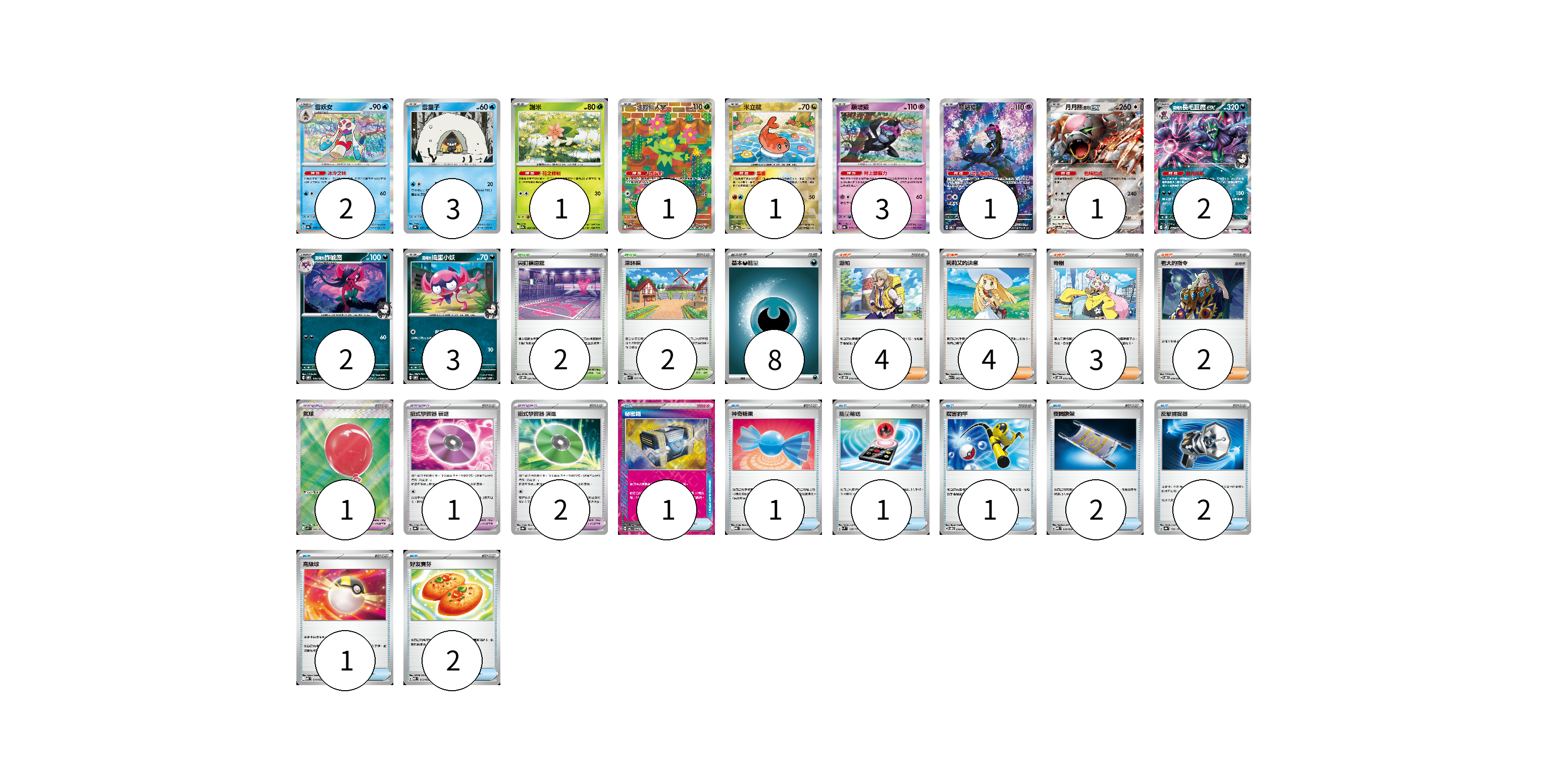 牌組構築方案 以此牌組為基礎新構築牌組 顯示卡面 顯示列表 寶可夢卡(20) 2 3 1 1 1 3 1 1 2 2 3 寶可夢道具(4) 1 1 2 物品卡(11) 1 1 1 1 2 2 1 2 支援者卡(13) 4 4 3 2 競技場卡(4) 2 2 能量卡(8) 8 寶可夢卡(20) 卡牌名稱 張數 卡牌名稱 張數 雪妖女 SV8a 038/187 02 雪童子 SV8a 037/187 03 謝米 SV9a 006/063 01 沙鈴仙人掌 SV9 101/100 01 米立龍 SV8a 121/187 01 願增猿 SV8a 075/187 03 願增猿 SV6 107/101 01 月月熊 赫月 ex SV5a 052/066 01 <瑪俐的>長毛巨魔ex SVOM 007/021 02 <瑪俐的>詐唬魔 SVOM 006/021 02 <瑪俐的>搗蛋小妖 SVOM 005/021 03 寶可夢道具(4) 卡牌名稱 張數 卡牌名稱 張數 氣球 M1L 084/063 01 招式學習器 衰退 SV8a 161/187 01 招式學習器 演進 SV8a 160/187 02 物品卡(11) 卡牌名稱 張數 卡牌名稱 張數 秘密箱 SV6 092/101 01 神奇糖果 MBG 013/022 01 能量輸送 SVM 128/175 01 厲害釣竿 SVOD 010/020 01 夜間擔架 MBD 016/022 02 反擊捕捉器 SV8a 139/187 02 高級球 MBD 014/022 01 好友寶芬 MBD 013/022 02 支援者卡(13) 卡牌名稱 張數 卡牌名稱 張數 派帕 SVOD 018/020 04 莉莉艾的決意 M1L 062/063 04 奇樹 SVOD 016/020 03 老大的指令 SVOD 019/020 02 競技場卡(4) 卡牌名稱 張數 卡牌名稱 張數 尖釘鎮道館 SVOM 021/021 02 深缽鎮 SVK 039/042 02 能量卡(8) 卡牌名稱 張數 卡牌名稱 張數 基本【惡】能量 M-P DAR 08 以此牌組為基礎新構築牌組 牌組編碼 tUlrHx-zfWuTJ-iKXofS copy 列印牌組單 牌組編碼已複製 分享至SNS