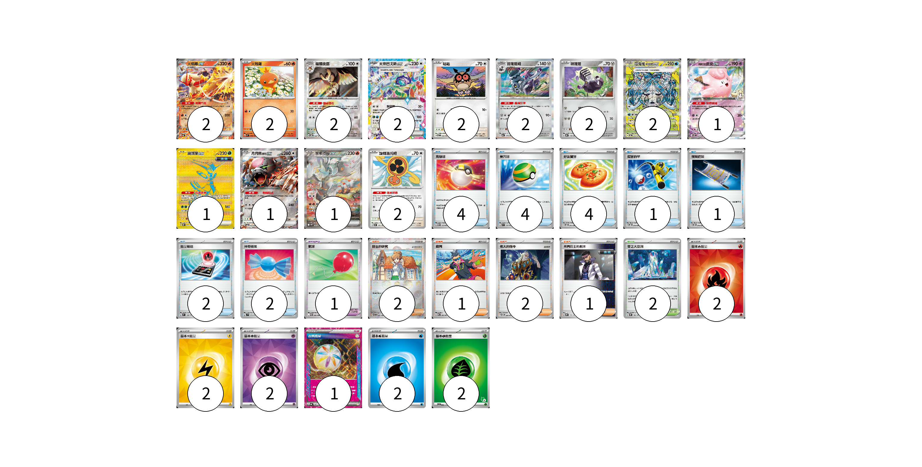 牌組構築方案 以此牌組為基礎新構築牌組 顯示卡面 顯示列表 寶可夢卡(22) 2 2 2 2 2 2 2 2 1 1 1 1 2 寶可夢道具(1) 1 物品卡(18) 4 4 4 1 1 2 2 支援者卡(6) 2 1 2 1 競技場卡(2) 2 能量卡(11) 2 2 2 1 2 2 寶可夢卡(22) 卡牌名稱 張數 卡牌名稱 張數 火焰雞ex SVM 016/175 02 火稚雞 SVM 014/175 02 貓頭夜鷹 SV8a 128/187 02 太樂巴戈斯ex SV8a 136/187 02 咕咕 SV7 076/102 02 普隆隆姆 SV8a 115/187 02 噗隆隆 SV8a 114/187 02 厄鬼椪 水井面具ex SV8a 208/187 02 莉莉艾的皮皮ex SV9 033/100 01 鐵斑葉ex SV8a 233/187 01 月月熊 赫月 ex SV5a 052/066 01 萊希拉姆ex SV11W 168/086 01 旋轉洛托姆 SV8a 131/187 02 寶可夢道具(1) 卡牌名稱 張數 卡牌名稱 張數 氣球 SV11B 082/086 01 物品卡(18) 卡牌名稱 張數 卡牌名稱 張數 高級球 SVQP 015/023 04 巢穴球 SVK 016/042 04 好友寶芬 SVOD 011/020 04 厲害釣竿 SVOD 010/020 01 夜間擔架 SVOM 016/021 01 能量輸送 SVM 128/175 02 神奇糖果 SV1V 072/078 02 支援者卡(6) 卡牌名稱 張數 卡牌名稱 張數 博士的研究 SV11B 084/086 02 裁判 SV9a 062/063 01 老大的指令 SVOM 020/021 02 弗圖博士的劇本 SV8a 175/187 01 競技場卡(2) 卡牌名稱 張數 卡牌名稱 張數 零之大空洞 SV8a 182/187 02 能量卡(11) 卡牌名稱 張數 卡牌名稱 張數 基本【火】能量 SVQL FIR 02 基本【雷】能量 SVQP LIG 02 基本【超】能量 SVOD PSY 02 古舊能量 SV8a 187/187 01 基本【水】能量 SVF WAT 02 基本【草】能量 SVI GRA 02 以此牌組為基礎新構築牌組 牌組編碼 tVufex-TKidYt-FudccQ copy 列印牌組單 牌組編碼已複製 分享至SNS