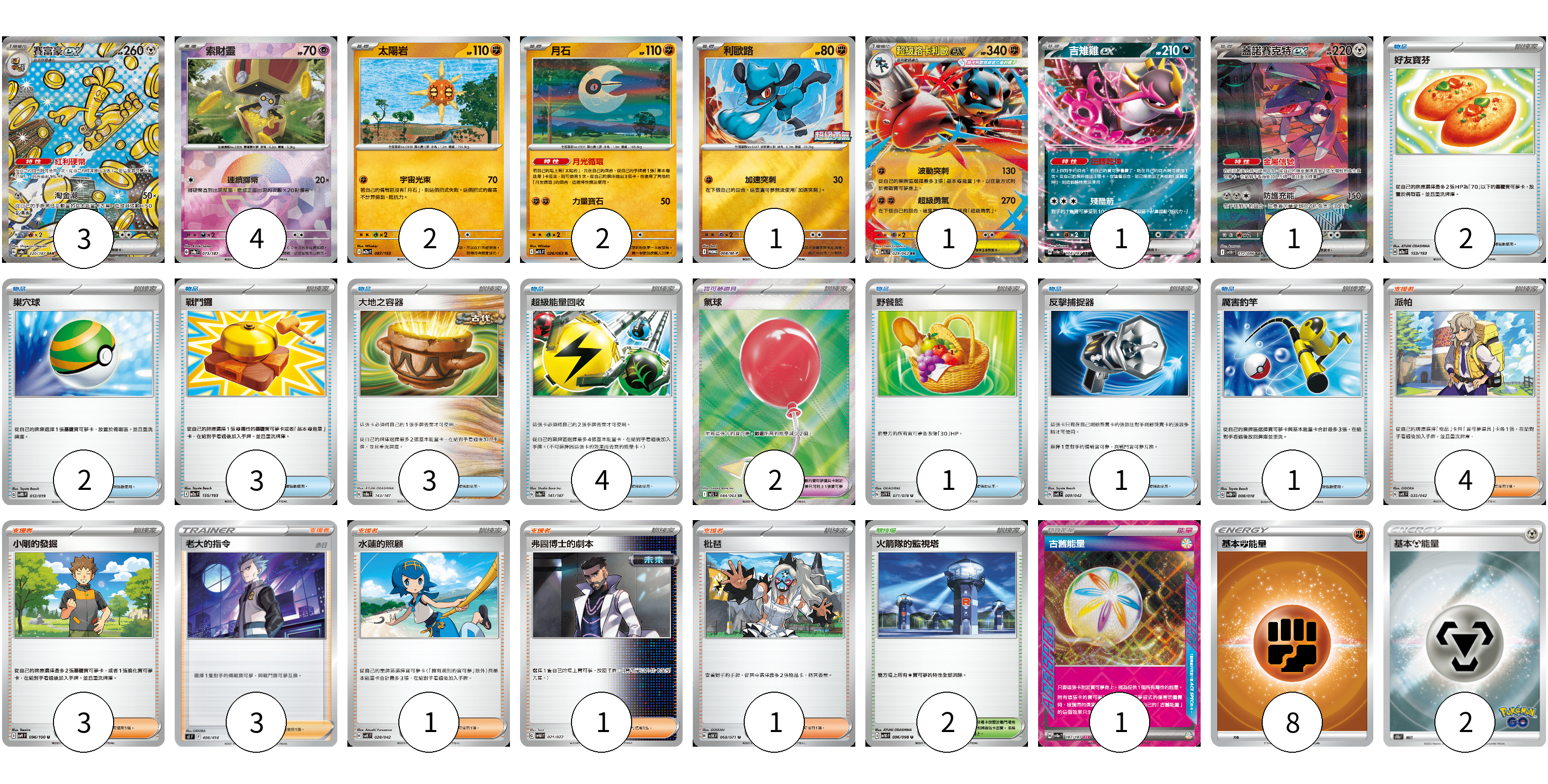 牌組構築方案 以此牌組為基礎新構築牌組 顯示卡面 顯示列表 寶可夢卡(15) 3 4 2 2 1 1 1 1 寶可夢道具(2) 2 物品卡(17) 2 2 3 3 4 1 1 1 支援者卡(13) 4 3 3 1 1 1 競技場卡(2) 2 能量卡(11) 1 8 2 寶可夢卡(15) 卡牌名稱 張數 卡牌名稱 張數 賽富豪ex SV8a 220/187 03 索財靈 SV8a 073/187 04 太陽岩 M2a 087/193 02 月石 M1L 026/063 02 利歐路 M-P 008/M-P 01 超級路卡利歐ex M1L 029/063 01 吉雉雞ex SV8a 104/187 01 蓋諾賽克特ex SV11B 172/086 01 寶可夢道具(2) 卡牌名稱 張數 卡牌名稱 張數 氣球 M1L 084/063 02 物品卡(17) 卡牌名稱 張數 卡牌名稱 張數 好友寶芬 M2a 153/193 02 巢穴球 SVTG 012/019 02 戰鬥鑼 M2a 155/193 03 大地之容器 SV8a 143/187 03 超級能量回收 SV8a 141/187 04 野餐籃 SV1V 071/078 01 反擊捕捉器 SVK 009/042 01 厲害釣竿 SVTH 008/018 01 支援者卡(13) 卡牌名稱 張數 卡牌名稱 張數 派帕 SVK 035/042 04 小剛的發掘 SV9 096/100 03 老大的指令(赤日) SI 406/414 03 水蓮的照顧 SVK 028/042 01 弗圖博士的劇本 SVHM 021/022 01 枇琶 SV5K 068/071 01 競技場卡(2) 卡牌名稱 張數 卡牌名稱 張數 火箭隊的監視塔 SV10 096/098 02 能量卡(11) 卡牌名稱 張數 卡牌名稱 張數 古舊能量 SV8a 187/187 01 基本鬥能量 SLL FIG 08 基本鋼能量 S10b MET 02 以此牌組為基礎新構築牌組 牌組編碼 tWvnjv-XirlcT-poEvJD copy 列印牌組單 牌組編碼已複製 分享至SNS