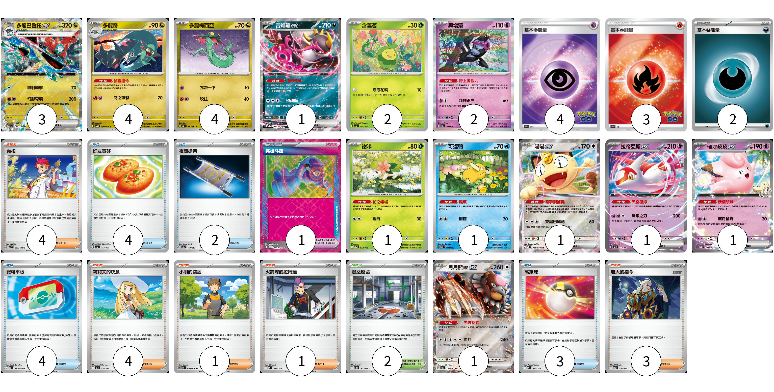 牌組構築方案 以此牌組為基礎新構築牌組 顯示卡面 顯示列表 寶可夢卡(22) 3 4 4 1 2 2 1 1 1 1 1 1 寶可夢道具(1) 1 物品卡(13) 4 2 4 3 支援者卡(13) 4 4 1 1 3 競技場卡(2) 2 能量卡(9) 4 3 2 寶可夢卡(22) 卡牌名稱 張數 卡牌名稱 張數 多龍巴魯托ex SV6 081/101 03 多龍奇 SV6 080/101 04 多龍梅西亞 SV6 079/101 04 吉雉雞ex SV6a 038/064 01 含羞苞 SV8a 001/187 02 願增猿 SV8a 075/187 02 謝米 M2a 012/193 01 可達鴨 M2a 032/193 01 喵喵ex M3 061/080 01 拉帝亞斯ex MC 312/742 01 <莉莉艾的>皮皮ex MC 287/742 01 月月熊 赫月ex SV8a 134/187 01 寶可夢道具(1) 卡牌名稱 張數 卡牌名稱 張數 英雄斗篷 SV5M 064/071 01 物品卡(13) 卡牌名稱 張數 卡牌名稱 張數 好友寶芬 SV8a 147/187 04 夜間擔架 SV8a 151/187 02 寶可平板 M3 070/080 04 高級球 MC 651/742 03 支援者卡(13) 卡牌名稱 張數 卡牌名稱 張數 赤松 SV7 097/102 04 莉莉艾的決意 MC 729/742 04 小剛的發掘 SV9 096/100 01 火箭隊的拉姆達 MC 734/742 01 老大的指令 MBD 020/022 03 競技場卡(2) 卡牌名稱 張數 卡牌名稱 張數 險惡廢墟 M1L 063/063 02 能量卡(9) 卡牌名稱 張數 卡牌名稱 張數 基本超能量 S10b PSY 04 基本火能量 S10b FIR 03 基本惡能量 sv-p DAR 02 以此牌組為基礎新構築牌組 牌組編碼 tYQjKt-Tlhjnx-iaweoc copy 列印牌組單 牌組編碼已複製 分享至SNS