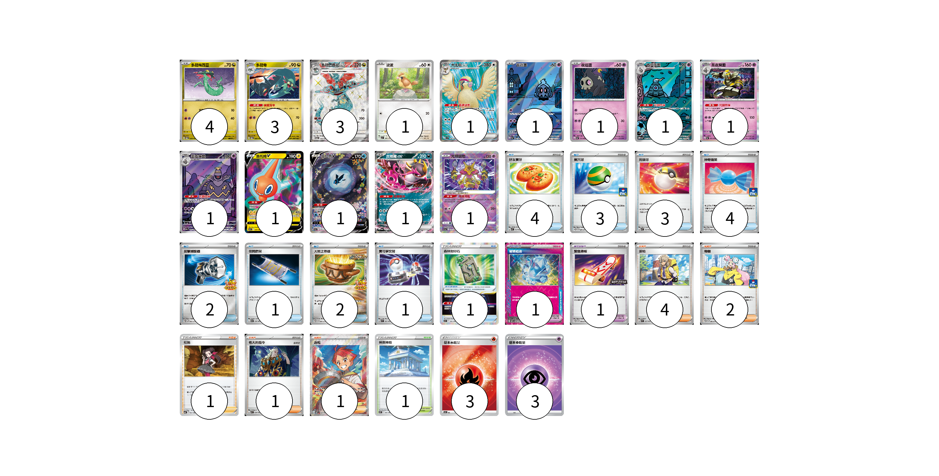 牌組構築方案 以此牌組為基礎新構築牌組 顯示卡面 顯示列表 寶可夢卡(21) 4 3 3 1 1 1 1 1 1 1 1 1 1 1 寶可夢道具(3) 1 1 1 物品卡(20) 4 3 3 4 2 1 2 1 支援者卡(9) 4 2 1 1 1 競技場卡(1) 1 能量卡(6) 3 3 寶可夢卡(21) 卡牌名稱 張數 卡牌名稱 張數 多龍梅西亞 SV6 079/101 04 多龍奇 SV6 080/101 03 多龍巴魯托ex SV6 120/101 03 波波 SV3 087/108 01 大比鳥ex SV3 128/108 01 夜巡靈 SV6a 068/064 01 夜巡靈 SV6a 018/064 01 彷徨夜靈 SV6a 069/064 01 黑夜魔靈 SV6a 020/064 01 黑夜魔靈 SV6a 070/064 01 洛托姆V S11 037/100 01 霓虹魚V S12a 216/172 01 吉雉雞ex SV6a 038/064 01 光輝胡地 S11a 031/068 01 寶可夢道具(3) 卡牌名稱 張數 卡牌名稱 張數 森林封印石 S12 092/098 01 璀璨結晶 SV7 094/102 01 緊急滑板 SV-P 140/SV-P 01 物品卡(20) 卡牌名稱 張數 卡牌名稱 張數 好友寶芬 SVK 015/042 04 巢穴球 SV-P 091/SV-P 03 高級球 SVK 018/042 03 神奇糖果 SV-P 104/SV-P 04 反擊捕捉器 SV-P 083/SV-P 02 夜間擔架 SV6a 056/064 01 大地之容器 SV-P 084/SV-P 02 寶可夢交替 SVK 022/042 01 支援者卡(9) 卡牌名稱 張數 卡牌名稱 張數 派帕 SVK 035/042 04 奇樹 SV-P 106/SV-P 02 杜娟 SVB 021/028 01 老大的指令 SVK 036/042 01 赤松 SV7 123/102 01 競技場卡(1) 卡牌名稱 張數 卡牌名稱 張數 神奧神殿 S10P 067/067 01 能量卡(6) 卡牌名稱 張數 卡牌名稱 張數 基本【火】能量 SO FIR 03 基本【超】能量 SI PSY 03 以此牌組為基礎新構築牌組 牌組編碼 tYsqHT-iQHZvc-klfzvt copy 列印牌組單 牌組編碼已複製 分享至SNS