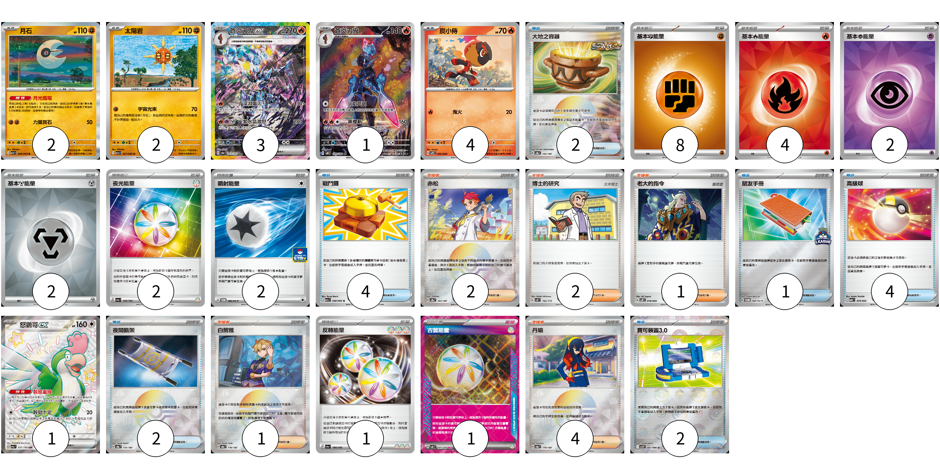 牌組構築方案 以此牌組為基礎新構築牌組 顯示卡面 顯示列表 寶可夢卡(13) 2 2 3 1 4 1 物品卡(15) 2 4 1 4 2 2 支援者卡(10) 2 2 1 1 4 能量卡(22) 8 4 2 2 2 2 1 1 寶可夢卡(13) 卡牌名稱 張數 卡牌名稱 張數 月石 M1L 026/063 02 太陽岩 M1L 027/063 02 蒼炎刃鬼ex SV8a 203/187 03 蒼炎刃鬼 SV8 109/106 01 炭小侍 SVPS 005/008 04 怒鸚哥ex SV4a 337/190 01 物品卡(15) 卡牌名稱 張數 卡牌名稱 張數 大地之容器 SV8a 143/187 02 戰鬥鑼 M1L 059/063 04 朋友手冊 SV-P 182/SV-P 01 高級球 MBD 014/022 04 夜間擔架 SV8a 151/187 02 寶可裝置3.0 SV11B 081/086 02 支援者卡(10) 卡牌名稱 張數 卡牌名稱 張數 赤松 SV8a 163/187 02 博士的研究 SVM 162/175 02 老大的指令 SVOD 019/020 01 白蕾雅 SV8a 176/187 01 丹瑜 SV8a 170/187 04 能量卡(22) 卡牌名稱 張數 卡牌名稱 張數 基本【鬥】能量 M-P FIG 08 基本【火】能量 SVQL FIR 04 基本【超】能量 SVOD PSY 02 基本【鋼】能量 SVOD MET 02 夜光能量 SV4a 190/190 02 噴射能量 SV-P 180/SV-P 02 反轉能量 SV4a 189/190 01 古舊能量 SV6 101/101 01 以此牌組為基礎新構築牌組 牌組編碼 tYwhdR-IRjMKM-TzmNJp copy 列印牌組單 牌組編碼已複製 分享至SNS