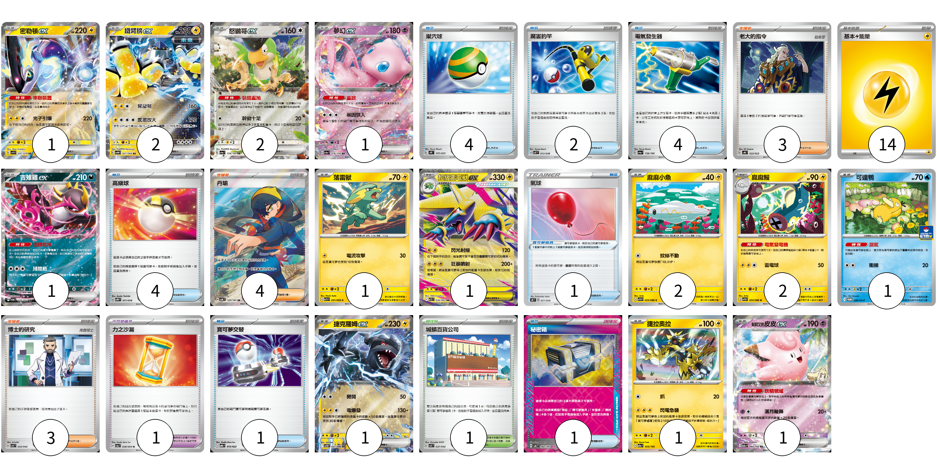 牌組構築方案 以此牌組為基礎新構築牌組 顯示卡面 顯示列表 寶可夢卡(17) 1 2 2 1 1 1 1 2 2 1 1 1 1 寶可夢道具(2) 1 1 物品卡(16) 4 2 4 4 1 1 支援者卡(10) 3 4 3 競技場卡(1) 1 能量卡(14) 14 寶可夢卡(17) 卡牌名稱 張數 卡牌名稱 張數 密勒頓ex SV1V 037/078 01 鐵臂膀ex SV4M 027/066 02 怒鸚哥ex SV4a 154/190 02 夢幻ex SV4a 076/190 01 吉雉雞ex SV6a 038/064 01 落雷獸 M1S 031/063 01 超級雷電獸ex M1S 032/063 01 麻麻小魚 SV11B 033/086 02 麻麻鰻 SV11B 034/086 02 可達鴨 SV-P 220/SV-P 01 捷克羅姆ex SV11B 037/086 01 捷拉奧拉 M2a 055/193 01 莉莉艾的皮皮ex M2a 060/193 01 寶可夢道具(2) 卡牌名稱 張數 卡牌名稱 張數 氣球 SK 021/030 01 力之沙漏 SV6a 058/064 01 物品卡(16) 卡牌名稱 張數 卡牌名稱 張數 巢穴球 SVHK 012/022 04 厲害釣竿 SVF 013/038 02 電氣發生器 SV4a 156/190 04 高級球 SVTH 011/018 04 寶可夢交替 MBG 015/022 01 秘密箱 SV6 092/101 01 支援者卡(10) 卡牌名稱 張數 卡牌名稱 張數 老大的指令 SVHK 022/022 03 丹瑜 SV6 123/101 04 博士的研究 SVK 033/042 03 競技場卡(1) 卡牌名稱 張數 卡牌名稱 張數 城鎮百貨公司 SVK 037/042 01 能量卡(14) 卡牌名稱 張數 卡牌名稱 張數 基本【雷】能量 SVHM LIG 14 以此牌組為基礎新構築牌組 牌組編碼 taFdMD-fWNCfV-HUJJdl copy 列印牌組單 牌組編碼已複製 分享至SNS