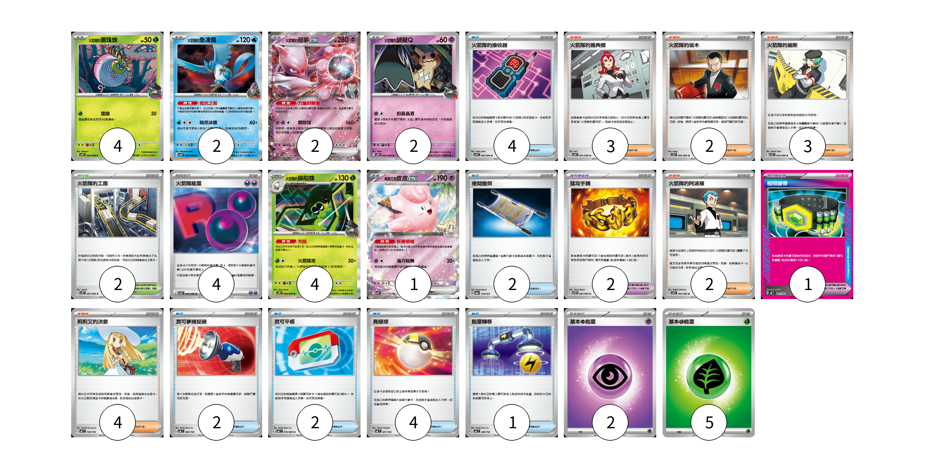 牌組構築方案 以此牌組為基礎新構築牌組 顯示卡面 顯示列表 寶可夢卡(15) 4 2 2 2 4 1 寶可夢道具(3) 2 1 物品卡(15) 4 2 2 2 4 1 支援者卡(14) 3 2 3 2 4 競技場卡(2) 2 能量卡(11) 4 2 5 寶可夢卡(15) 卡牌名稱 張數 卡牌名稱 張數 <火箭隊的>團珠蛛 SV10 008/098 04 <火箭隊的>急凍鳥 SV10 022/098 02 <火箭隊的>超夢ex SV10 039/098 02 <火箭隊的>謎擬Q SV10 042/098 02 <火箭隊的>操陷蛛 SV10 009/098 04 莉莉艾的皮皮ex SV9 033/100 01 寶可夢道具(3) 卡牌名稱 張數 卡牌名稱 張數 猛攻手鐲 SV11W 082/086 02 極限腰帶 MC 691/742 01 物品卡(15) 卡牌名稱 張數 卡牌名稱 張數 火箭隊的接收器 SV10 090/098 04 夜間擔架 SVOM 016/021 02 寶可夢捕捉器 MC 665/742 02 寶可平板 M3 070/080 02 高級球 MC 651/742 04 能量轉移 MC 638/742 01 支援者卡(14) 卡牌名稱 張數 卡牌名稱 張數 火箭隊的雅典娜 SV10 091/098 03 火箭隊的坂木 SV10 093/098 02 火箭隊的蘭斯 SV10 095/098 03 火箭隊的阿波羅 SV10 092/098 02 莉莉艾的決意 MC 729/742 04 競技場卡(2) 卡牌名稱 張數 卡牌名稱 張數 火箭隊的工廠 SV10 097/098 02 能量卡(11) 卡牌名稱 張數 卡牌名稱 張數 火箭隊能量 SV10 098/098 04 基本【超】能量 MC PSY 02 基本【草】能量 MJ GRA 05 以此牌組為基礎新構築牌組 牌組編碼 tcfNXH-kIsnjx-VHKmAO copy 列印牌組單 牌組編碼已複製 分享至SNS