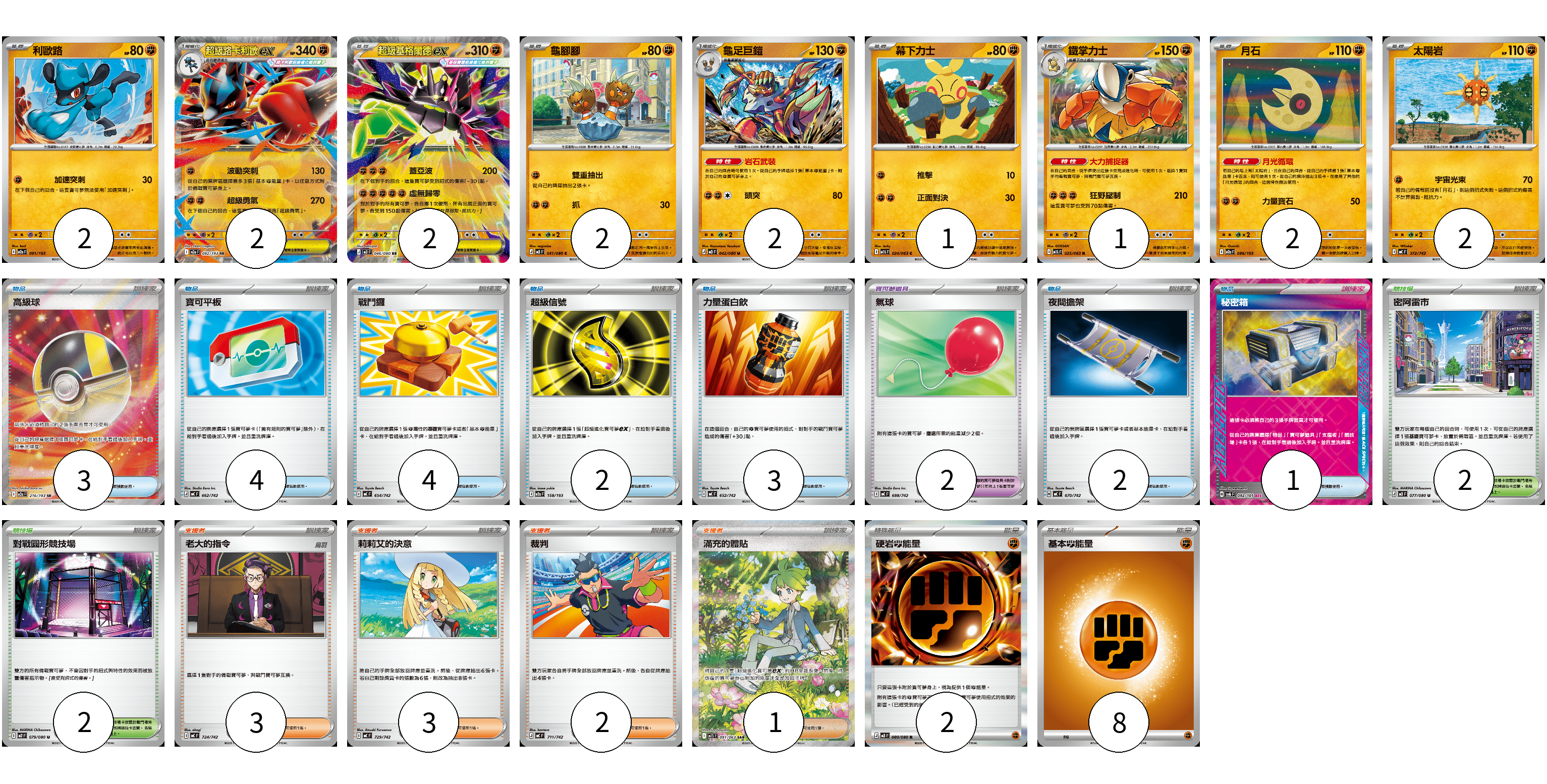 牌組構築方案 以此牌組為基礎新構築牌組 顯示卡面 顯示列表 寶可夢卡(16) 2 2 2 2 2 1 1 2 2 寶可夢道具(2) 2 物品卡(19) 3 4 4 2 3 2 1 支援者卡(9) 3 3 2 1 競技場卡(4) 2 2 能量卡(10) 2 8 寶可夢卡(16) 卡牌名稱 張數 卡牌名稱 張數 利歐路 M2a 091/193 02 超級路卡利歐ex M2a 092/193 02 超級基格爾德ex M3 046/080 02 龜腳腳 M3 041/080 02 龜足巨鎧 M3 042/080 02 幕下力士 M1L 024/063 01 鐵掌力士 M1L 025/063 01 月石 M2a 086/193 02 太陽岩 MC 372/742 02 寶可夢道具(2) 卡牌名稱 張數 卡牌名稱 張數 氣球 MC 688/742 02 物品卡(19) 卡牌名稱 張數 卡牌名稱 張數 高級球 M2a 216/193 03 寶可平板 MC 662/742 04 戰鬥鑼 MC 654/742 04 超級信號 M2a 158/193 02 力量蛋白飲 MC 652/742 03 夜間擔架 MC 670/742 02 秘密箱 SV6 092/101 01 支援者卡(9) 卡牌名稱 張數 卡牌名稱 張數 老大的指令 MC 724/742 03 莉莉艾的決意 MC 729/742 03 裁判 MC 711/742 02 滿充的體貼 M1S 091/063 01 競技場卡(4) 卡牌名稱 張數 卡牌名稱 張數 密阿雷市 M3 077/080 02 對戰圓形競技場 M2 079/080 02 能量卡(10) 卡牌名稱 張數 卡牌名稱 張數 硬岩【鬥】能量 M3 080/080 02 基本【鬥】能量 MC FIG 08 以此牌組為基礎新構築牌組 牌組編碼 teFdkE-ufNOyR-QPSsHZ copy 列印牌組單 牌組編碼已複製 分享至SNS
