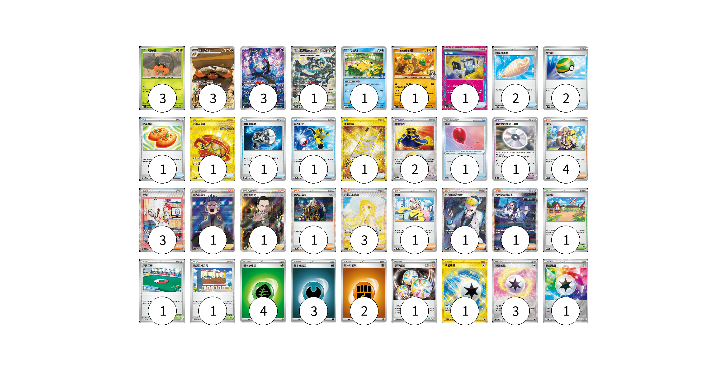 牌組構築方案 以此牌組為基礎新構築牌組 顯示卡面 顯示列表 寶可夢卡(12) 3 3 3 1 1 1 寶可夢道具(4) 2 1 1 物品卡(10) 1 2 2 1 1 1 1 1 支援者卡(16) 4 3 1 1 1 3 1 1 1 競技場卡(3) 1 1 1 能量卡(15) 4 3 2 1 1 3 1 寶可夢卡(12) 卡牌名稱 張數 卡牌名稱 張數 石居蟹 SV9a 007/063 03 岩殿居蟹 SV9a 067/063 03 願增猿 SV6 107/101 03 厄鬼椪 礎石面具ex SV6 128/101 01 可達鴨 SV-P 220/SV-P 01 <阿響的>樹才怪 SV9a 041/063 01 寶可夢道具(4) 卡牌名稱 張數 卡牌名稱 張數 豪華斗篷 SV8a 155/187 02 氣球 SC1b 142/153 01 招式學習器 能量渦輪 SV3a 056/062 01 物品卡(10) 卡牌名稱 張數 卡牌名稱 張數 秘密箱 SV6 092/101 01 超大冰淇淋 M2 073/080 02 巢穴球 SV1S 070/078 02 好友寶芬 MBG 011/022 01 大地之容器 SV6a 093/064 01 反擊捕捉器 SV4M 059/066 01 厲害釣竿 SV2P 066/071 01 夜間擔架 SV8 137/106 01 支援者卡(16) 卡牌名稱 張數 卡牌名稱 張數 派帕 SV1V 076/078 04 赤松 SV8a 227/187 03 老大的指令(赤日) S12a 250/172 01 老大的指令(坂木) SC1b 170/153 01 老大的指令 SV1a 069/073 01 莉莉艾的決意 M1L 091/063 03 奇樹 SV2D 069/071 01 阿克羅瑪的執著 SV6a 083/064 01 弗圖博士的劇本 SV4M 091/066 01 競技場卡(3) 卡牌名稱 張數 卡牌名稱 張數 深缽鎮 SVK 039/042 01 練習工房 SV1a 071/073 01 城鎮百貨公司 SVK 037/042 01 能量卡(15) 卡牌名稱 張數 卡牌名稱 張數 基本草能量 sv-p GRA 04 基本惡能量 sv-p DAR 03 基本【鬥】能量 SVAM FIG 02 反轉能量 SVK 041/042 01 噴射能量 SV7a 094/064 01 薄霧能量 SV8a 186/187 03 稜鏡能量 SV11B 086/086 01 以此牌組為基礎新構築牌組 牌組編碼 tiAoRW-Fmfkix-fvyKDm copy 列印牌組單 牌組編碼已複製 分享至SNS