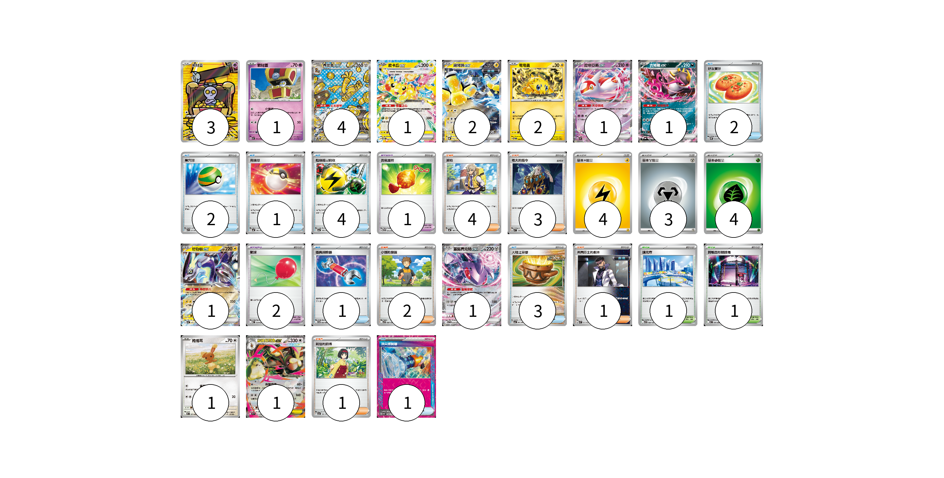 牌組構築方案 以此牌組為基礎新構築牌組 顯示卡面 顯示列表 寶可夢卡(19) 3 1 4 1 2 2 1 1 1 1 1 1 寶可夢道具(3) 1 2 物品卡(14) 2 2 1 4 1 3 1 支援者卡(11) 4 3 2 1 1 競技場卡(2) 1 1 能量卡(11) 4 3 4 寶可夢卡(19) 卡牌名稱 張數 卡牌名稱 張數 索財靈 SV3a 068/062 03 索財靈 SV7a 024/064 01 賽富豪ex SV8a 220/187 04 皮卡丘ex SV8 033/106 01 鐵臂膀ex SV8a 054/187 02 電電蟲 SV7 032/102 02 拉帝亞斯ex SV7a 019/064 01 吉雉雞ex SV8a 104/187 01 密勒頓ex SV4a 071/190 01 蓋諾賽克特ex SV11B 069/086 01 捲捲耳 M2 071/080 01 超級長耳兔ex M2 072/080 01 寶可夢道具(3) 卡牌名稱 張數 卡牌名稱 張數 勇氣護符 SVTR 015/021 01 氣球 MBD 018/022 02 物品卡(14) 卡牌名稱 張數 卡牌名稱 張數 好友寶芬 SV5K 063/071 02 巢穴球 SVHM 012/022 02 高級球 SV4a 161/190 01 超級能量回收 SV4a 157/190 04 道具拆除器 SV11W 080/086 01 大地之容器 SV4K 060/066 03 頂尖捕捉器 SV8a 148/187 01 支援者卡(11) 卡牌名稱 張數 卡牌名稱 張數 派帕 SV4a 180/190 04 老大的指令 SVM 172/175 03 小剛的發掘 SV9 096/100 02 弗圖博士的劇本 SVK 034/042 01 莉佳的招待 SV2a 161/165 01 競技場卡(2) 卡牌名稱 張數 卡牌名稱 張數 釀光市 SV9 098/100 01 對戰圓形競技場 M2 079/080 01 能量卡(11) 卡牌名稱 張數 卡牌名稱 張數 基本【雷】能量 SVTR LIG 04 基本【鋼】能量 SVTH MET 03 基本【草】能量 SVTM GRA 04 以此牌組為基礎新構築牌組 牌組編碼 tkDWyA-uvdEHv-HifYYz copy 列印牌組單 牌組編碼已複製 分享至SNS