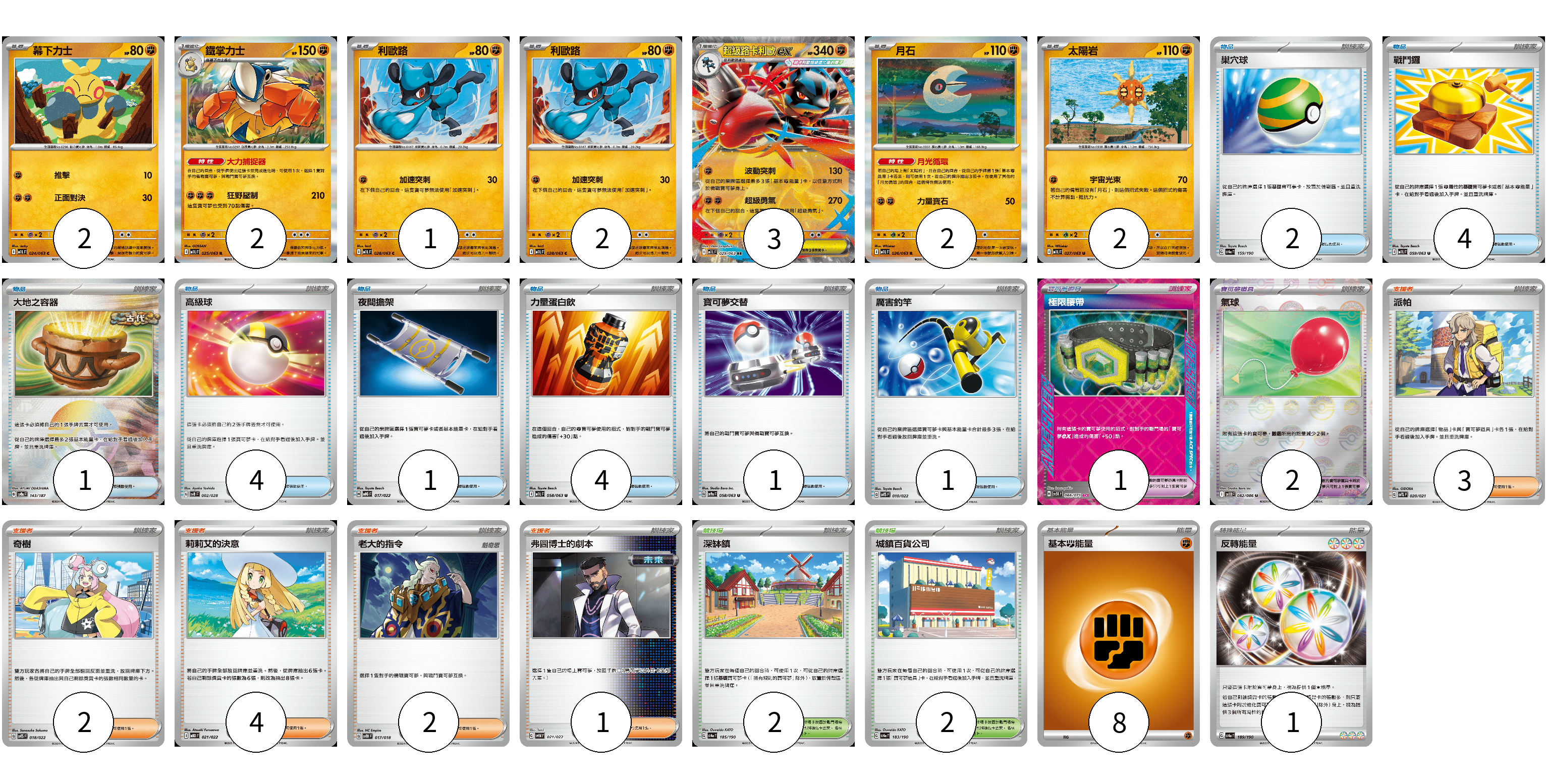 牌組構築方案 以此牌組為基礎新構築牌組 顯示卡面 顯示列表 寶可夢卡(14) 2 2 1 2 3 2 2 寶可夢道具(3) 1 2 物品卡(18) 2 4 1 4 1 4 1 1 支援者卡(12) 3 2 4 2 1 競技場卡(4) 2 2 能量卡(9) 8 1 寶可夢卡(14) 卡牌名稱 張數 卡牌名稱 張數 幕下力士 M1L 024/063 02 鐵掌力士 M1L 025/063 02 利歐路 M1L 028/063 01 利歐路 M1L 028/063 02 超級路卡利歐ex M1L 029/063 03 月石 M1L 026/063 02 太陽岩 M1L 027/063 02 寶可夢道具(3) 卡牌名稱 張數 卡牌名稱 張數 極限腰帶 SV5K 066/071 01 氣球 SV11B 082/086 02 物品卡(18) 卡牌名稱 張數 卡牌名稱 張數 巢穴球 SV4a 159/190 02 戰鬥鑼 M1L 059/063 04 大地之容器 SV8a 143/187 01 高級球 SVB 002/028 04 夜間擔架 MBG 017/022 01 力量蛋白飲 M1L 058/063 04 寶可夢交替 SV9a 058/063 01 厲害釣竿 SVTS 010/022 01 支援者卡(12) 卡牌名稱 張數 卡牌名稱 張數 派帕 SVTL 020/021 03 奇樹 SVTS 018/022 02 莉莉艾的決意 MBD 021/022 04 老大的指令 SVTH 017/018 02 弗圖博士的劇本 SVHM 021/022 01 競技場卡(4) 卡牌名稱 張數 卡牌名稱 張數 深缽鎮 SV4a 185/190 02 城鎮百貨公司 SV4a 183/190 02 能量卡(9) 卡牌名稱 張數 卡牌名稱 張數 基本【鬥】能量 SVAM FIG 08 反轉能量 SV4a 189/190 01 以此牌組為基礎新構築牌組 牌組編碼 tkJEGN-vGalvR-QnFkpL copy 列印牌組單 牌組編碼已複製 分享至SNS