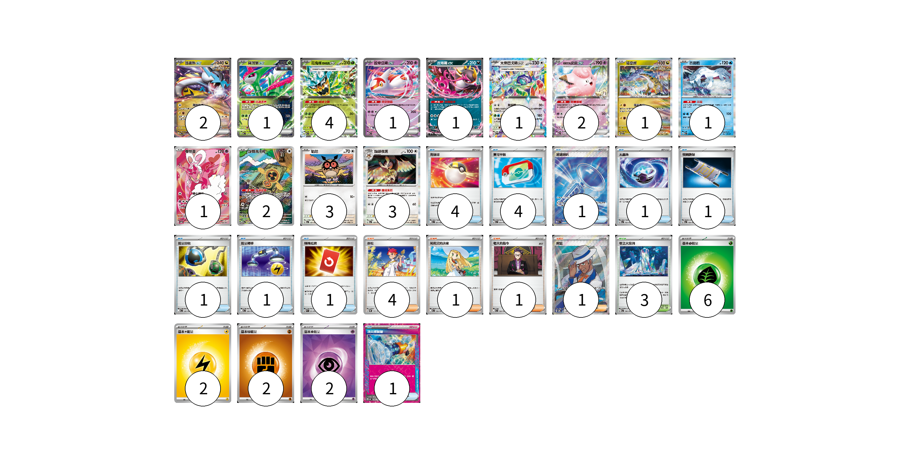 牌組構築方案 以此牌組為基礎新構築牌組 顯示卡面 顯示列表 寶可夢卡(23) 2 1 4 1 1 1 2 1 1 1 2 3 3 物品卡(15) 4 4 1 1 1 1 1 1 1 支援者卡(7) 4 1 1 1 競技場卡(3) 3 能量卡(12) 6 2 2 2 寶可夢卡(23) 卡牌名稱 張數 卡牌名稱 張數 猛雷鼓ex MC 554/742 02 鐵斑葉ex MC 077/742 01 厄鬼椪 碧草面具ex MC 082/742 04 拉帝亞斯ex MC 312/742 01 吉雉雞ex MC 489/742 01 太樂巴戈斯ex MC 630/742 01 莉莉艾的皮皮ex M2a 060/193 02 猛雷鼓 SV7 075/102 01 古劍豹 M2a 043/193 01 眷戀雲 SV5a 074/066 01 旋轉洛托姆 M2a 213/193 02 咕咕 M2a 137/193 03 貓頭夜鷹 M2a 138/193 03 物品卡(15) 卡牌名稱 張數 卡牌名稱 張數 高級球 MC 651/742 04 寶可平板 MC 662/742 04 玻璃喇叭 M2a 215/193 01 太晶珠 M2a 152/193 01 夜間擔架 M2a 159/193 01 能量回收 MC 636/742 01 能量轉移 MC 638/742 01 特殊紅牌 M4 072/083 01 頂尖捕捉器 SV8a 148/187 01 支援者卡(7) 卡牌名稱 張數 卡牌名稱 張數 赤松 SV8a 163/187 04 莉莉艾的決意 MC 729/742 01 老大的指令 MC 724/742 01 席藍 SV8 127/106 01 競技場卡(3) 卡牌名稱 張數 卡牌名稱 張數 零之大空洞 M2a 184/193 03 能量卡(12) 卡牌名稱 張數 卡牌名稱 張數 基本【草】能量 MJ GRA 06 基本【雷】能量 MJ LIG 02 基本【鬥】能量 MC FIG 02 基本【超】能量 SVOD PSY 02 以此牌組為基礎新構築牌組 牌組編碼 toJTFE-OQasSw-tuOmze copy 列印牌組單 牌組編碼已複製 分享至SNS