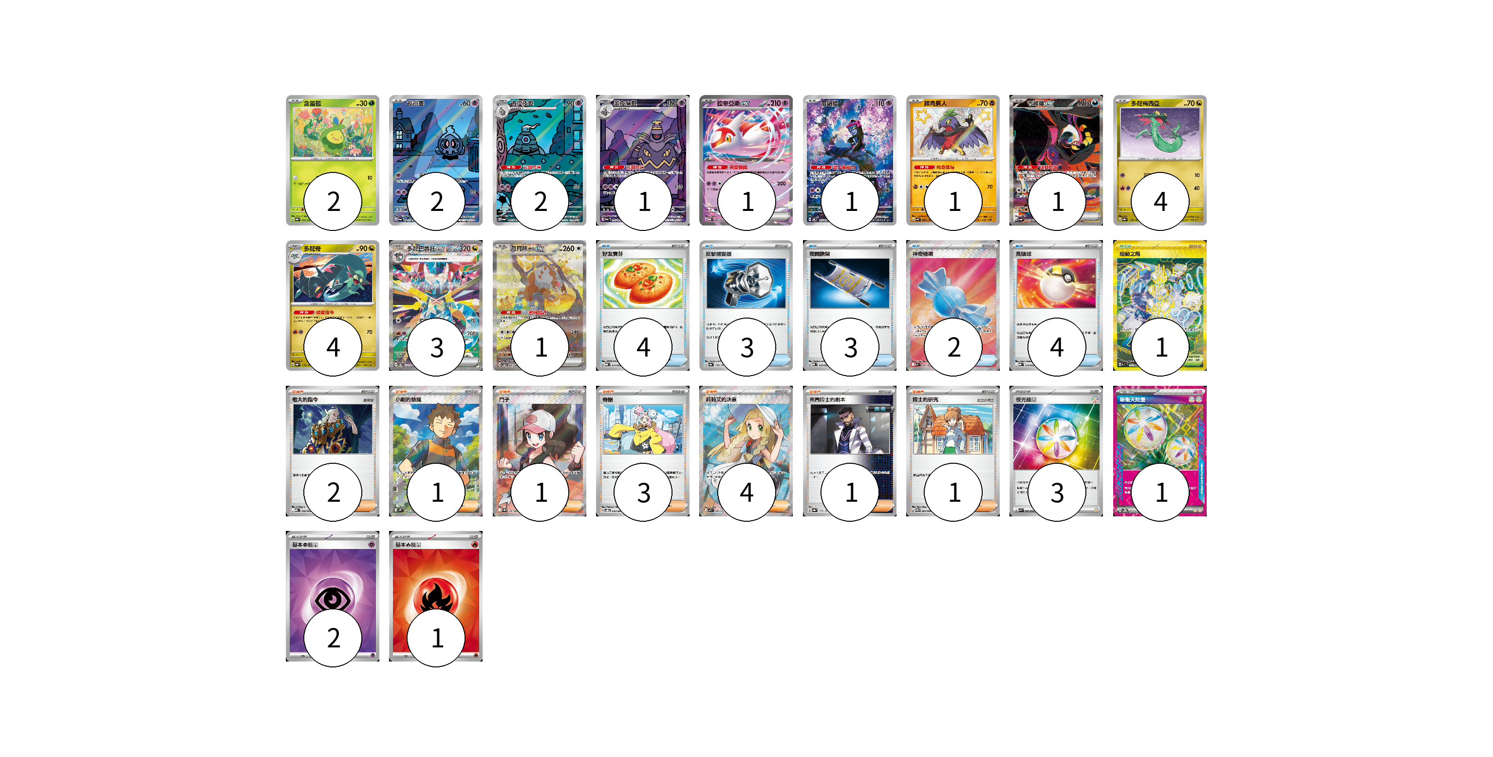 牌組構築方案 以此牌組為基礎新構築牌組 顯示卡面 顯示列表 寶可夢卡(23) 2 2 2 1 1 1 1 1 4 4 3 1 物品卡(16) 4 3 3 2 4 支援者卡(13) 2 1 1 3 4 1 1 競技場卡(1) 1 能量卡(7) 3 1 2 1 寶可夢卡(23) 卡牌名稱 張數 卡牌名稱 張數 含羞苞 SV8a 001/187 02 夜巡靈 SV6a 068/064 02 彷徨夜靈 SV6a 069/064 02 黑夜魔靈 SV6a 070/064 01 拉帝亞斯ex MBD 003/022 01 願增猿 SV6 107/101 01 摔角鷹人 SV4a 282/190 01 吉雉雞ex SV6a 089/064 01 多龍梅西亞 SV8a 118/187 04 多龍奇 SV8a 119/187 04 多龍巴魯托ex SV8a 221/187 03 月月熊 赫月 ex SV5a 091/066 01 物品卡(16) 卡牌名稱 張數 卡牌名稱 張數 好友寶芬 MBG 011/022 04 反擊捕捉器 SV8a 139/187 03 夜間擔架 MBD 016/022 03 神奇糖果 M1S 082/063 02 高級球 MBD 014/022 04 支援者卡(13) 卡牌名稱 張數 卡牌名稱 張數 老大的指令 MBD 020/022 02 小剛的發掘 SV9 123/100 01 鬥子 SV11W 166/086 01 奇樹 SVOD 016/020 03 莉莉艾的決意 M1L 086/063 04 弗圖博士的劇本 SV8a 175/187 01 博士的研究 SV11B 084/086 01 競技場卡(1) 卡牌名稱 張數 卡牌名稱 張數 阻礙之塔 SV10 132/098 01 能量卡(7) 卡牌名稱 張數 卡牌名稱 張數 夜光能量 SVK 042/042 03 新衝天能量 SV5K 071/071 01 基本【超】能量 SVOD PSY 02 基本【火】能量 SVQL FIR 01 以此牌組為基礎新構築牌組 牌組編碼 toeFSX-aykNYL-mcdfod copy 列印牌組單 牌組編碼已複製 分享至SNS
