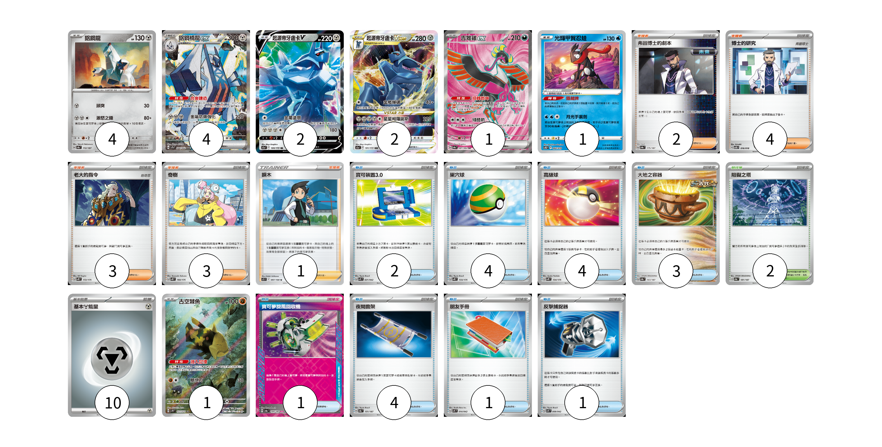 牌組構築方案 以此牌組為基礎新構築牌組 顯示卡面 顯示列表 寶可夢卡(15) 4 4 2 2 1 1 1 物品卡(20) 2 4 4 3 1 4 1 1 支援者卡(13) 2 4 3 3 1 競技場卡(2) 2 能量卡(10) 10 寶可夢卡(15) 卡牌名稱 張數 卡牌名稱 張數 鋁鋼龍 SV8a 112/187 04 鋁鋼橋龍ex SV7a 088/064 04 起源帝牙盧卡V S12a 100/172 02 起源帝牙盧卡VSTAR S12a 101/172 02 吉雉雞ex SV6a 081/064 01 光輝甲賀忍蛙 SVTG 002/019 01 古空棘魚 SV5K 077/071 01 物品卡(20) 卡牌名稱 張數 卡牌名稱 張數 寶可裝置3.0 SVK 021/042 02 巢穴球 SVM 133/175 04 高級球 SVM 134/175 04 大地之容器 SV8a 143/187 03 寶可夢旋風回收機 SV8a 149/187 01 夜間擔架 SV8a 151/187 04 朋友手冊 SVK 014/042 01 反擊捕捉器 SVK 009/042 01 支援者卡(13) 卡牌名稱 張數 卡牌名稱 張數 弗圖博士的劇本 SV8a 175/187 02 博士的研究 SVTH 016/018 04 老大的指令 SVM 172/175 03 奇樹 SVM 160/175 03 捩木 S11 097/100 01 競技場卡(2) 卡牌名稱 張數 卡牌名稱 張數 阻礙之塔 SV8a 181/187 02 能量卡(10) 卡牌名稱 張數 卡牌名稱 張數 基本鋼能量 sv-p MET 10 以此牌組為基礎新構築牌組 牌組編碼 toiJWc-vdBegg-tanSHk copy 列印牌組單 牌組編碼已複製 分享至SNS