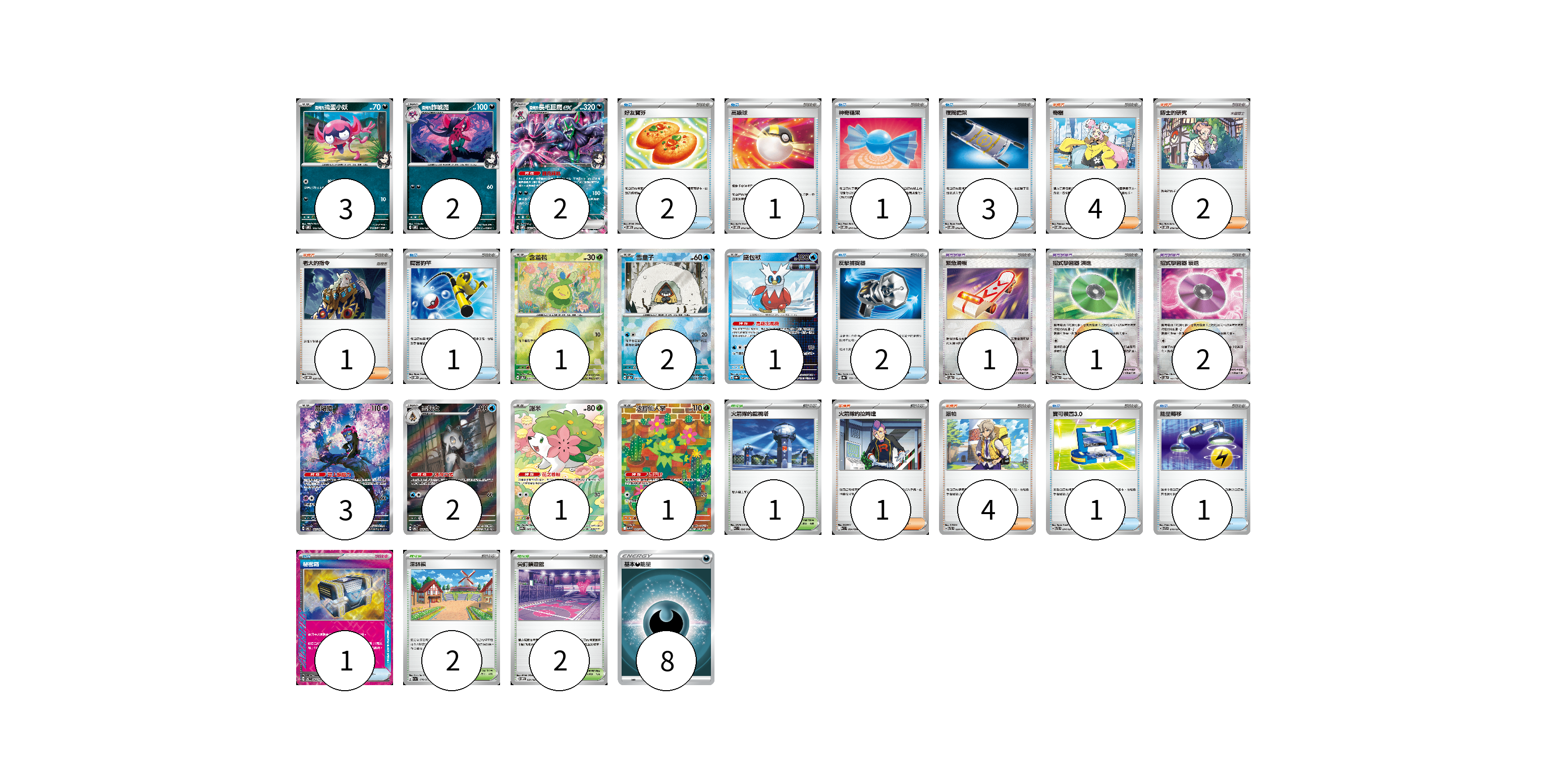 牌組構築方案 以此牌組為基礎新構築牌組 顯示卡面 顯示列表 寶可夢卡(18) 3 2 2 1 2 1 3 2 1 1 寶可夢道具(4) 1 1 2 物品卡(13) 2 1 1 3 1 2 1 1 1 支援者卡(12) 4 2 1 1 4 競技場卡(5) 1 2 2 能量卡(8) 8 寶可夢卡(18) 卡牌名稱 張數 卡牌名稱 張數 <瑪俐的>搗蛋小妖 SVOM 005/021 03 <瑪俐的>詐唬魔 SVOM 006/021 02 <瑪俐的>長毛巨魔ex SVOM 007/021 02 含羞苞 SV8a 001/187 01 雪童子 SV8a 037/187 02 鐵包袱 SV8a 047/187 01 願增猿 SV6 107/101 03 雪妖女 SV6 104/101 02 謝米 SV9a 066/063 01 沙鈴仙人掌 SV9 101/100 01 寶可夢道具(4) 卡牌名稱 張數 卡牌名稱 張數 緊急滑板 SV8a 153/187 01 招式學習器 演進 SV8a 160/187 01 招式學習器 衰退 SV8a 161/187 02 物品卡(13) 卡牌名稱 張數 卡牌名稱 張數 好友寶芬 SVOM 012/021 02 高級球 SVOM 013/021 01 神奇糖果 SVOM 014/021 01 夜間擔架 SVOM 016/021 03 厲害釣竿 SVOM 011/021 01 反擊捕捉器 SV8a 139/187 02 寶可裝置3.0 SVTL 014/021 01 能量轉移 SVTR 010/021 01 秘密箱 SV6 092/101 01 支援者卡(12) 卡牌名稱 張數 卡牌名稱 張數 奇樹 SVOM 018/021 04 博士的研究 SVOM 019/021 02 老大的指令 SVOM 020/021 01 火箭隊的拉姆達 SV10 094/098 01 派帕 SVTL 020/021 04 競技場卡(5) 卡牌名稱 張數 卡牌名稱 張數 火箭隊的監視塔 SV10 096/098 01 深缽鎮 SV1a 070/073 02 尖釘鎮道館 SVOM 021/021 02 能量卡(8) 卡牌名稱 張數 卡牌名稱 張數 基本惡能量 SLD DAR 08 以此牌組為基礎新構築牌組 牌組編碼 tpJLtG-IryXke-fteoGD copy 列印牌組單 牌組編碼已複製 分享至SNS