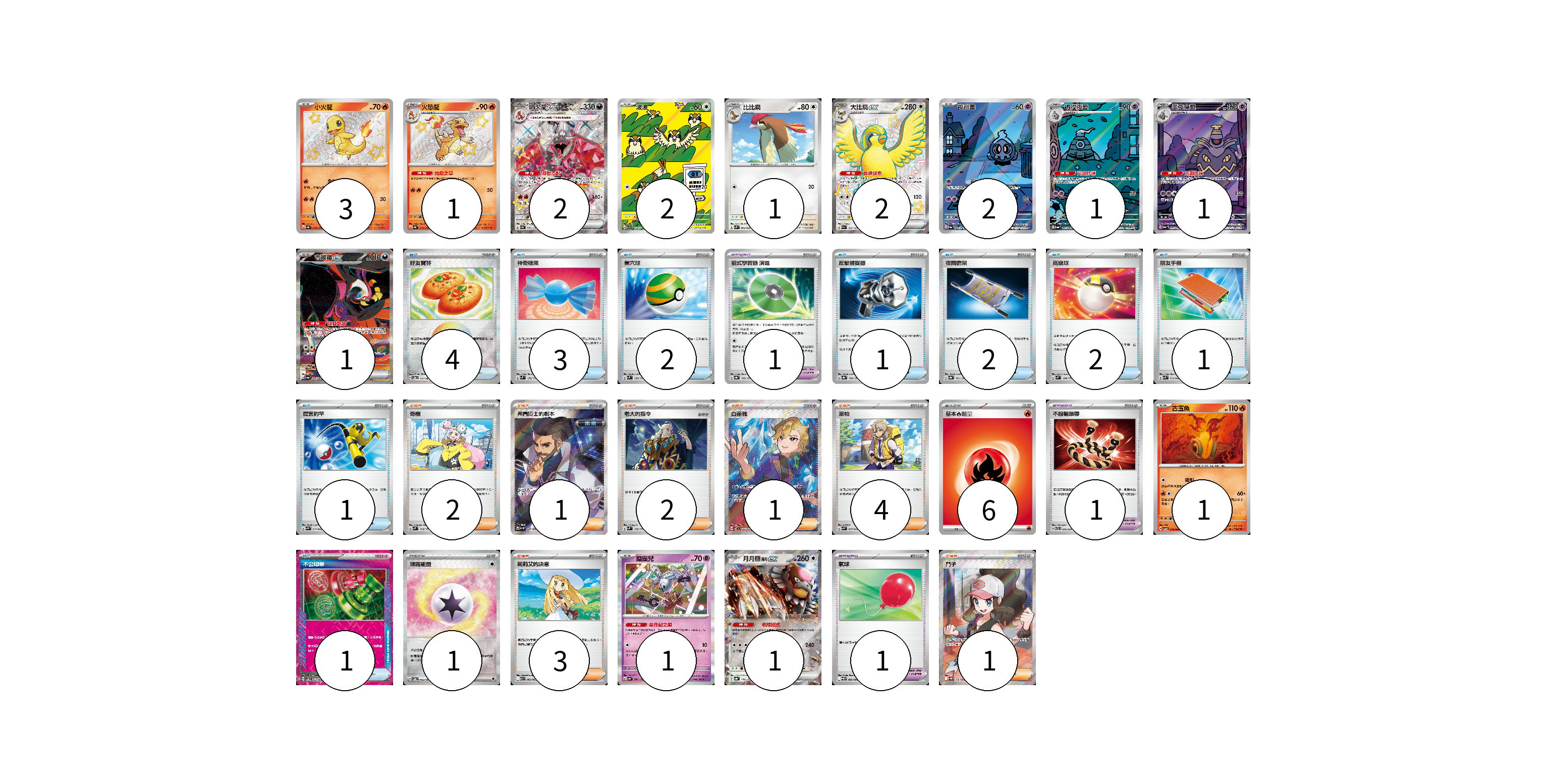 牌組構築方案 以此牌組為基礎新構築牌組 顯示卡面 顯示列表 寶可夢卡(19) 3 1 2 2 1 2 2 1 1 1 1 1 1 寶可夢道具(3) 1 1 1 物品卡(17) 4 3 2 1 2 2 1 1 1 支援者卡(14) 2 1 2 1 4 3 1 能量卡(7) 6 1 寶可夢卡(19) 卡牌名稱 張數 卡牌名稱 張數 小火龍 SV4a 210/190 03 火恐龍 SV4a 211/190 01 噴火龍ex SV4a 331/190 02 波波 SV3 118/108 02 比比鳥 SVK 004/042 01 大比鳥ex SV4a 335/190 02 夜巡靈 SV6a 068/064 02 彷徨夜靈 SV6a 069/064 01 黑夜魔靈 SV6a 070/064 01 吉雉雞ex SV6a 089/064 01 古玉魚 SV5a 018/066 01 鑰圈兒 SV4a 087/190 01 月月熊 赫月ex SV8a 134/187 01 寶可夢道具(3) 卡牌名稱 張數 卡牌名稱 張數 招式學習器 演進 SV8a 160/187 01 不服輸頭帶 SVTL 016/021 01 氣球 SV11B 082/086 01 物品卡(17) 卡牌名稱 張數 卡牌名稱 張數 好友寶芬 SV8a 147/187 04 神奇糖果 SVM 135/175 03 巢穴球 SVM 133/175 02 反擊捕捉器 SV8a 139/187 01 夜間擔架 SV8a 151/187 02 高級球 SVM 134/175 02 朋友手冊 SVK 014/042 01 厲害釣竿 SVK 011/042 01 不公印章 SV5a 053/066 01 支援者卡(14) 卡牌名稱 張數 卡牌名稱 張數 奇樹 SVM 160/175 02 弗圖博士的劇本 SV4M 086/066 01 老大的指令 SVM 172/175 02 白蕾雅 SV7 126/102 01 派帕 SVK 035/042 04 莉莉艾的決意 M1L 062/063 03 鬥子 SV11W 166/086 01 能量卡(7) 卡牌名稱 張數 卡牌名稱 張數 基本火能量 sv-p FIR 06 薄霧能量 SV8a 186/187 01 以此牌組為基礎新構築牌組 牌組編碼 tqRUyY-dUubFs-fIUhuk copy 列印牌組單 牌組編碼已複製 分享至SNS
