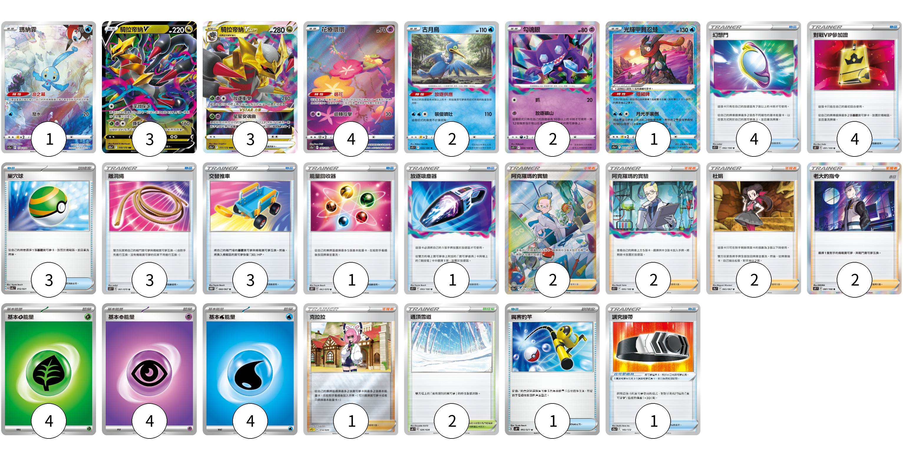 牌組構築方案 以此牌組為基礎新構築牌組 顯示卡面 顯示列表 寶可夢卡(16) 1 3 3 4 2 2 1 寶可夢道具(1) 1 物品卡(20) 4 4 3 3 3 1 1 1 支援者卡(9) 2 2 2 2 1 競技場卡(2) 2 能量卡(12) 4 4 4 寶可夢卡(16) 卡牌名稱 張數 卡牌名稱 張數 瑪納霏 S12a 178/172 01 騎拉帝納V S12a 110/172 03 騎拉帝納VSTAR S12a 111/172 03 花療環環 S12a 187/172 04 古月鳥 S11 033/100 02 勾魂眼 S11 044/100 02 光輝甲賀忍蛙 S12a 033/172 01 寶可夢道具(1) 卡牌名稱 張數 卡牌名稱 張數 講究腰帶 S12a 145/172 01 物品卡(20) 卡牌名稱 張數 卡牌名稱 張數 幻想門 S11 092/100 04 對戰VIP參加證 S8 091/100 04 巢穴球 SVAL 012/021 03 離洞繩 S5I 061/070 03 交替推車 S10D 060/067 03 能量回收器 S5R 062/070 01 放逐吸塵器 S11 093/100 01 厲害釣竿 SV2P 066/071 01 支援者卡(9) 卡牌名稱 張數 卡牌名稱 張數 阿克羅瑪的實驗 S12a 235/172 02 阿克羅瑪的實驗 S11 095/100 02 杜娟 S9a 065/067 02 老大的指令(赤日) S9 097/100 02 克拉拉 SPZ 014/020 01 競技場卡(2) 卡牌名稱 張數 卡牌名稱 張數 通頂雪道 SVB 026/028 02 能量卡(12) 卡牌名稱 張數 卡牌名稱 張數 基本草能量 sv-p GRA 04 基本超能量 sv-p PSY 04 基本水能量 sv-p WAT 04 以此牌組為基礎新構築牌組 牌組編碼 tswAEc-ArUYcR-IcRtlH copy 列印牌組單 牌組編碼已複製 分享至SNS
