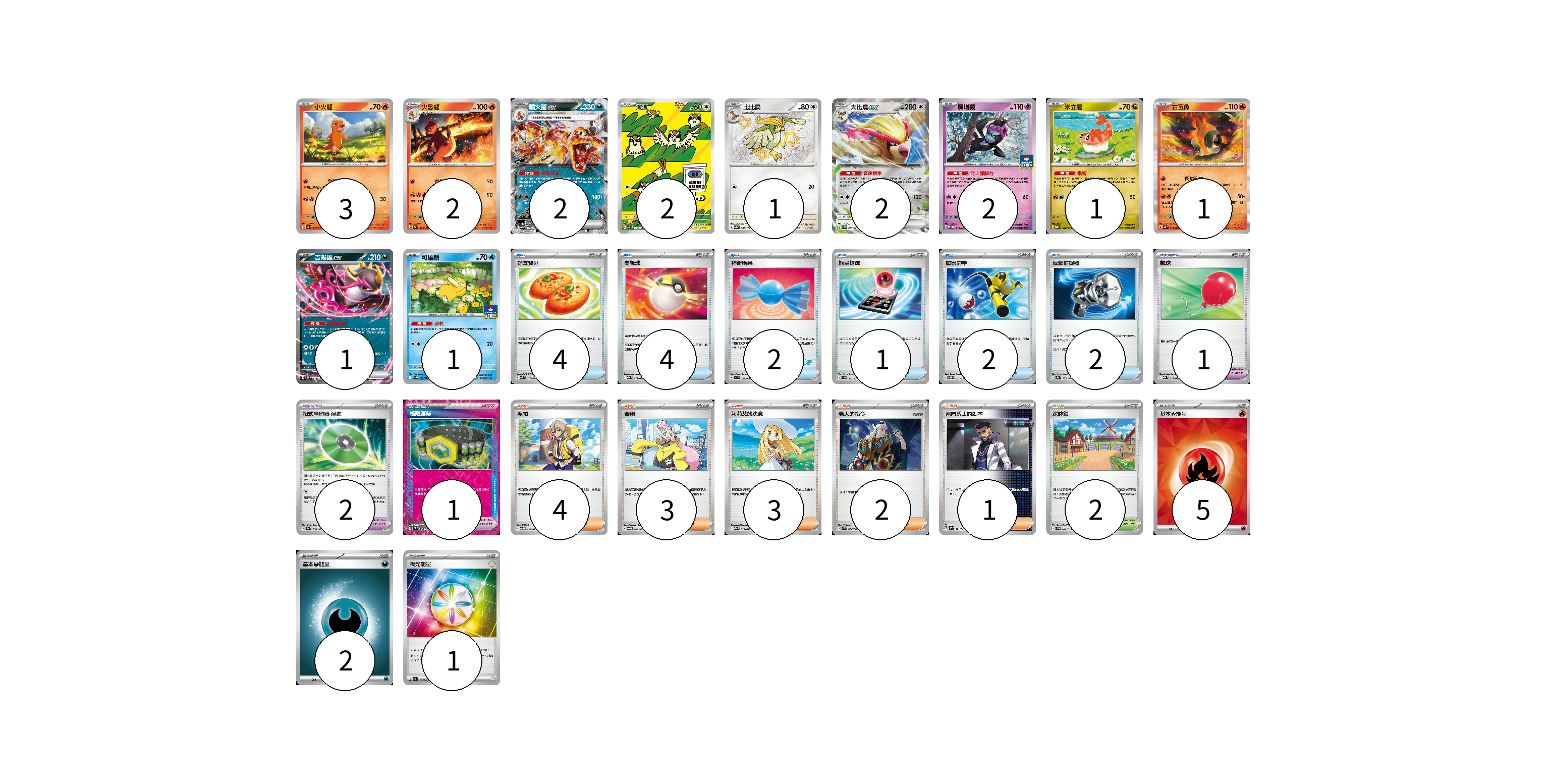 牌組構築方案 以此牌組為基礎新構築牌組 顯示卡面 顯示列表 寶可夢卡(18) 3 2 2 2 1 2 2 1 1 1 1 寶可夢道具(4) 1 2 1 物品卡(15) 4 4 2 1 2 2 支援者卡(13) 4 3 3 2 1 競技場卡(2) 2 能量卡(8) 5 2 1 寶可夢卡(18) 卡牌名稱 張數 卡牌名稱 張數 小火龍 SV4a 025/190 03 火恐龍 SV2a 005/165 02 噴火龍ex SV4a 115/190 02 波波 SV3 118/108 02 比比鳥 SV4a 305/190 01 大比鳥ex SV3 089/108 02 願增猿 M-P 014/M-P 02 米立龍 MBD 010/022 01 古玉魚 SV4K 016/066 01 吉雉雞ex SVOM 009/021 01 可達鴨 SV-P 220/SV-P 01 寶可夢道具(4) 卡牌名稱 張數 卡牌名稱 張數 氣球 MBG 019/022 01 招式學習器 演進 SV8a 160/187 02 極限腰帶 SV5K 066/071 01 物品卡(15) 卡牌名稱 張數 卡牌名稱 張數 好友寶芬 SVK 015/042 04 高級球 MBG 012/022 04 神奇糖果 SVI 053/066 02 能量輸送 SVD 112/139 01 厲害釣竿 SVOM 011/021 02 反擊捕捉器 SV8a 139/187 02 支援者卡(13) 卡牌名稱 張數 卡牌名稱 張數 派帕 SVTM 019/022 04 奇樹 SVOM 018/021 03 莉莉艾的決意 MBG 022/022 03 老大的指令 SVK 036/042 02 弗圖博士的劇本 SVHM 021/022 01 競技場卡(2) 卡牌名稱 張數 卡牌名稱 張數 深缽鎮 SVF 036/038 02 能量卡(8) 卡牌名稱 張數 卡牌名稱 張數 基本【火】能量 SVQL FIR 05 基本【惡】能量 MBG DAR 02 夜光能量 SV1a 073/073 01 以此牌組為基礎新構築牌組 牌組編碼 tubIrz-tNWuDt-CIlVoi copy 列印牌組單 牌組編碼已複製 分享至SNS