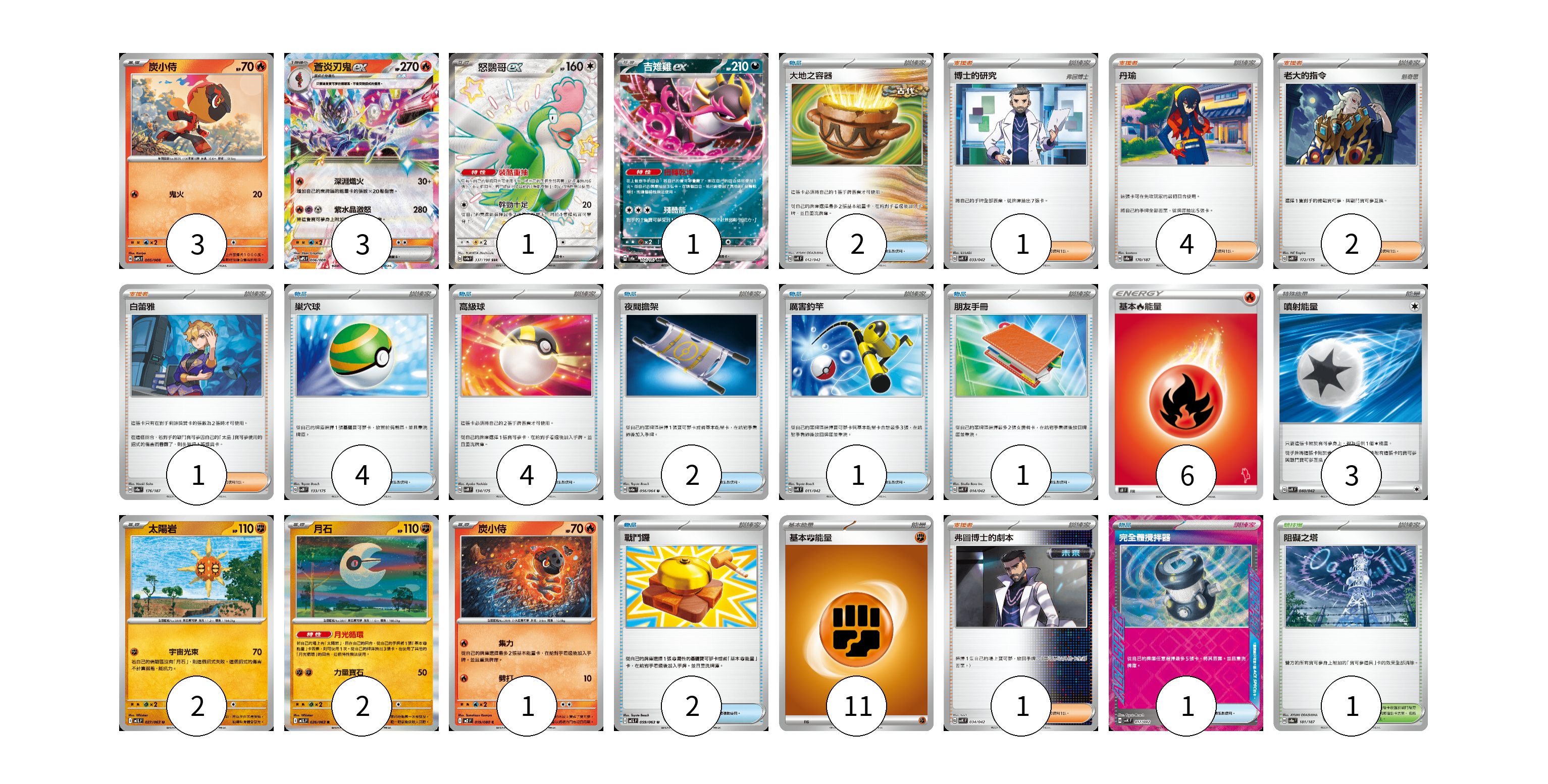 牌組構築方案 以此牌組為基礎新構築牌組 顯示卡面 顯示列表 寶可夢卡(13) 3 3 1 1 2 2 1 物品卡(17) 2 4 4 2 1 1 2 1 支援者卡(9) 1 4 2 1 1 競技場卡(1) 1 能量卡(20) 6 3 11 寶可夢卡(13) 卡牌名稱 張數 卡牌名稱 張數 炭小侍 SVPS 005/008 03 蒼炎刃鬼ex SVPS 006/008 03 怒鸚哥ex SV4a 337/190 01 吉雉雞ex SV8a 104/187 01 太陽岩 M1L 027/063 02 月石 M1L 026/063 02 炭小侍 M2 019/080 01 物品卡(17) 卡牌名稱 張數 卡牌名稱 張數 大地之容器 SVK 012/042 02 巢穴球 SVM 133/175 04 高級球 SVM 134/175 04 夜間擔架 SV6a 056/064 02 厲害釣竿 SVK 011/042 01 朋友手冊 SVK 014/042 01 戰鬥鑼 M1L 059/063 02 完全體攪拌器 SVK 017/042 01 支援者卡(9) 卡牌名稱 張數 卡牌名稱 張數 博士的研究 SVK 033/042 01 丹瑜 SV8a 170/187 04 老大的指令 SVM 172/175 02 白蕾雅 SV8a 176/187 01 弗圖博士的劇本 SVK 034/042 01 競技場卡(1) 卡牌名稱 張數 卡牌名稱 張數 阻礙之塔 SV8a 181/187 01 能量卡(20) 卡牌名稱 張數 卡牌名稱 張數 基本火能量 SH FIR 06 噴射能量 SVK 040/042 03 基本鬥能量 sv-p FIG 11 以此牌組為基礎新構築牌組 牌組編碼 tvQruf-jywMZZ-AUciJV copy 列印牌組單 牌組編碼已複製 分享至SNS