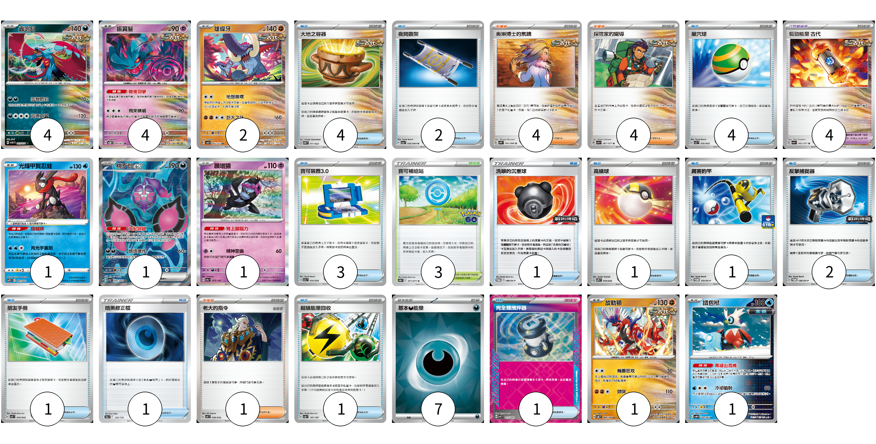 牌組構築方案 以此牌組為基礎新構築牌組 顯示卡面 顯示列表 寶可夢卡(15) 4 4 2 1 1 1 1 1 寶可夢道具(4) 4 物品卡(22) 4 2 4 3 1 1 1 2 1 1 1 1 支援者卡(9) 4 4 1 競技場卡(3) 3 能量卡(7) 7 寶可夢卡(15) 卡牌名稱 張數 卡牌名稱 張數 轟鳴月 SV5K 051/071 04 振翼髮 SV5K 033/071 04 雄偉牙 SV5K 042/071 02 光輝甲賀忍蛙 SVTS 001/022 01 桃歹郎ex SV6a 082/064 01 願增猿 SV8a 075/187 01 故勒頓 SV8 069/106 01 鐵包袱 SV4M 020/066 01 寶可夢道具(4) 卡牌名稱 張數 卡牌名稱 張數 驅勁能量 古代 SV5K 065/071 04 物品卡(22) 卡牌名稱 張數 卡牌名稱 張數 大地之容器 SVTS 011/022 04 夜間擔架 SV6a 056/064 02 巢穴球 SVK 016/042 04 寶可裝置3.0 SVEL 014/020 03 洗翠的沉重球 SV-P 138/SV-P 01 高級球 SVTS 014/022 01 厲害釣竿 SV-P 112/SV-P 01 反擊捕捉器 SV-P 136/SV-P 02 朋友手冊 SVK 014/042 01 暗黑修正檔 S12a 135/172 01 超級能量回收 SV8a 141/187 01 完全體攪拌器 SVK 017/042 01 支援者卡(9) 卡牌名稱 張數 卡牌名稱 張數 奧琳博士的氣魄 SV4K 064/066 04 探險家的嚮導 SV5K 067/071 04 老大的指令 SVK 036/042 01 競技場卡(3) 卡牌名稱 張數 卡牌名稱 張數 寶可補給站 S10b 071/071 03 能量卡(7) 卡牌名稱 張數 卡牌名稱 張數 基本【惡】能量 SVK DAR 07 以此牌組為基礎新構築牌組 牌組編碼 tvnrHM-TYKRIG-HFSONF copy 列印牌組單 牌組編碼已複製 分享至SNS