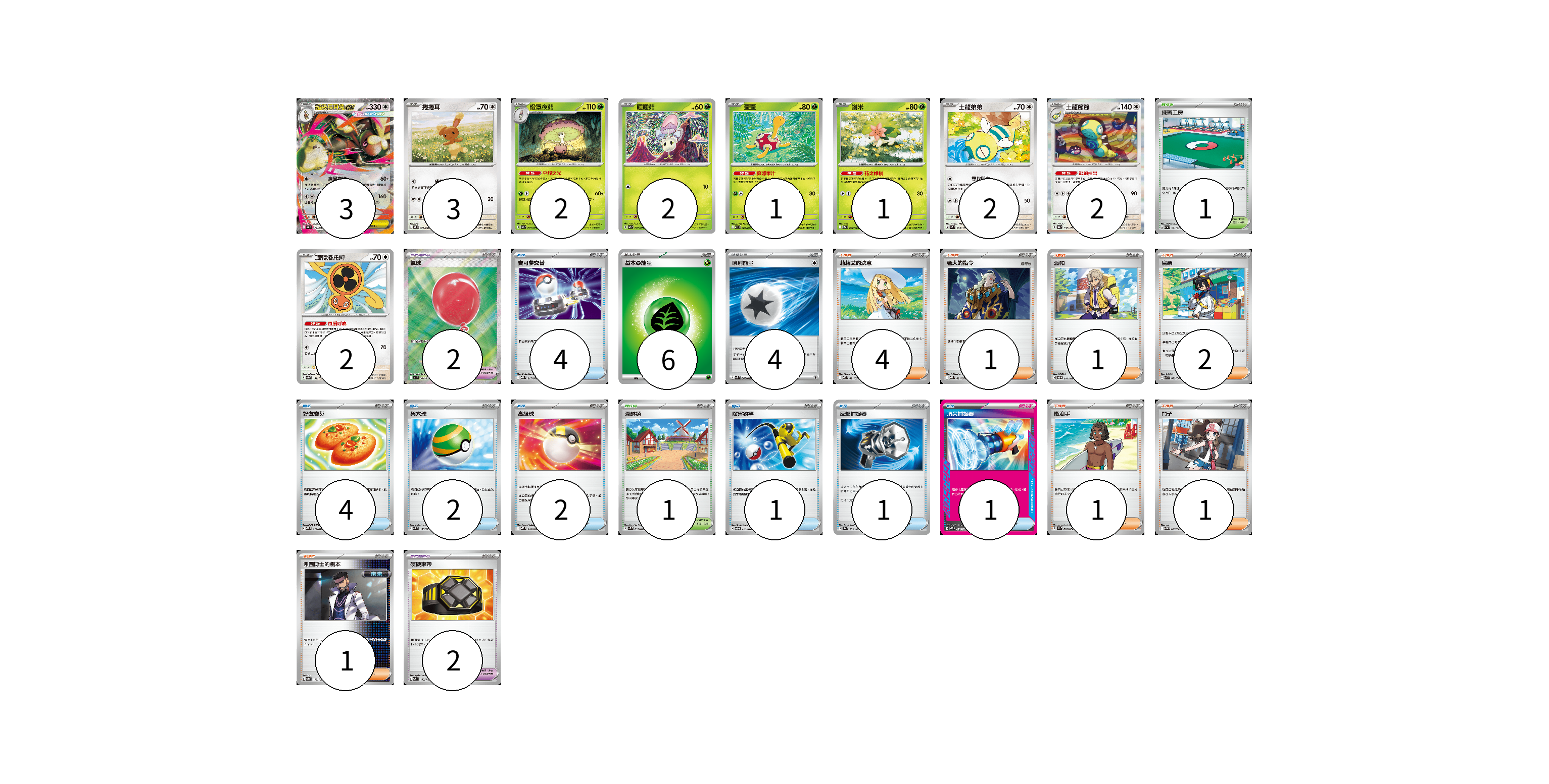 牌組構築方案 以此牌組為基礎新構築牌組 顯示卡面 顯示列表 寶可夢卡(18) 3 3 2 2 1 1 2 2 2 寶可夢道具(4) 2 2 物品卡(15) 4 4 2 2 1 1 1 支援者卡(11) 4 1 1 2 1 1 1 競技場卡(2) 1 1 能量卡(10) 6 4 寶可夢卡(18) 卡牌名稱 張數 卡牌名稱 張數 超級長耳兔ex M2 072/080 03 捲捲耳 M2 071/080 03 燈罩夜菇 SV7a 003/064 02 睡睡菇 SV7a 002/064 02 壺壺 M1S 006/063 01 謝米 SV9a 006/063 01 土龍弟弟 SVM 095/175 02 土龍節節 SV8a 130/187 02 旋轉洛托姆 SV8a 131/187 02 寶可夢道具(4) 卡牌名稱 張數 卡牌名稱 張數 氣球 M1L 084/063 02 硬硬束帶 SVM 139/175 02 物品卡(15) 卡牌名稱 張數 卡牌名稱 張數 寶可夢交替 MBG 015/022 04 好友寶芬 MBD 013/022 04 巢穴球 SVM 133/175 02 高級球 MBD 014/022 02 厲害釣竿 SVOD 010/020 01 反擊捕捉器 SV8a 139/187 01 頂尖捕捉器 MBG 014/022 01 支援者卡(11) 卡牌名稱 張數 卡牌名稱 張數 莉莉艾的決意 MBD 021/022 04 老大的指令 MBG 021/022 01 派帕 SVOD 018/020 01 烏栗 SVK 029/042 02 衝浪手 SV7a 061/064 01 鬥子 SV11W 085/086 01 弗圖博士的劇本 SV8a 175/187 01 競技場卡(2) 卡牌名稱 張數 卡牌名稱 張數 練習工房 SV1a 071/073 01 深缽鎮 SVK 039/042 01 能量卡(10) 卡牌名稱 張數 卡牌名稱 張數 基本【草】能量 M-P GRA 06 噴射能量 SVK 040/042 04 以此牌組為基礎新構築牌組 牌組編碼 twFVde-vQfLMy-MpAvpx copy 列印牌組單 牌組編碼已複製 分享至SNS