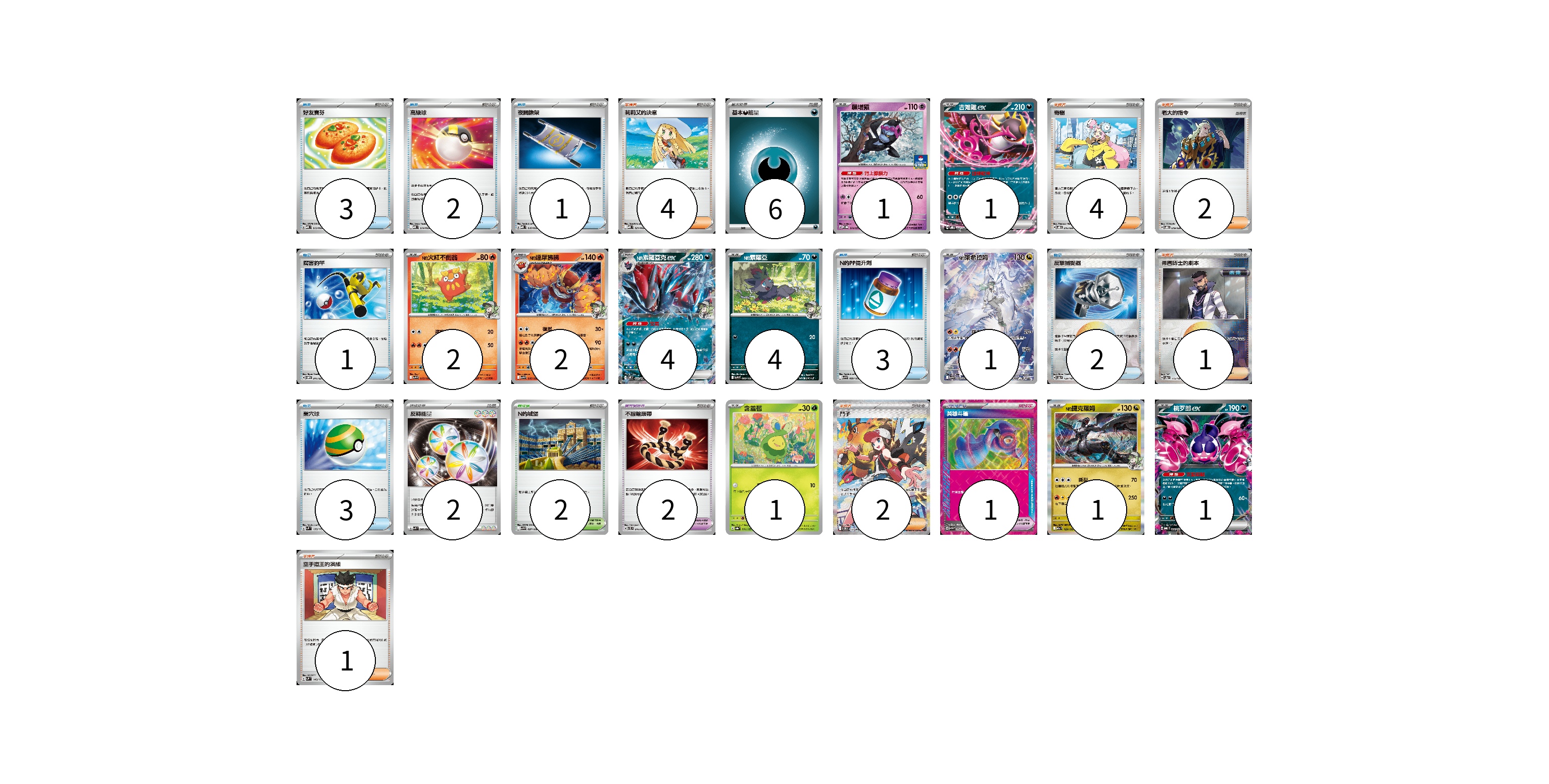 牌組構築方案 以此牌組為基礎新構築牌組 顯示卡面 顯示列表 寶可夢卡(18) 1 1 2 2 4 4 1 1 1 1 寶可夢道具(3) 2 1 物品卡(15) 3 2 1 1 3 2 3 支援者卡(14) 4 4 2 1 2 1 競技場卡(2) 2 能量卡(8) 6 2 寶可夢卡(18) 卡牌名稱 張數 卡牌名稱 張數 願增猿 M-P 014/M-P 01 吉雉雞ex SVOD 004/020 01 N的火紅不倒翁 SV9 015/100 02 N的達摩狒狒 SV9 016/100 02 N的索羅亞克ex SV9 061/100 04 N的索羅亞 SV9 060/100 04 N的萊希拉姆 SV9 109/100 01 含羞苞 SV8a 001/187 01 N的捷克羅姆 M2a 129/193 01 桃歹郎ex MBG 009/022 01 寶可夢道具(3) 卡牌名稱 張數 卡牌名稱 張數 不服輸頭帶 SVTL 016/021 02 英雄斗篷 SV5M 064/071 01 物品卡(15) 卡牌名稱 張數 卡牌名稱 張數 好友寶芬 MBD 013/022 03 高級球 MBD 014/022 02 夜間擔架 MBD 016/022 01 厲害釣竿 SVOM 011/021 01 N的PP提升劑 SV9 089/100 03 反擊捕捉器 SV8a 139/187 02 巢穴球 SVM 133/175 03 支援者卡(14) 卡牌名稱 張數 卡牌名稱 張數 莉莉艾的決意 MBD 021/022 04 奇樹 SVOD 016/020 04 老大的指令 SVOD 019/020 02 弗圖博士的劇本 SV8a 175/187 01 鬥子 SV11W 173/086 02 空手道王的演練 SVM 143/175 01 競技場卡(2) 卡牌名稱 張數 卡牌名稱 張數 N的城堡 SV9 097/100 02 能量卡(8) 卡牌名稱 張數 卡牌名稱 張數 基本【惡】能量 MBG DAR 06 反轉能量 SVK 041/042 02 以此牌組為基礎新構築牌組 牌組編碼 twMKbT-XSpIMj-WNQCnH copy 列印牌組單 牌組編碼已複製 分享至SNS