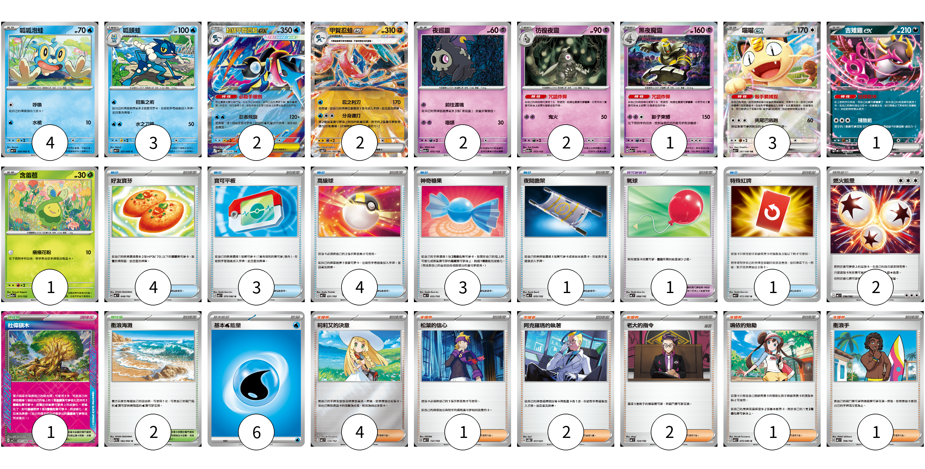牌組構築方案 以此牌組為基礎新構築牌組 顯示卡面 顯示列表 寶可夢卡(21) 4 3 2 2 2 2 1 3 1 1 寶可夢道具(1) 1 物品卡(16) 4 3 4 3 1 1 支援者卡(11) 4 1 2 2 1 1 競技場卡(3) 1 2 能量卡(8) 2 6 寶可夢卡(21) 卡牌名稱 張數 卡牌名稱 張數 呱呱泡蛙 M4 020/083 04 呱頭蛙 M4 021/083 03 超級甲賀忍蛙ex M4 022/083 02 甲賀忍蛙ex SV5a 045/066 02 夜巡靈 M2a 072/193 02 彷徨夜靈 M2a 073/193 02 黑夜魔靈 M2a 074/193 01 喵喵ex M3 061/080 03 吉雉雞ex MC 489/742 01 含羞苞 M2a 011/193 01 寶可夢道具(1) 卡牌名稱 張數 卡牌名稱 張數 氣球 MC 688/742 01 物品卡(16) 卡牌名稱 張數 卡牌名稱 張數 好友寶芬 MC 648/742 04 寶可平板 M3 070/080 03 高級球 MC 651/742 04 神奇糖果 MC 655/742 03 夜間擔架 MC 670/742 01 特殊紅牌 M4 072/083 01 支援者卡(11) 卡牌名稱 張數 卡牌名稱 張數 莉莉艾的決意 MC 729/742 04 松葉的信心 MC 727/742 01 阿克羅瑪的執著 SVOM 017/021 02 老大的指令 MC 724/742 02 鳴依的勉勵 M3 075/080 01 衝浪手 MC 708/742 01 競技場卡(3) 卡牌名稱 張數 卡牌名稱 張數 壯偉碩木 SV7 101/102 01 衝浪海灘 M1S 062/063 02 能量卡(8) 卡牌名稱 張數 卡牌名稱 張數 燃火能量 MC 736/742 02 基本水能量 sv-p WAT 06 以此牌組為基礎新構築牌組 牌組編碼 twMcNi-kscbFO-SHGMdV copy 列印牌組單 牌組編碼已複製 分享至SNS
