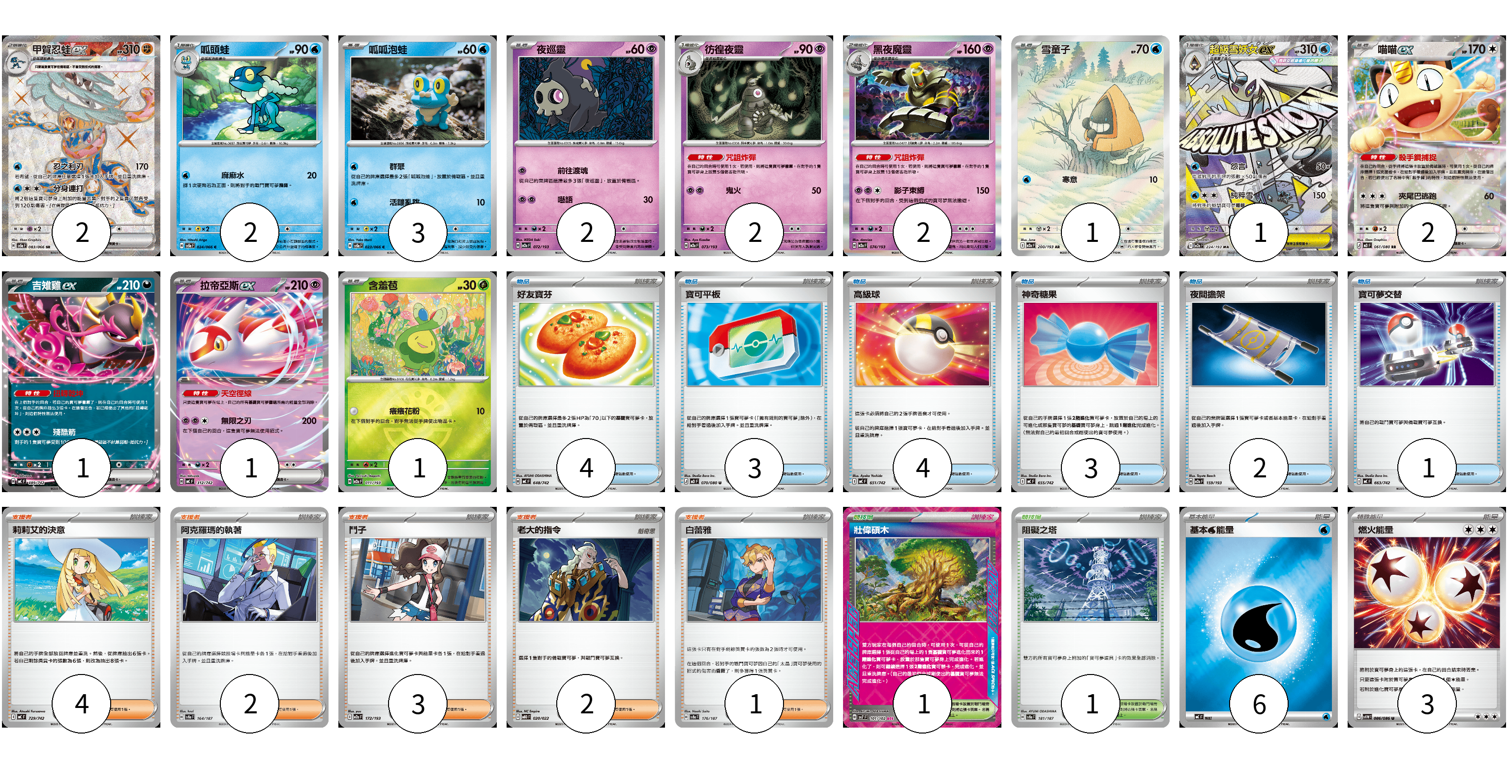 牌組構築方案 以此牌組為基礎新構築牌組 顯示卡面 顯示列表 寶可夢卡(20) 2 2 3 2 2 2 1 1 2 1 1 1 物品卡(17) 4 3 4 3 2 1 支援者卡(12) 4 2 3 2 1 競技場卡(2) 1 1 能量卡(9) 6 3 寶可夢卡(20) 卡牌名稱 張數 卡牌名稱 張數 甲賀忍蛙ex SV5a 083/066 02 呱頭蛙 SV5a 024/066 02 呱呱泡蛙 SV5a 023/066 03 夜巡靈 M2a 072/193 02 彷徨夜靈 M2a 073/193 02 黑夜魔靈 M2a 074/193 02 雪童子 M2a 200/193 01 超級雪妖女ex M2a 224/193 01 喵喵ex M3 061/080 02 吉雉雞ex MC 489/742 01 拉帝亞斯ex MC 312/742 01 含羞苞 M2a 011/193 01 物品卡(17) 卡牌名稱 張數 卡牌名稱 張數 好友寶芬 MC 648/742 04 寶可平板 M3 070/080 03 高級球 MC 651/742 04 神奇糖果 MC 655/742 03 夜間擔架 M2a 159/193 02 寶可夢交替 MC 663/742 01 支援者卡(12) 卡牌名稱 張數 卡牌名稱 張數 莉莉艾的決意 MC 729/742 04 阿克羅瑪的執著 SV8a 164/187 02 鬥子 M2a 172/193 03 老大的指令 MBD 020/022 02 白蕾雅 SV8a 176/187 01 競技場卡(2) 卡牌名稱 張數 卡牌名稱 張數 壯偉碩木 SV7 101/102 01 阻礙之塔 SV8a 181/187 01 能量卡(9) 卡牌名稱 張數 卡牌名稱 張數 基本【水】能量 MC WAT 06 燃火能量 SV11W 086/086 03 以此牌組為基礎新構築牌組 牌組編碼 txSdwG-yoerWi-yytqad copy 列印牌組單 牌組編碼已複製 分享至SNS