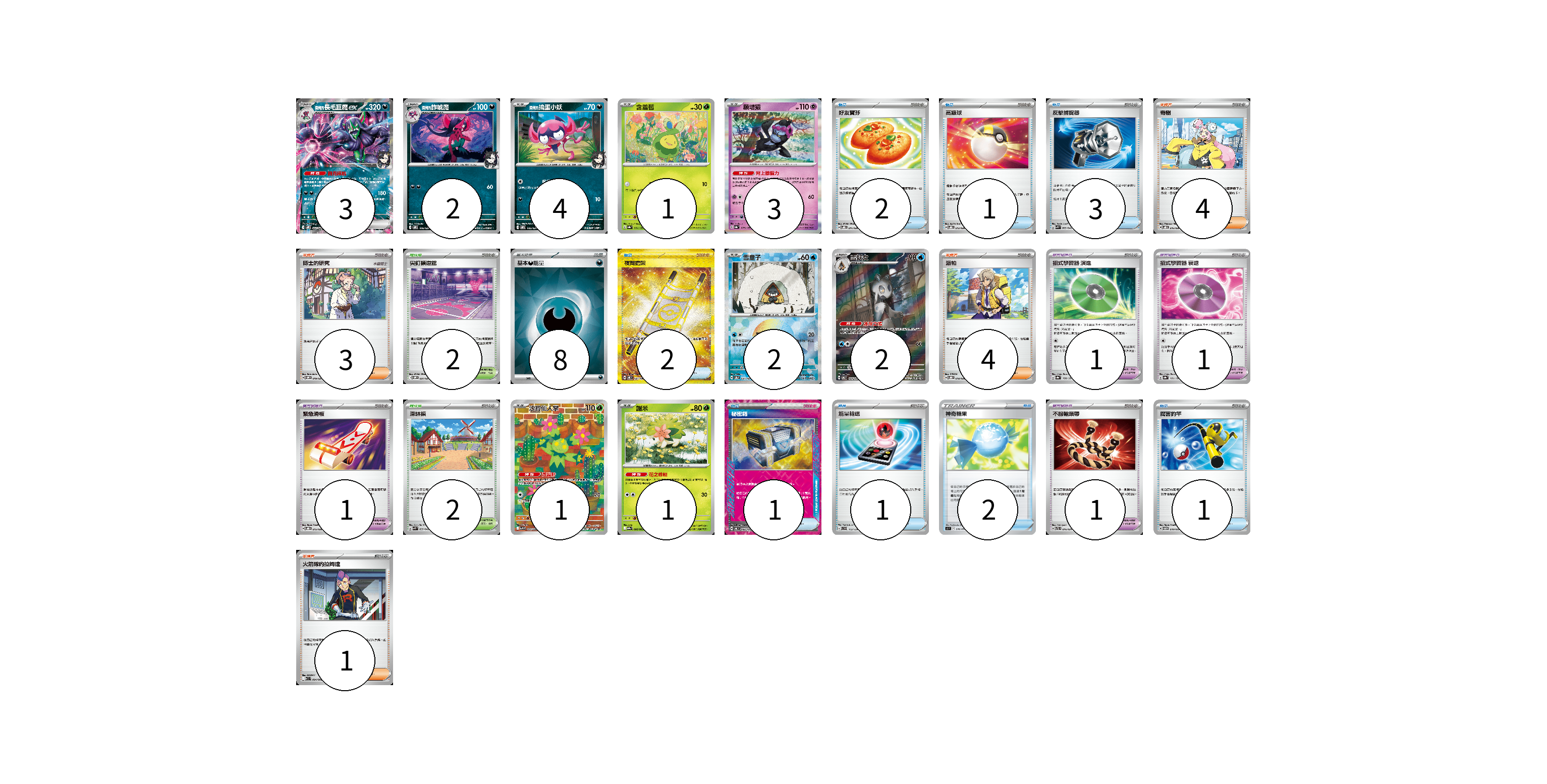 牌組構築方案 以此牌組為基礎新構築牌組 顯示卡面 顯示列表 寶可夢卡(19) 3 2 4 1 3 2 2 1 1 寶可夢道具(4) 1 1 1 1 物品卡(13) 2 1 3 2 1 1 2 1 支援者卡(12) 4 3 4 1 競技場卡(4) 2 2 能量卡(8) 8 寶可夢卡(19) 卡牌名稱 張數 卡牌名稱 張數 <瑪俐的>長毛巨魔ex SVOM 007/021 03 <瑪俐的>詐唬魔 SVOM 006/021 02 <瑪俐的>搗蛋小妖 SVOM 005/021 04 含羞苞 SV8a 001/187 01 願增猿 SV8a 075/187 03 雪童子 SV8a 037/187 02 雪妖女 SV6 104/101 02 沙鈴仙人掌 SV9 101/100 01 謝米 SV9a 006/063 01 寶可夢道具(4) 卡牌名稱 張數 卡牌名稱 張數 招式學習器 演進 SV8a 160/187 01 招式學習器 衰退 SV8a 161/187 01 緊急滑板 SVOD 015/020 01 不服輸頭帶 SVTL 016/021 01 物品卡(13) 卡牌名稱 張數 卡牌名稱 張數 好友寶芬 SVOD 011/020 02 高級球 SVOD 012/020 01 反擊捕捉器 SVK 009/042 03 夜間擔架 SV8 137/106 02 秘密箱 SV6 092/101 01 能量輸送 SVD 112/139 01 神奇糖果 SI 376/414 02 厲害釣竿 SVTM 010/022 01 支援者卡(12) 卡牌名稱 張數 卡牌名稱 張數 奇樹 SVOD 016/020 04 博士的研究 SVOM 019/021 03 派帕 SVOD 018/020 04 火箭隊的拉姆達 SV10 094/098 01 競技場卡(4) 卡牌名稱 張數 卡牌名稱 張數 尖釘鎮道館 SVOM 021/021 02 深缽鎮 SVK 039/042 02 能量卡(8) 卡牌名稱 張數 卡牌名稱 張數 基本【惡】能量 SVOM DAR 08 以此牌組為基礎新構築牌組 牌組編碼 txWFLa-qUQeDP-CCOrNU copy 列印牌組單 牌組編碼已複製 分享至SNS