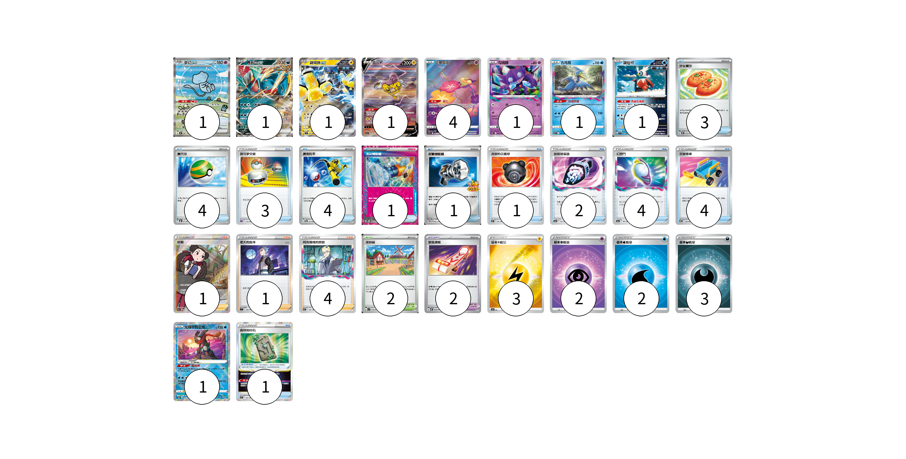 牌組構築方案 以此牌組為基礎新構築牌組 顯示卡面 顯示列表 寶可夢卡(12) 1 1 1 1 4 1 1 1 1 寶可夢道具(3) 2 1 物品卡(27) 3 4 3 4 1 1 1 2 4 4 支援者卡(6) 1 1 4 競技場卡(2) 2 能量卡(10) 3 2 2 3 寶可夢卡(12) 卡牌名稱 張數 卡牌名稱 張數 夢幻ex SV4a 347/190 01 轟鳴月ex SV4K 054/066 01 鐵臂膀ex SV4M 027/066 01 雷公V S12a 218/172 01 花療環環 S12a 187/172 04 勾魂眼 S11 044/100 01 古月鳥 S11 033/100 01 鐵包袱 SV4M 020/066 01 光輝甲賀忍蛙 S12a 033/172 01 寶可夢道具(3) 卡牌名稱 張數 卡牌名稱 張數 緊急滑板 SV5K 064/071 02 森林封印石 S12 092/098 01 物品卡(27) 卡牌名稱 張數 卡牌名稱 張數 好友寶芬 SV5K 063/071 03 巢穴球 SVHK 012/022 04 寶可夢交替 SDM 016/022 03 厲害釣竿 SVEM 011/020 04 頂尖捕捉器 SV5M 062/071 01 反擊捕捉器 SV-P 083/SV-P 01 洗翠的沉重球 S10P 062/067 01 放逐吸塵器 S12a 144/172 02 幻想門 S12a 141/172 04 交替推車 S10D 060/067 04 支援者卡(6) 卡牌名稱 張數 卡牌名稱 張數 杜娟 S12a 242/172 01 老大的指令(赤日) SI 406/414 01 阿克羅瑪的實驗 S11 095/100 04 競技場卡(2) 卡牌名稱 張數 卡牌名稱 張數 深缽鎮 SV1a 070/073 02 能量卡(10) 卡牌名稱 張數 卡牌名稱 張數 基本【雷】能量 SO LIG 03 基本【超】能量 SI PSY 02 基本【水】能量 SI WAT 02 基本【惡】能量 SI DAR 03 以此牌組為基礎新構築牌組 牌組編碼 txtVGM-mYpHRS-eTzSUi copy 列印牌組單 牌組編碼已複製 分享至SNS